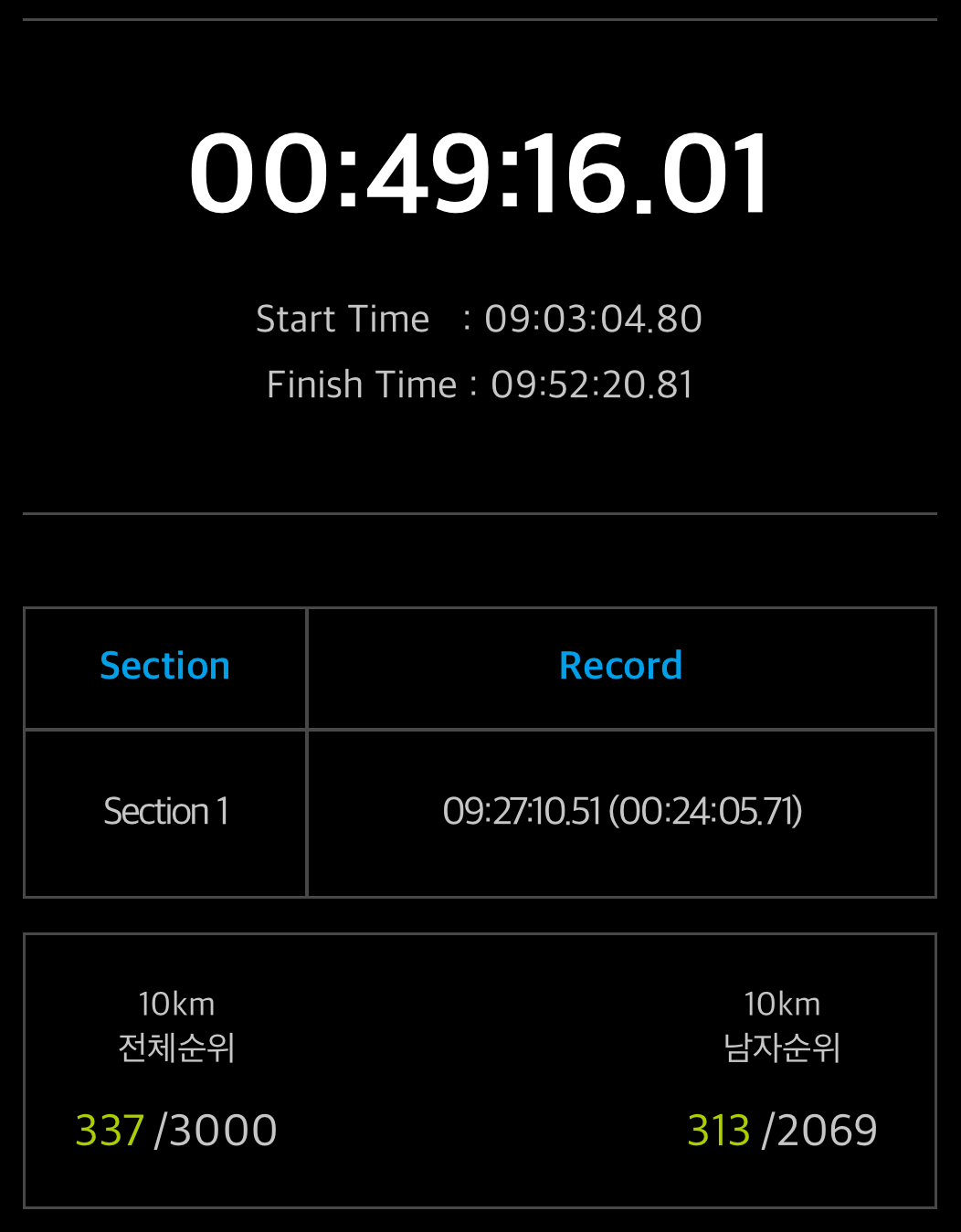 몸과 마음이 엄청난 갈등을 하면서 2km를 더 갔다. 1km 정도를 남기고 이제는 죽을 것 같았다. 다시 평화의 공원으로 들어가는 오르막길 한 100-200m에서는 이제 그만 멈추고 싶었다. 그때 옆에 지나가는 분이 스스로에게 '파이팅! 할 수 있다!'를 외치며 가셔서, 그걸 의지 삼아 나도 더 갈 수 있었다. 속도가 확연히 느려졌지만, 페이스를 보니 조금만 힘내서 가면 50분 안으로 들어갈 수 있을 것 같았다. 마지막 평지 구간이 나왔고, 멀리서 피니시 라인으로 착각했던 지점을 지나 진짜 피니시 라인에 도달했다. 그 즉시 문자가 왔다. 완주를 축하합니다. 49분 16초. 5:30 페이스로 55분 목표를 잡았는데, 뛰어보니 얼떨결에 53분, 52분까지 줄일 수 있을 것 같았고, 마지막에는 50분 언더로 들어왔다. 4:56 페이스였다. 물 한 모금 마시지 않고 달렸다보니, 도착해서 잠깐 쉬는데 목에서 피가 넘어가는 느낌이었다.