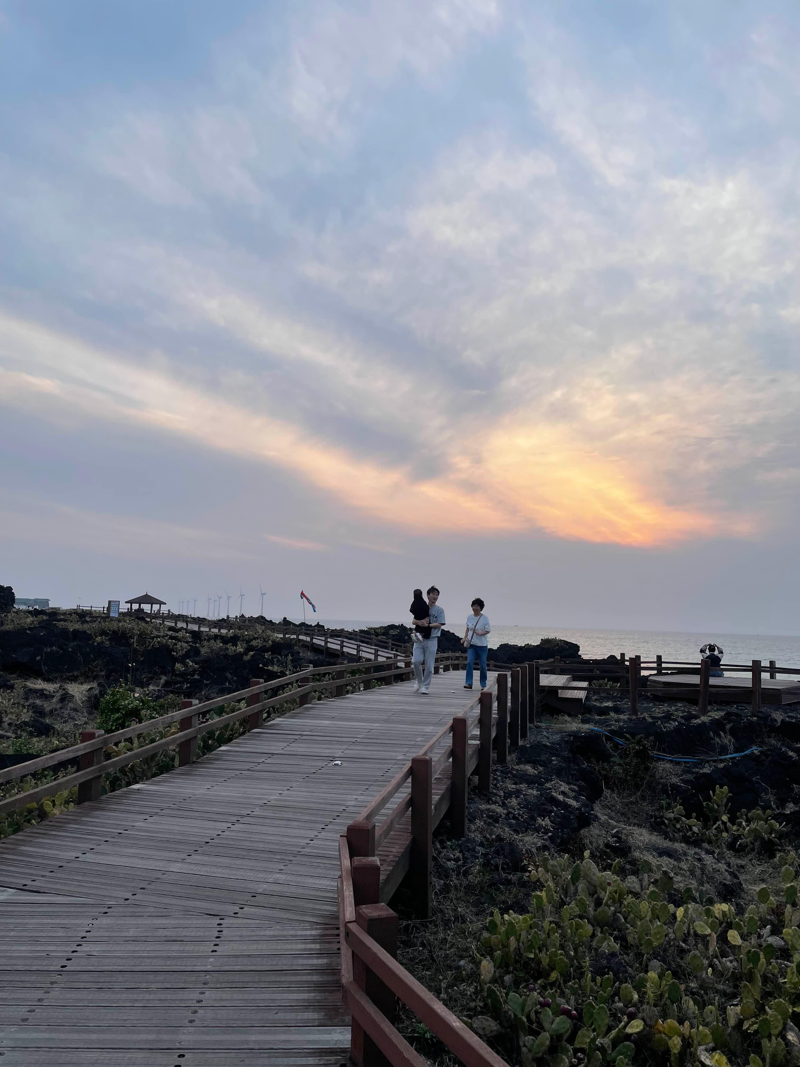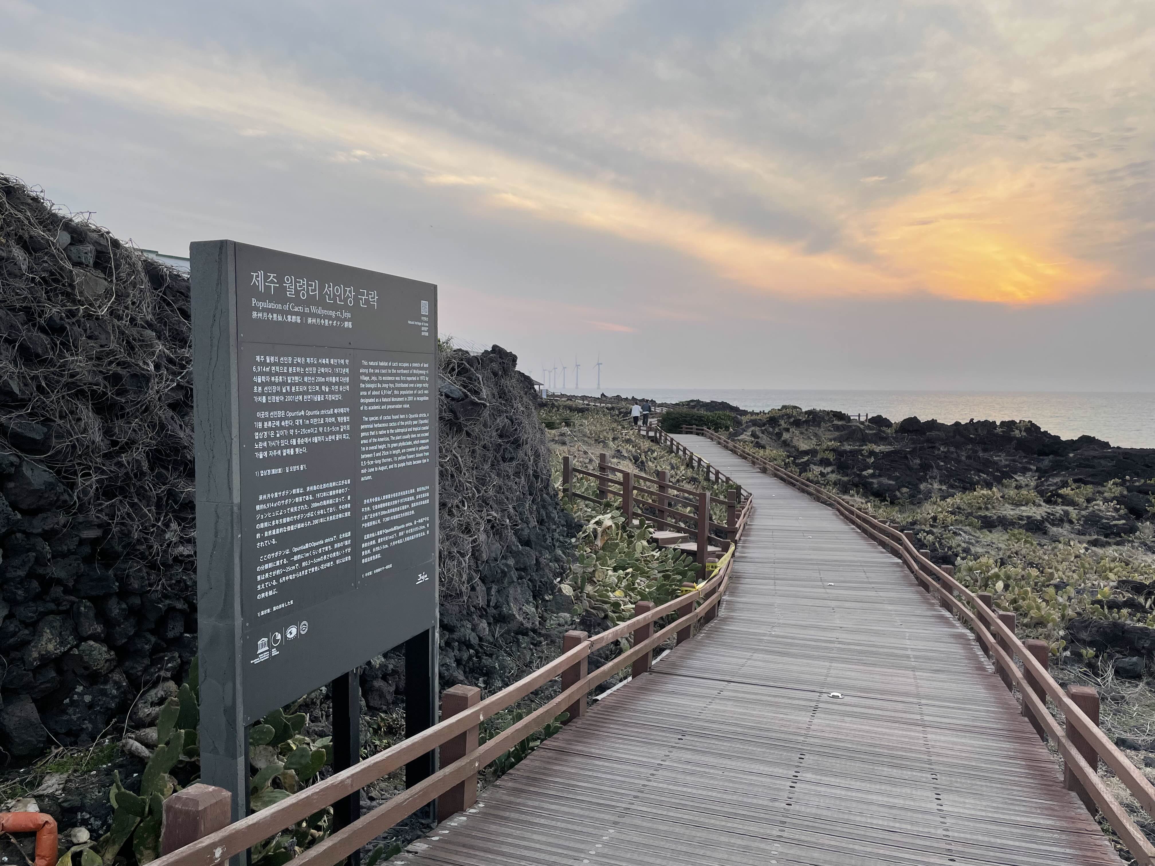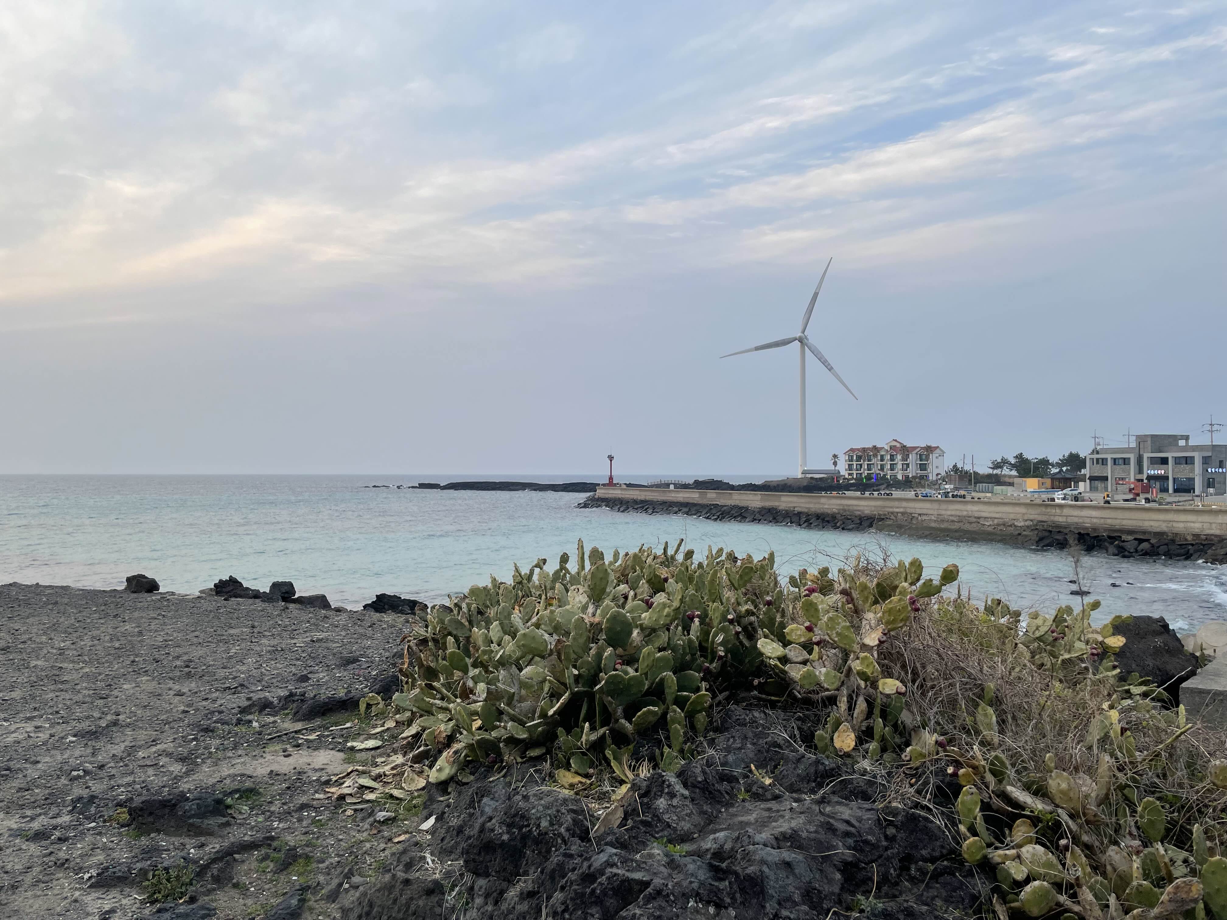 첫 끼를 먹고 가볍게 주변을 둘러보자 싶어 근처에 있는 월령 선인장 군락에 갔다. 일몰과 저 멀리 풍차와 현무암, 그리고 오밀조밀한 선인장들을 마주했는데 생각보다 너무 평온해졌다. 바람만 좀 덜 불었으면 좀 더 걸었을 것 같은데 아기들이 이 바람을 맞으면 100% 감기에 걸릴 것 같아서 슬쩍 맛만 보고 나왔다. 정말 나중에 우리 부부가 늙어서 둘이 다시 여행을 온다면 손잡고 걷고싶은 곳이었다.