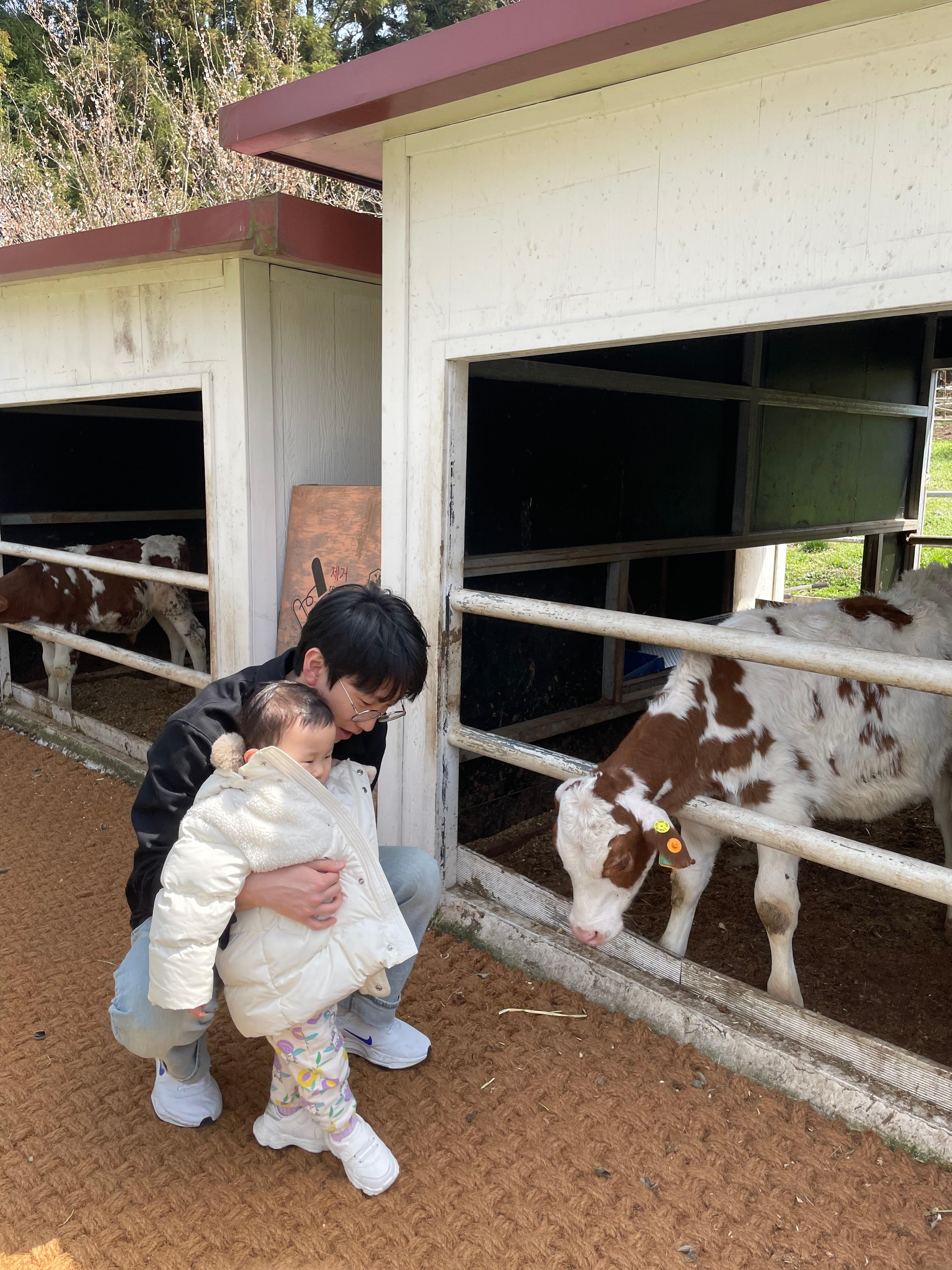 그렇게해서 가게 된 '아침미소목장'. 바로 입장권을 끊을 줄 알았는데, 카페 건물만 있고 그외 곳들은 전부 그냥 무료로 입장하게 되어있었다. 들어가자마자 우리를 맞이해주는 젖소들에게 우유주기를 할 수 있는데 대신 우유를 따로 구매해야한다. 우리는 그냥 구경만 하고 더 안으로 들어갔다.