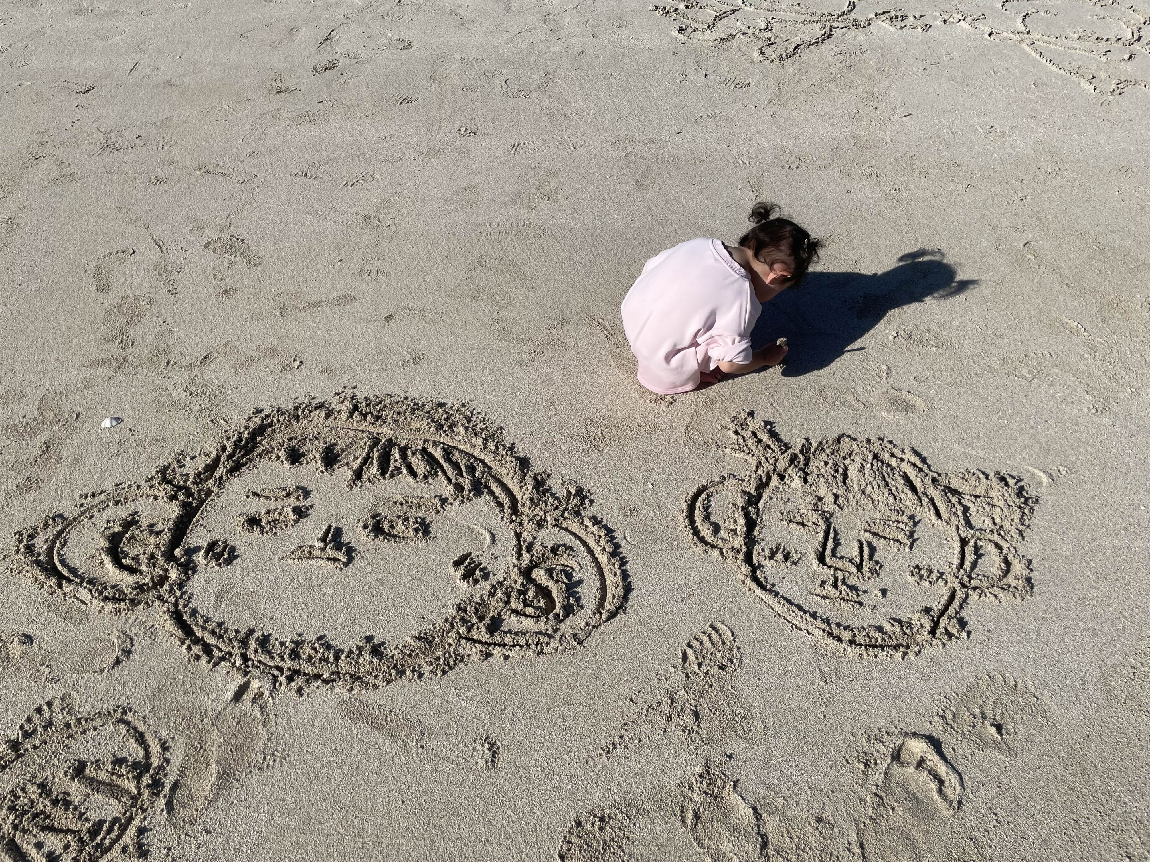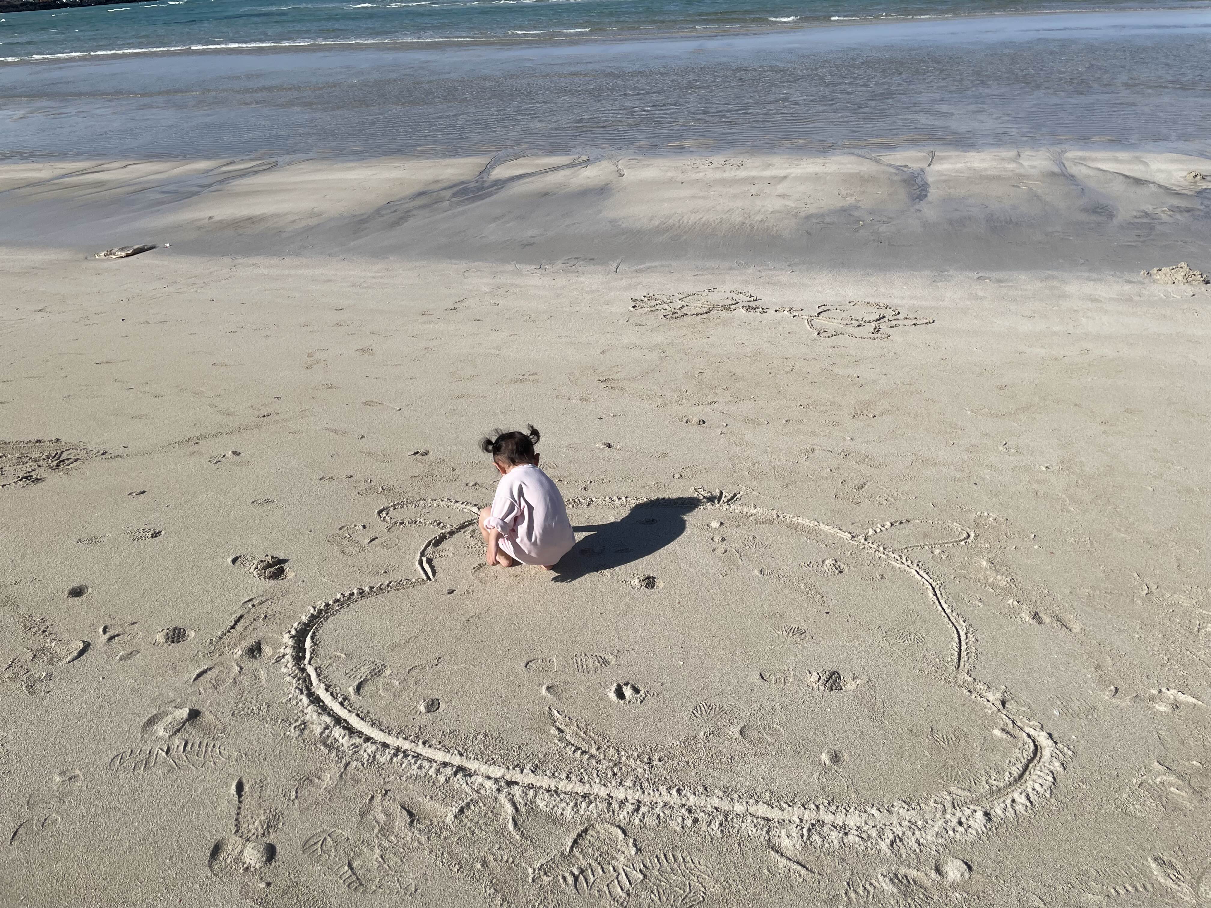 아이랑 발자국 남기기, 그림 그리기, 물에 발 담그고 발 사라지게 만들기 등등 충분히 놀다가 갑자기 쉬마렵다그래서 다시 숙소에 들렀다 오기로 했다. 아이는 아쉬운지 '엄마 화장실 갔다가 여기 다시와요!' 하고 두번 세번을 말했다. 우리는 화장실에 갔다가 약속대로 다시 나왔다. 그리고 바닷속에서 옆으로 기어가는 소라게도 만나고 민달팽이같이 생긴 바다 민달팽이(?)도 만났다.