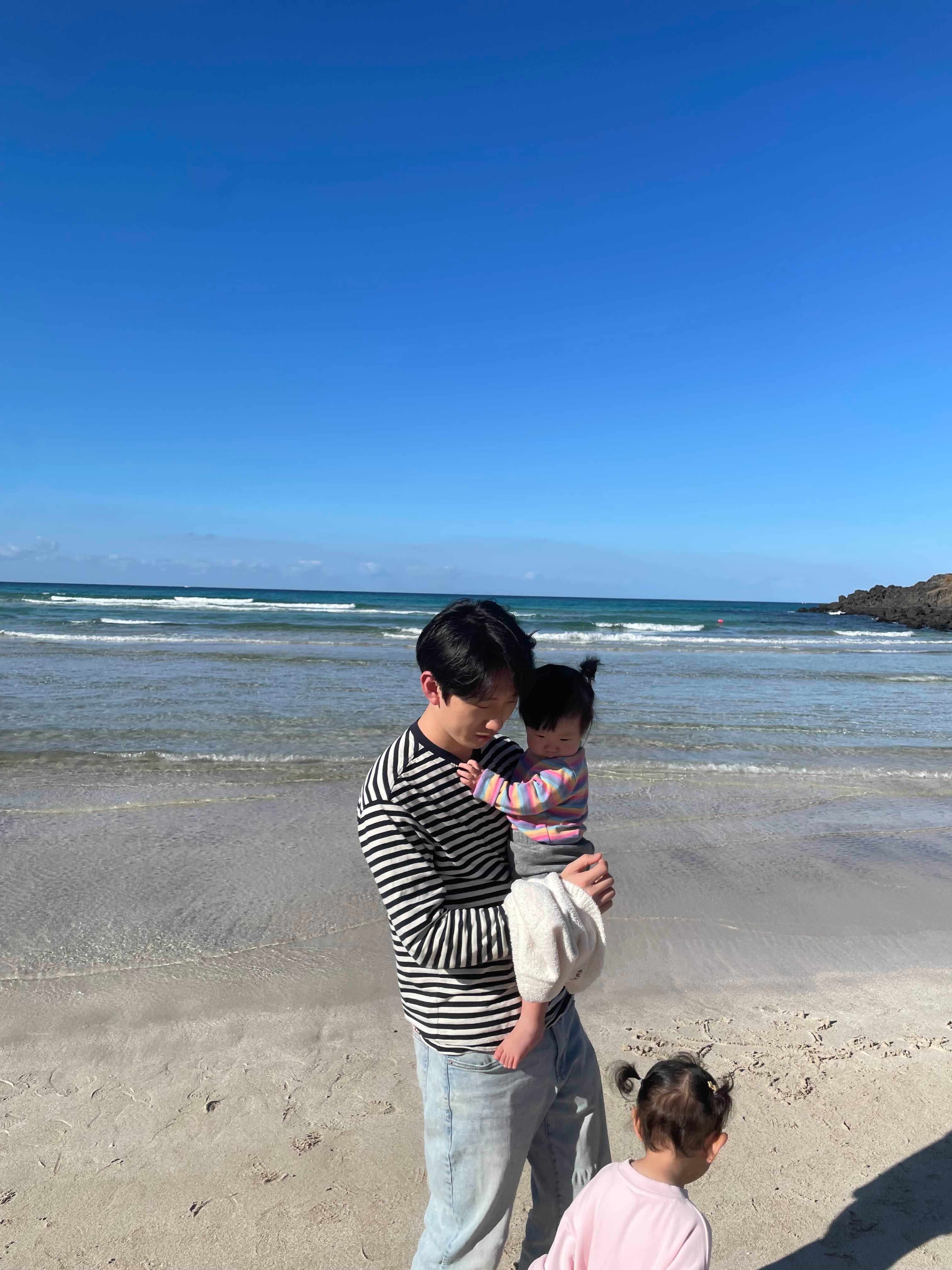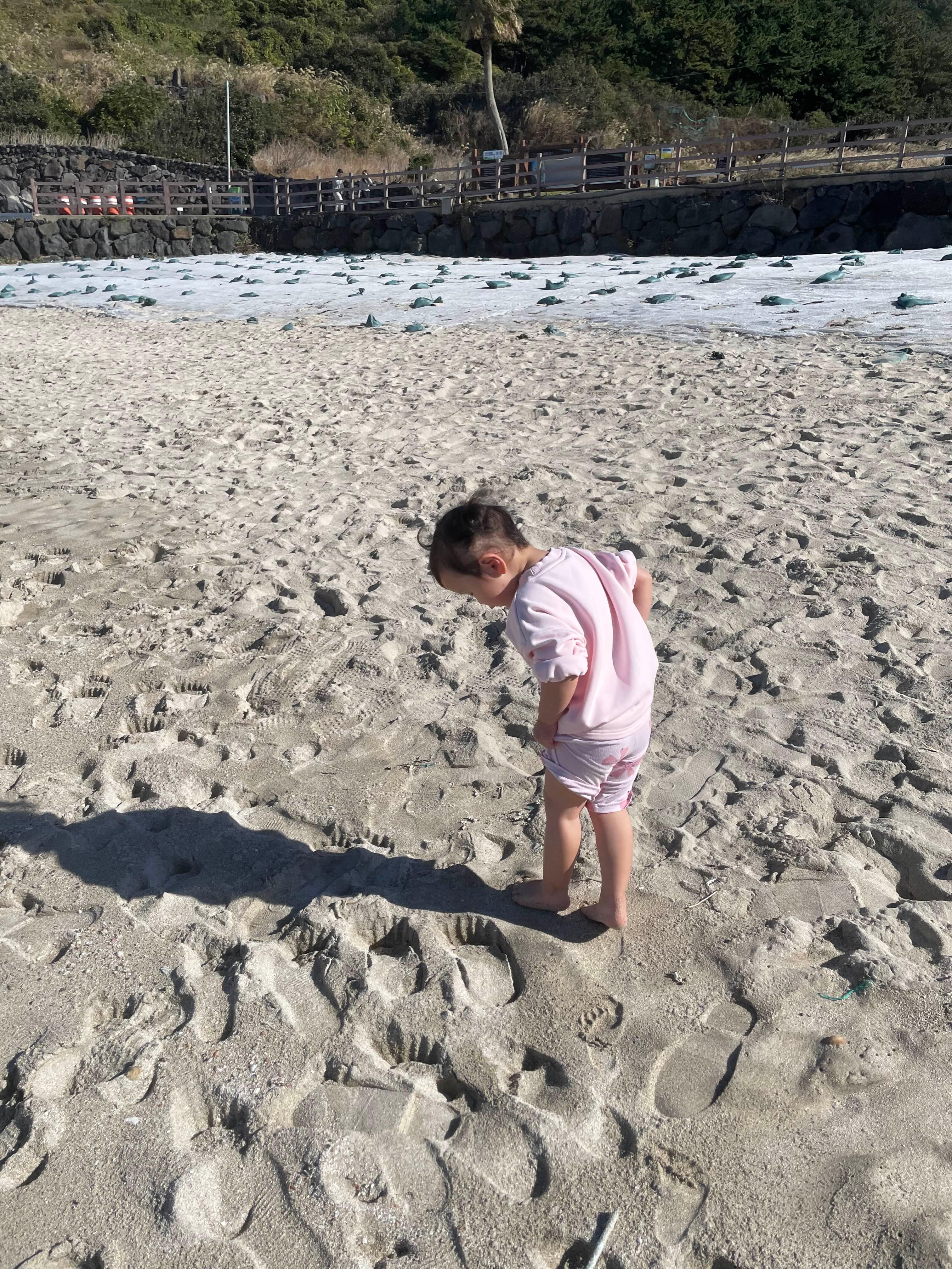 감귤따기 체험을 마치고 둘찌는 완전 곯아떨어져서 숙소에서 낮잠을 자는동안 나는 첫찌와 함덕해수욕장으로 나갔다. 역시 오늘도 바람 한점 불지않아 바닷가인데도 춥지가 않았고 나는 또 반팔을 입었다. 아이는 적실만한 바지가 없어서 잠옷을 입고 출동! 집앞 메리트라 좋구만 🤣