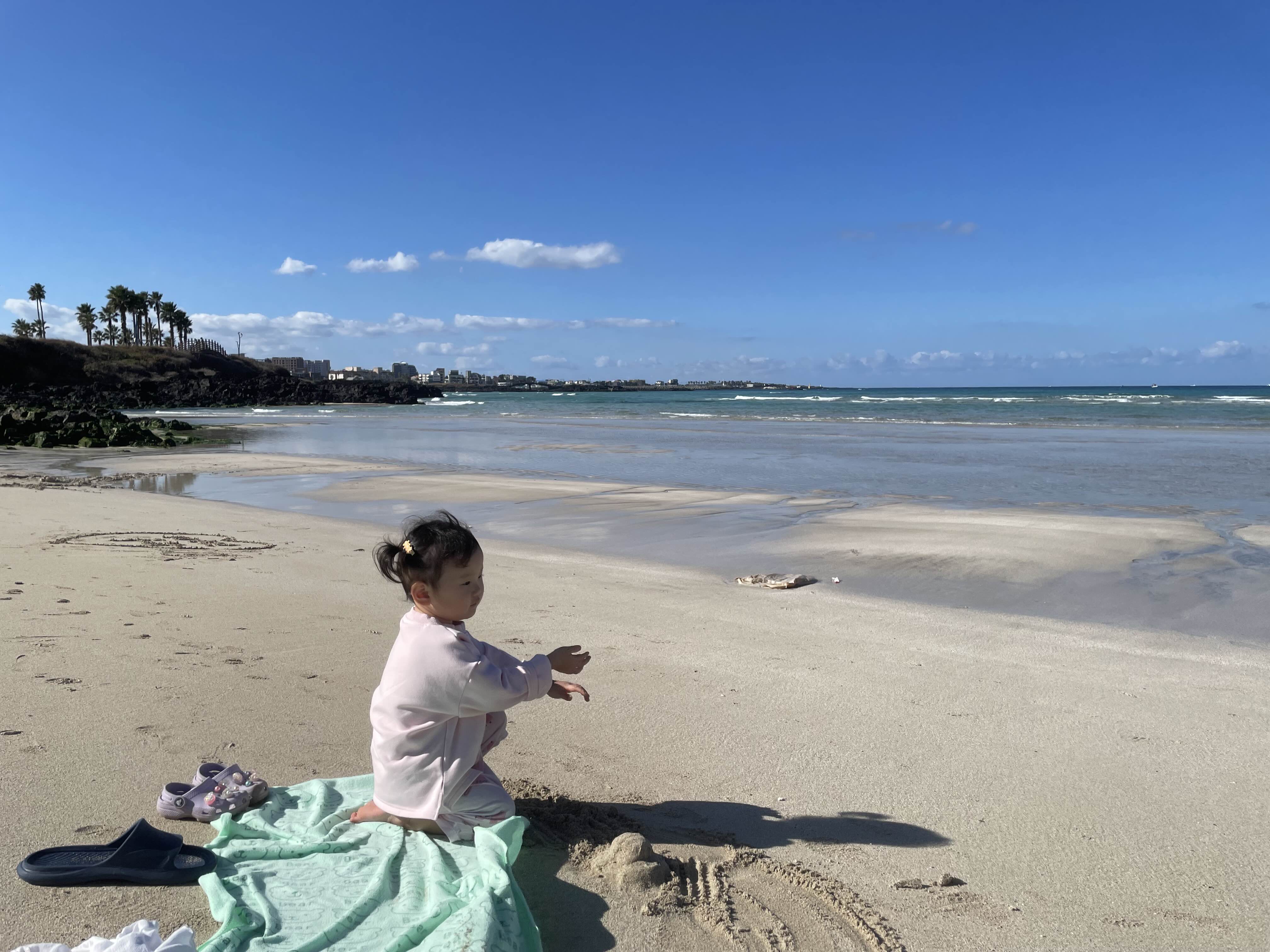 감귤따기 체험을 마치고 둘찌는 완전 곯아떨어져서 숙소에서 낮잠을 자는동안 나는 첫찌와 함덕해수욕장으로 나갔다. 역시 오늘도 바람 한점 불지않아 바닷가인데도 춥지가 않았고 나는 또 반팔을 입었다. 아이는 적실만한 바지가 없어서 잠옷을 입고 출동! 집앞 메리트라 좋구만 🤣