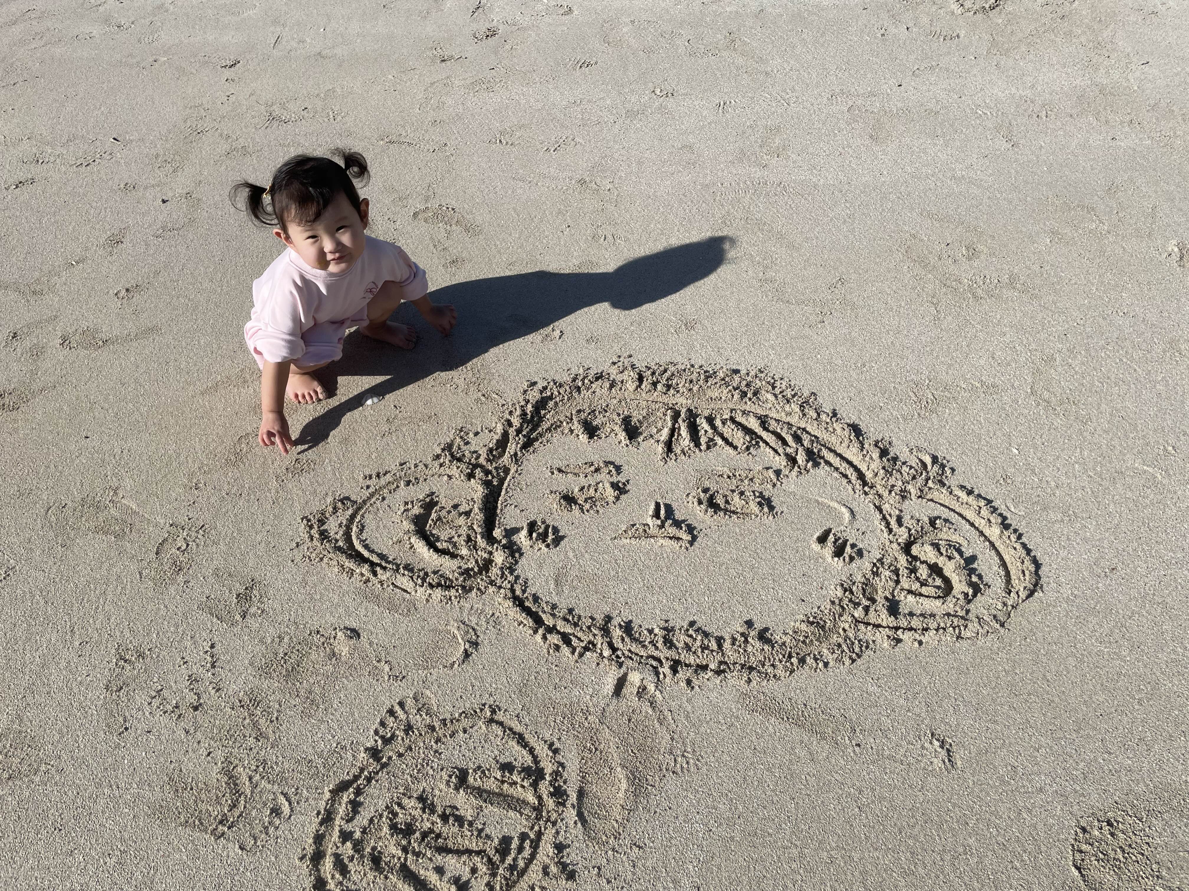 아이랑 발자국 남기기, 그림 그리기, 물에 발 담그고 발 사라지게 만들기 등등 충분히 놀다가 갑자기 쉬마렵다그래서 다시 숙소에 들렀다 오기로 했다. 아이는 아쉬운지 '엄마 화장실 갔다가 여기 다시와요!' 하고 두번 세번을 말했다. 우리는 화장실에 갔다가 약속대로 다시 나왔다. 그리고 바닷속에서 옆으로 기어가는 소라게도 만나고 민달팽이같이 생긴 바다 민달팽이(?)도 만났다.