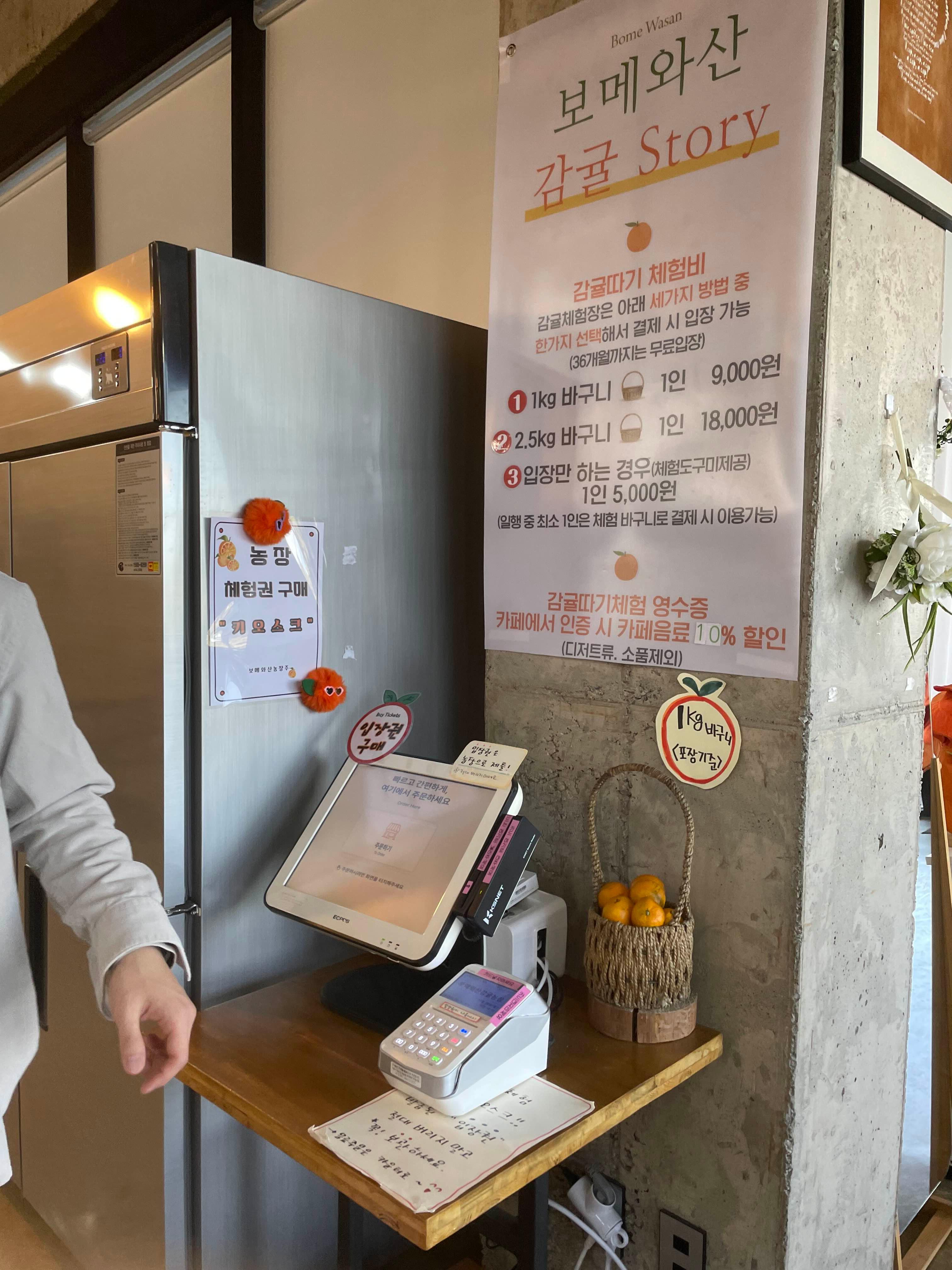 도착 후 카페안에 마련되어있는 키오스크에서 입장권을 구매했다. 36개월 미만은 무료입장이고 그 이상은 구매해서 이용하는 것인데 약간의 양심 결제 같은 느낌으로 마련 되어있다. 키오스크 앞에 가격표와 1kg의 바구니 샘플이 있었다. 남편은 여기 오기 전에 귤 따서 못들고 갈 정도면 택배 보내자 했지만 그럴 염려가 전혀 없게 작은 사이즈였다. 그정도라면 귤 귀신 둘찌가 하루만에 다 먹을 수도 있을 정도였다.