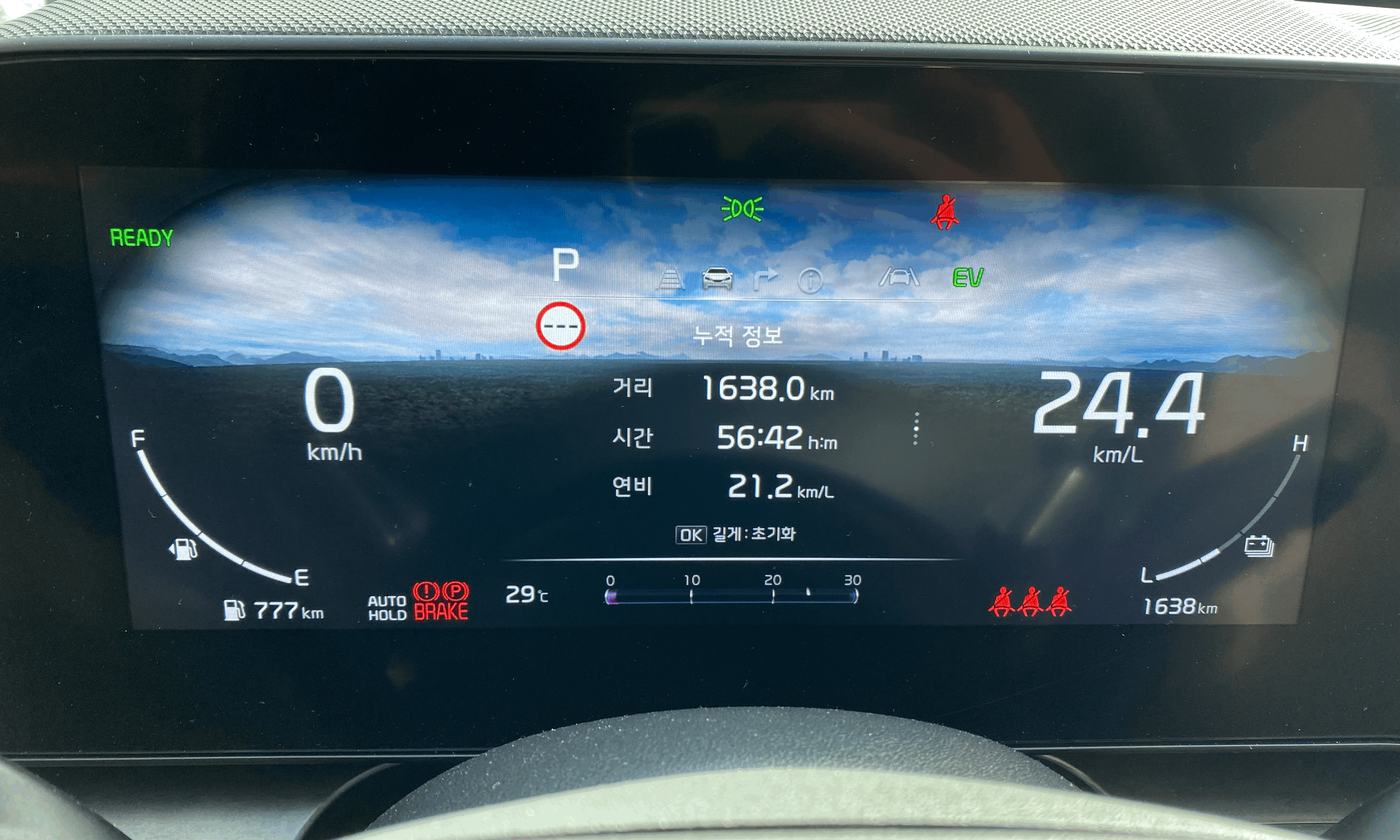 내 차는 스타일 옵션을 추가하여, 18인치 휠을 장착했다. 휠 사이즈가 커지면 연비가 떨어진다 하여 조금 고민하였으나, 그래도 편의 기능이 더 중요하다 생각하여 옵션을 추가했다. 18인치의 경우 공인연비가 복합 18.8km/L라고 한다. 기름을 가득 주유하면, 주행 가능 거리가 880km 정도로 나온다. 연료 용량이 42L 인 것으로 보아, 연비는 21km/L 정도로 계산된다. 실제 지금까지의 누적 연비를 보더라도 21.2km/L로 딱 계산한 정도가 나온다. 보통은 20% 정도 남았을 때, 즉 주행 가능 거리가 180km 정도로 나올 때 가득 주유를 한다. 그렇게 되면 휘발유 주유량이 34~37L 정도가 되는데, 요즘 기름값이 비싸다 보니 6만 8천 원 정도 나온다.