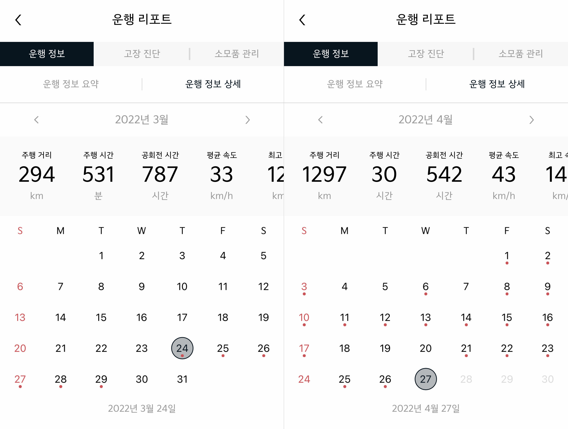 인식이 바뀌어서 그런지, 전에 가보고 싶었지만 못 갔던 곳들을 많이 다녔다. 처음 차를 받을 때는, "아, 괜히 샀나" 싶으면서 1년에 10,000km나 탈 수 있을지 고민했다. 하지만, 한 달 지나고 보니 거진 매일 조금씩은 차를 움직였다. 마트에만 다녀온 날도 있는가 하면, 한 밤에 별 보러 간다고 가평까지 왕복 160km를 다녀온 적도 있었다. 결혼 2주년 기념으로 강릉에도 다녀오고, 화담숲도 가고, 처형네 집도 놀러 가고, 한강도 다녀왔다. 그 결과 한 달 지났는데, 1600km를 탔다. 이대로라면 1년에 2만 km도 바라볼만하다. 하반기에 아기가 태어나고 나면 더더욱 차로 다닐 일이 많을 테니까 말이다.