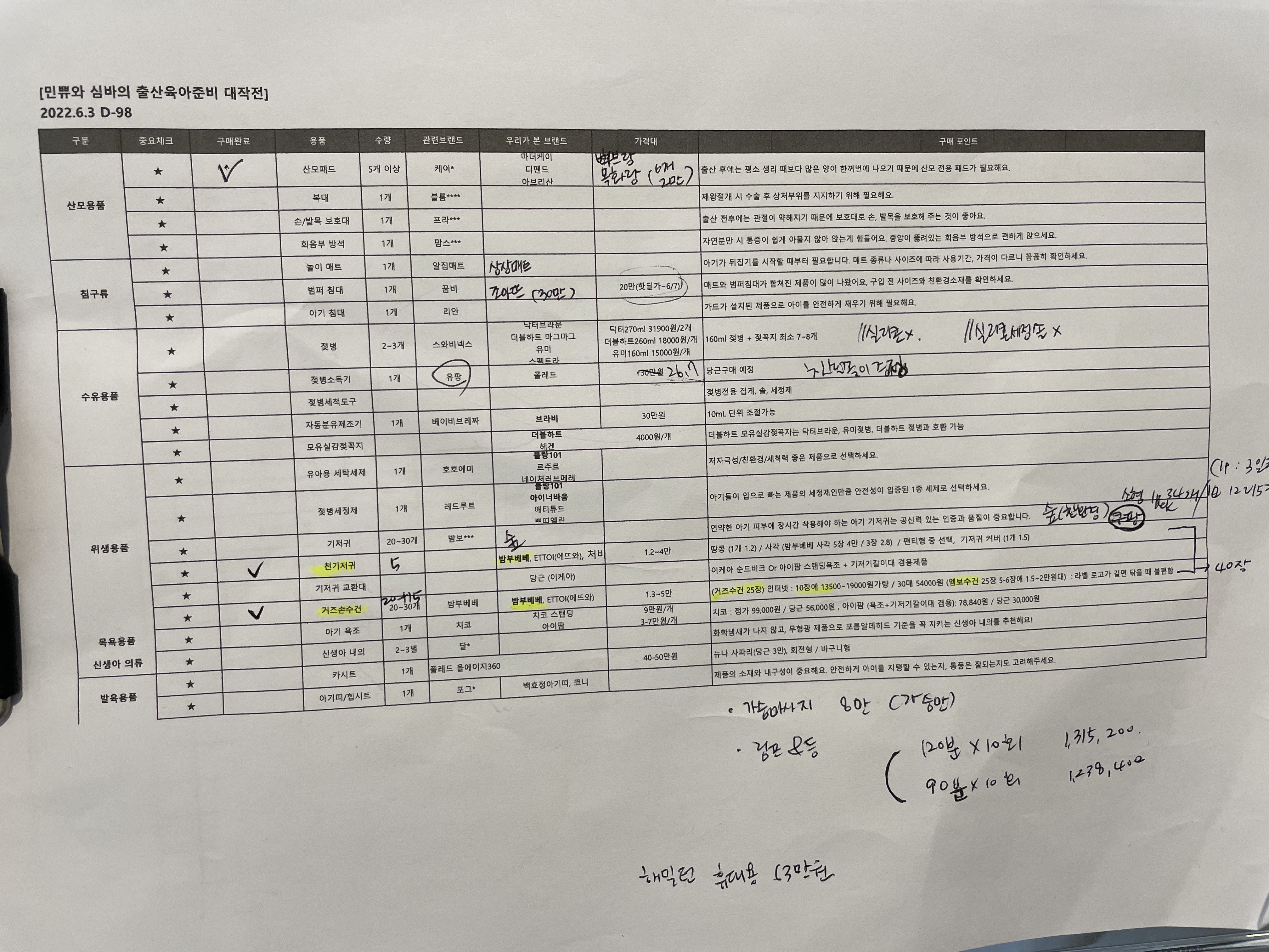 페어에 가기 전에 맘 카페에서 나눠 준 구매용품 리스트를 기반으로 우리가 더 기재해야 할 항목을 추가해서
