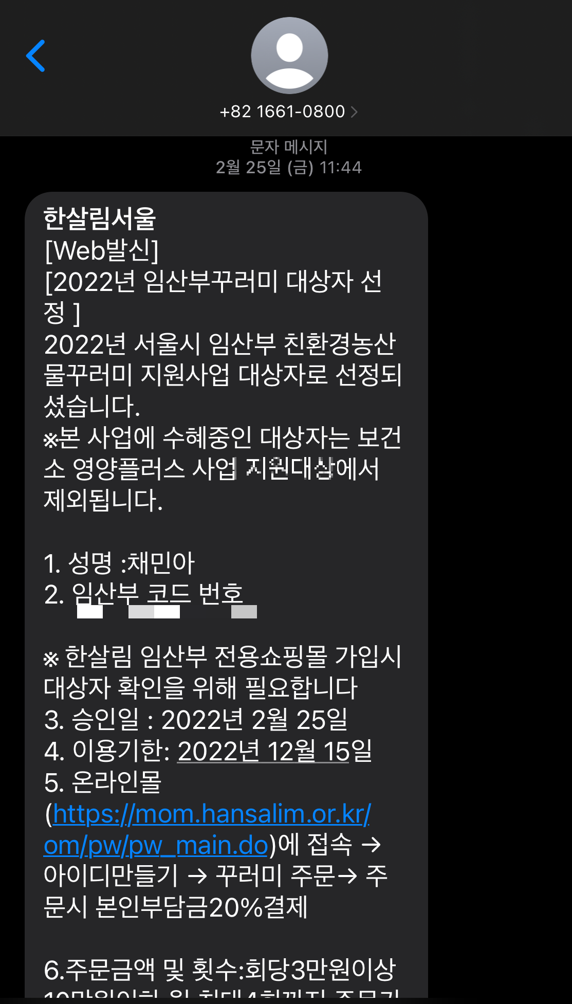 2022년 임산부 농산물 꾸러미 지원 대상자로 선정되었다는 것이다.