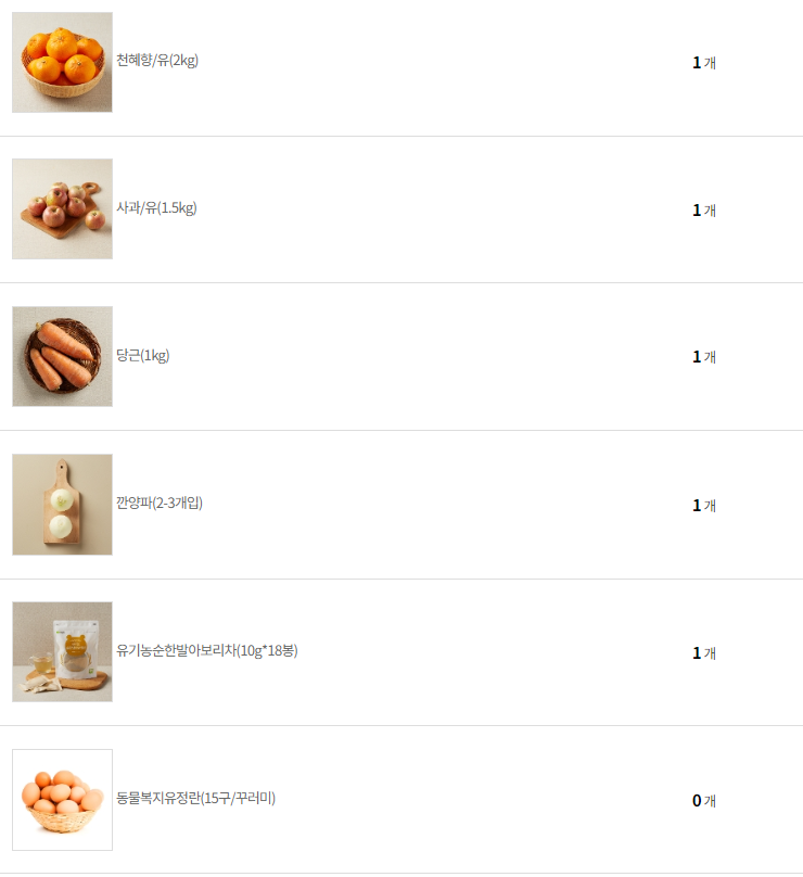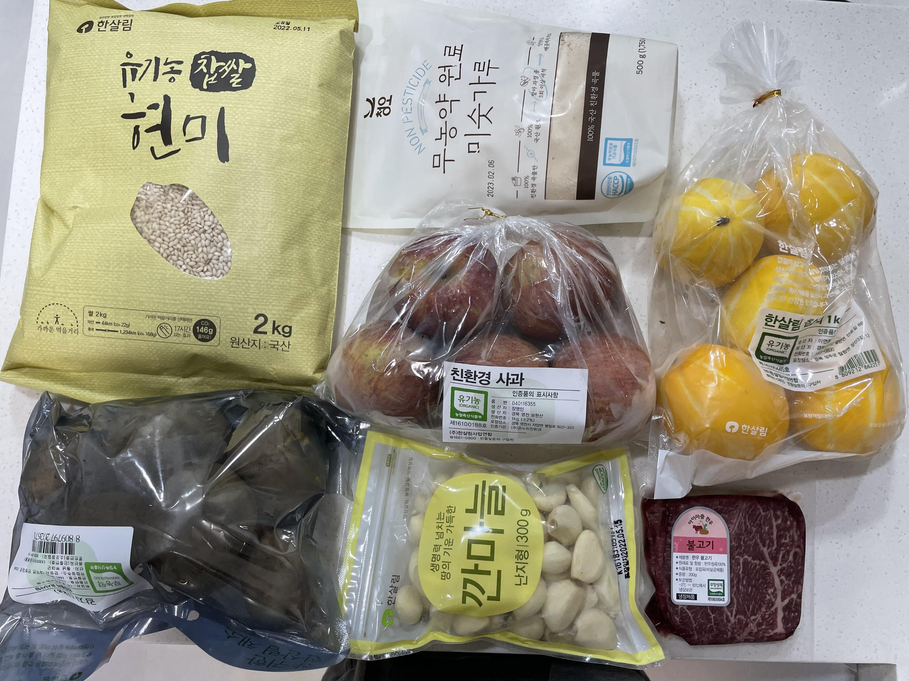 처음 주문은 3/13 임신 14주쯤이었고, 심한 입덧은 끝났지만 여전히 속이 니글니글 거리고 귤, 오렌지, 천혜향류가 당겼던 때에 마침 주문이 가능해서 시켰고, 그 외에 곧 냉장고에 재고가 떨어질 것들 위주로 주문을 했다.