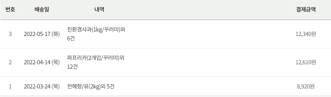 그리고 세 번째까지 주문을 해보니 야채, 쌈채소 등의 자잘한 농산물보다는 과일을 주문하는 게 좋은 것 같다고 생각했다.