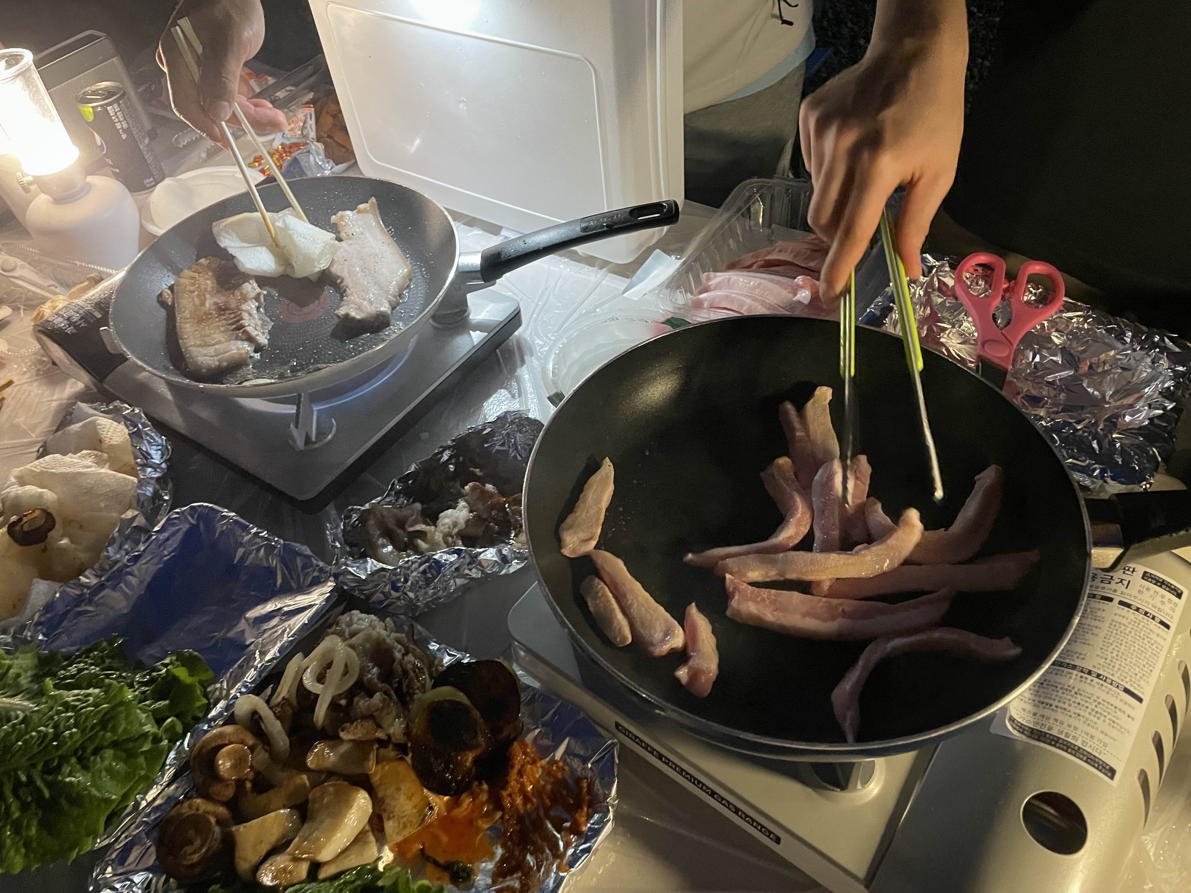 장작 위에 석쇠에서 굽는 건 아니고 그냥 부르스타와 프라이팬에 구워 먹는 우리식 바비큐 파티가 시작되었다..!!!