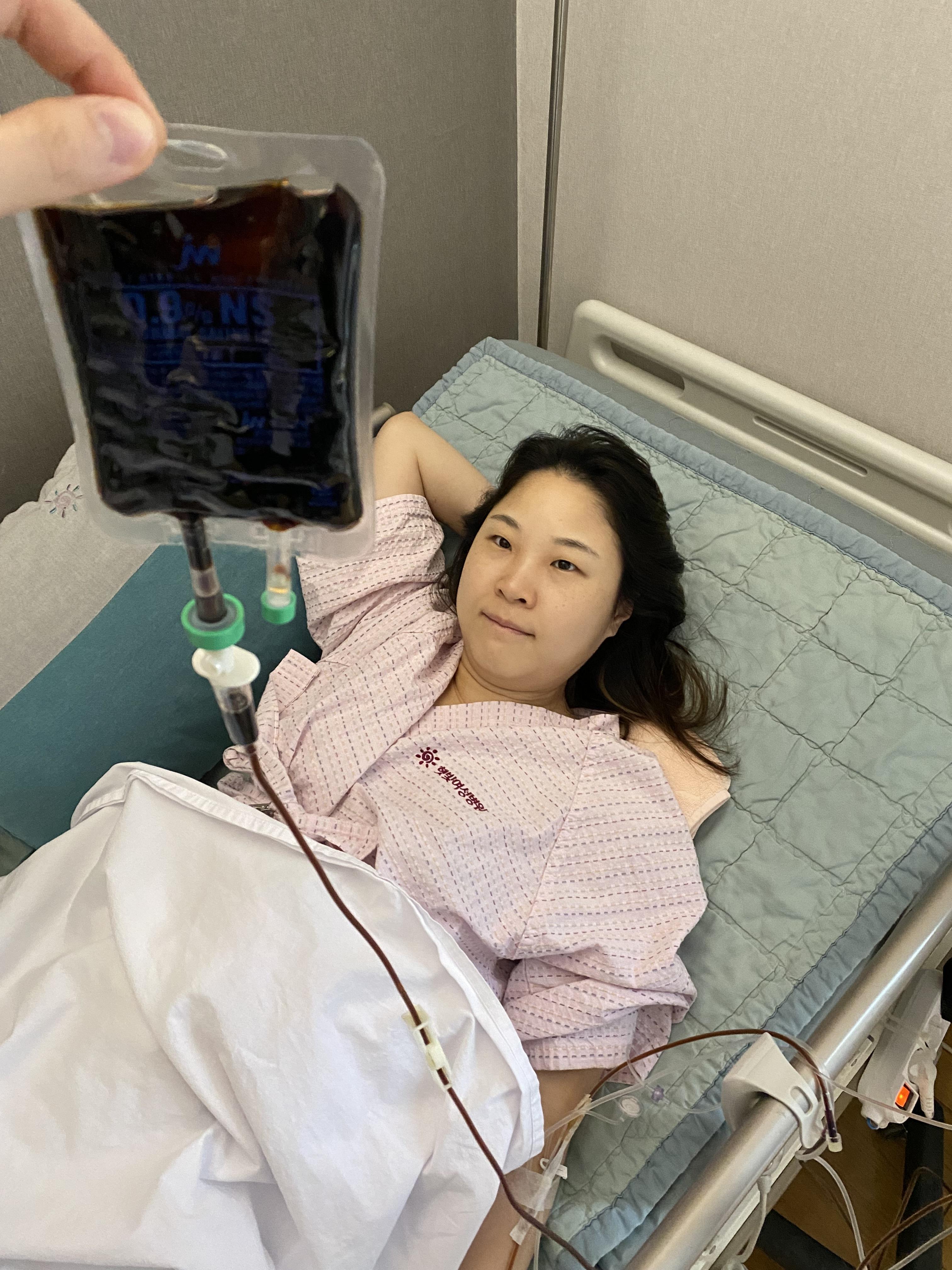 아무튼 그래서 나는 피처럼 생긴 빨간 철분주사 팩을 하나 더 달게 되었다.