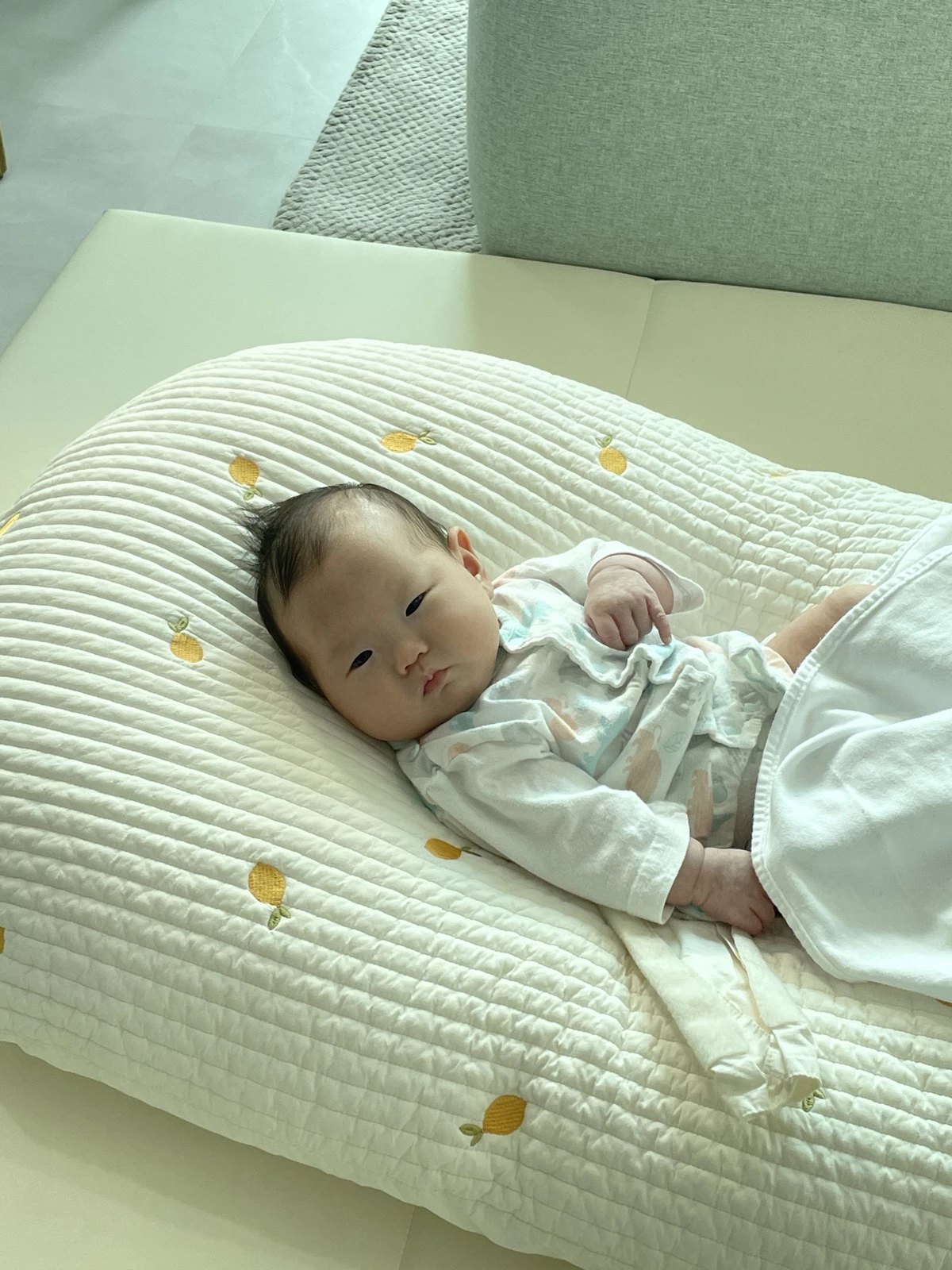 이솜이 점심을 먹인 후 시간이 1시간 쯤 지났을 때 터미타임을 했는데 잘 하는 것 같길래 이솜이 등 뒤에서 튤립장난감으로 노래를 틀어주고 있었는데 얼굴을 보려고 앞으로 가보니 조금 개워내고 있었다.