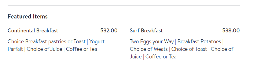 자리를 안내받은 뒤 음식을 주문하려고 하는데 나는 뭔가 미국식 아침식사, 그러니까 말 그대로 '아메리칸 브랙퍼스트'를 먹고 싶었다. 그래서 스크램블드에그, 베이컨, 빵이 있는 Surf Breakfast를 시켰고 남편은 요거트가 있는 Continental breakfast를 시켰다.