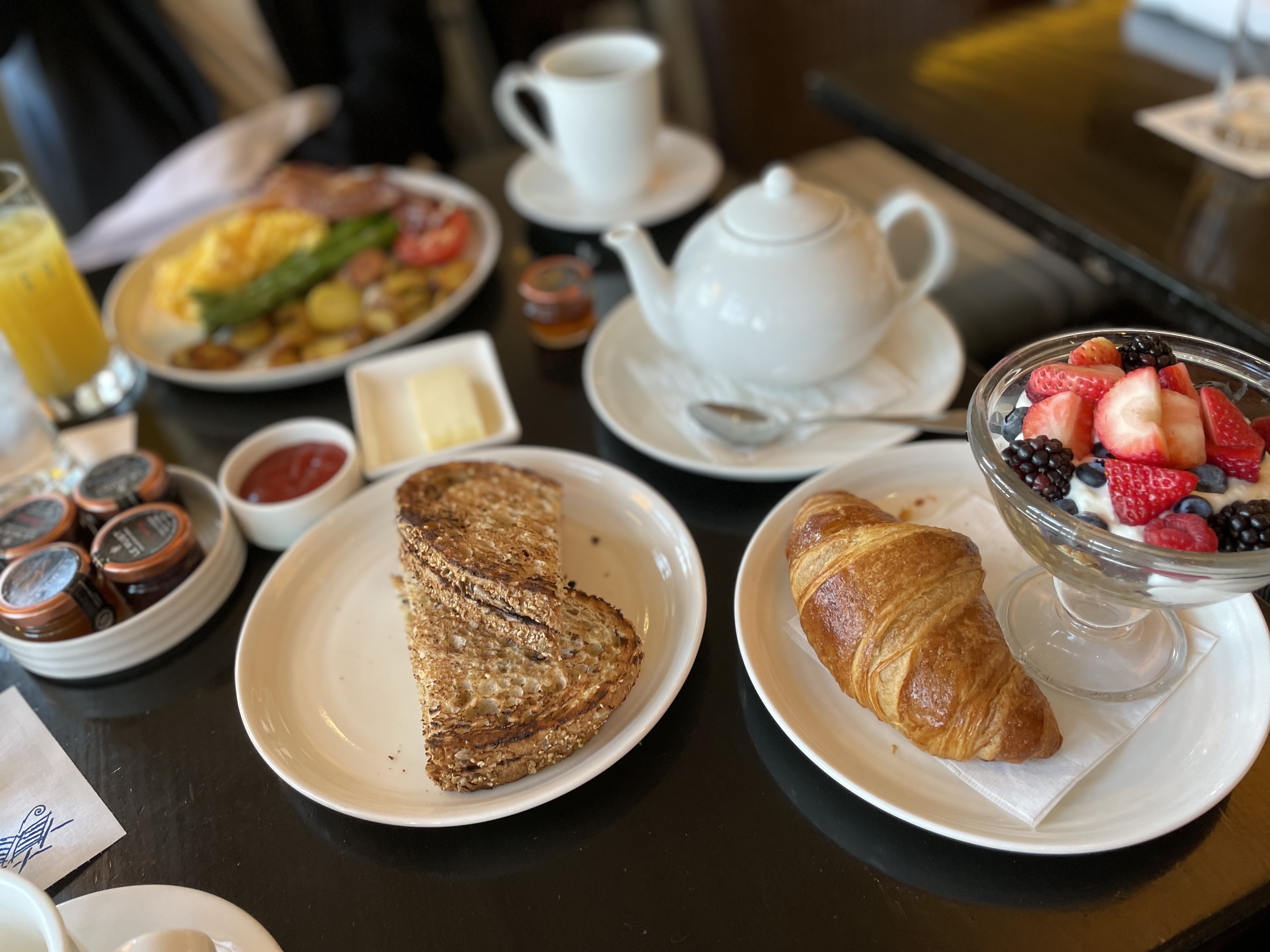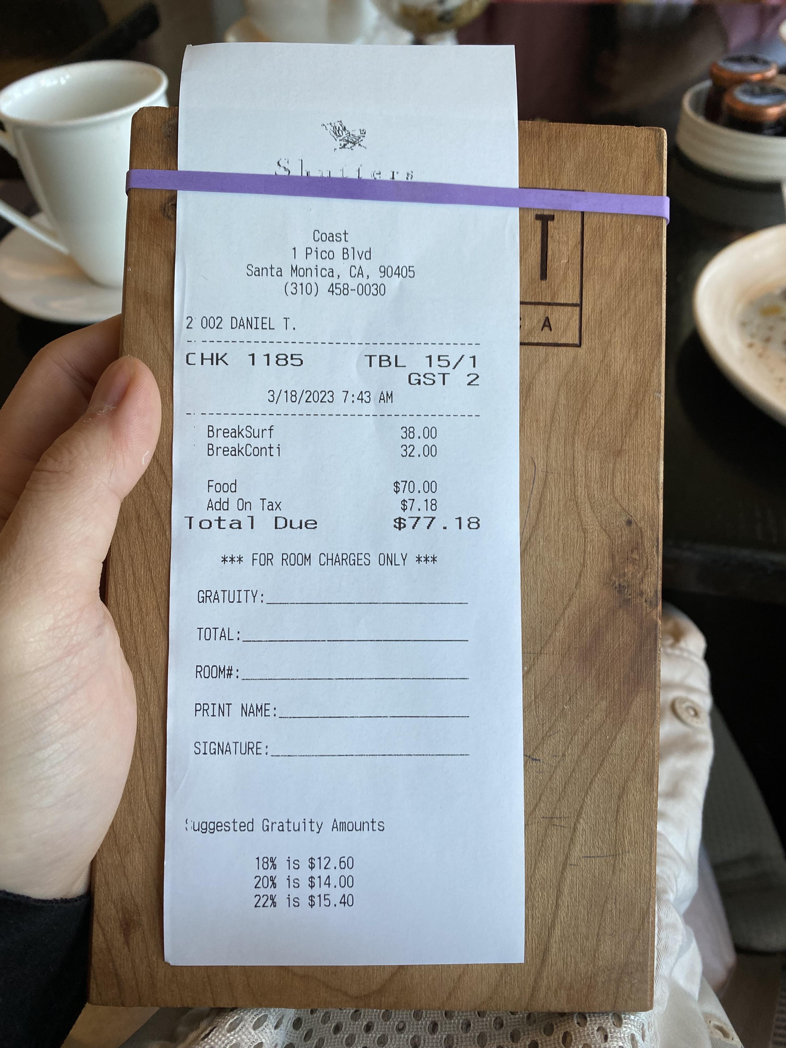 자리를 안내받은 뒤 음식을 주문하려고 하는데 나는 뭔가 미국식 아침식사, 그러니까 말 그대로 '아메리칸 브랙퍼스트'를 먹고 싶었다. 그래서 스크램블드에그, 베이컨, 빵이 있는 Surf Breakfast를 시켰고 남편은 요거트가 있는 Continental breakfast를 시켰다.