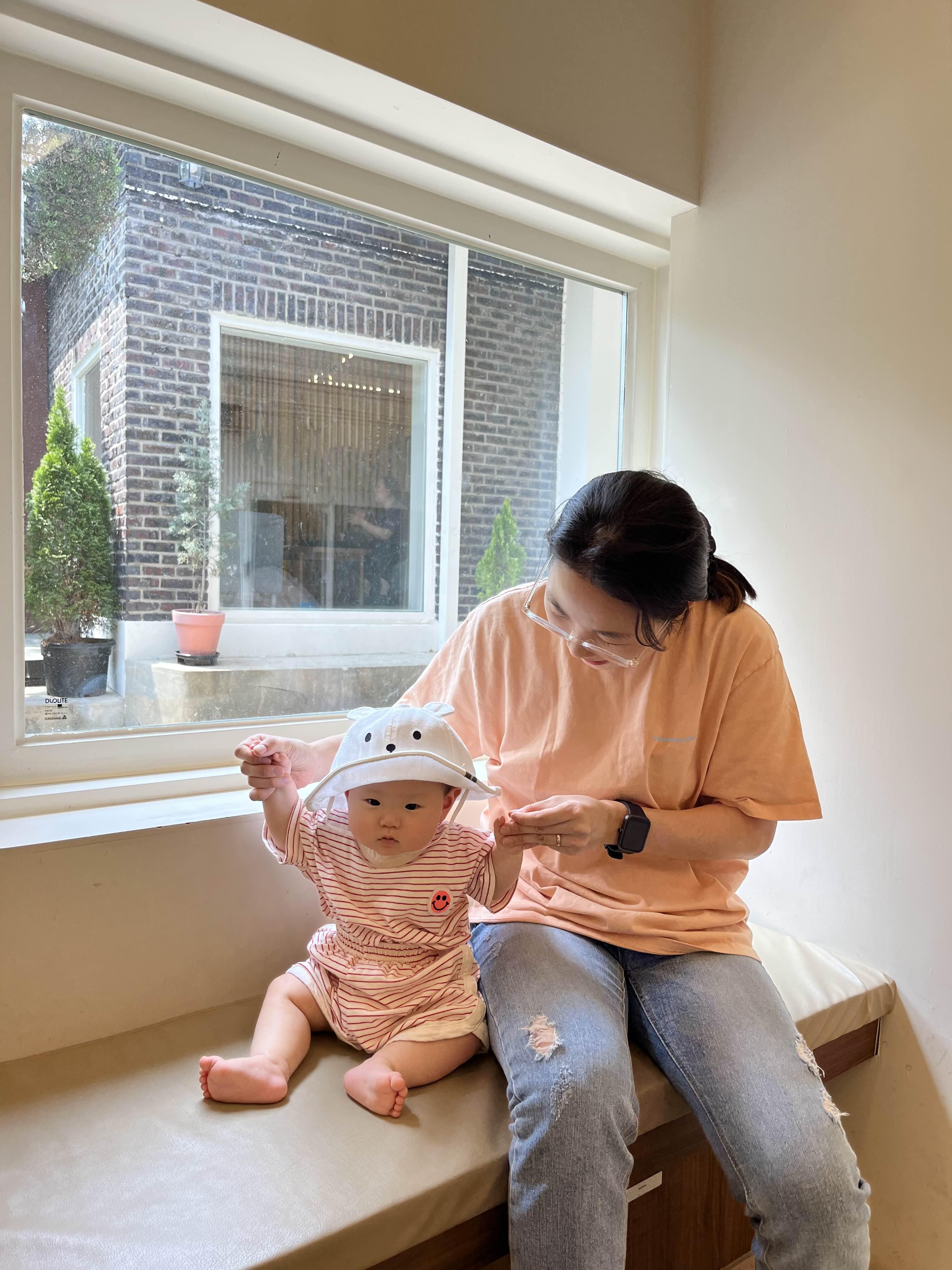 시원하게 나있는 큰 창 앞에서 우리 아기 사진도 찍어주다보니 음료와 음식이 금방 나왔다.