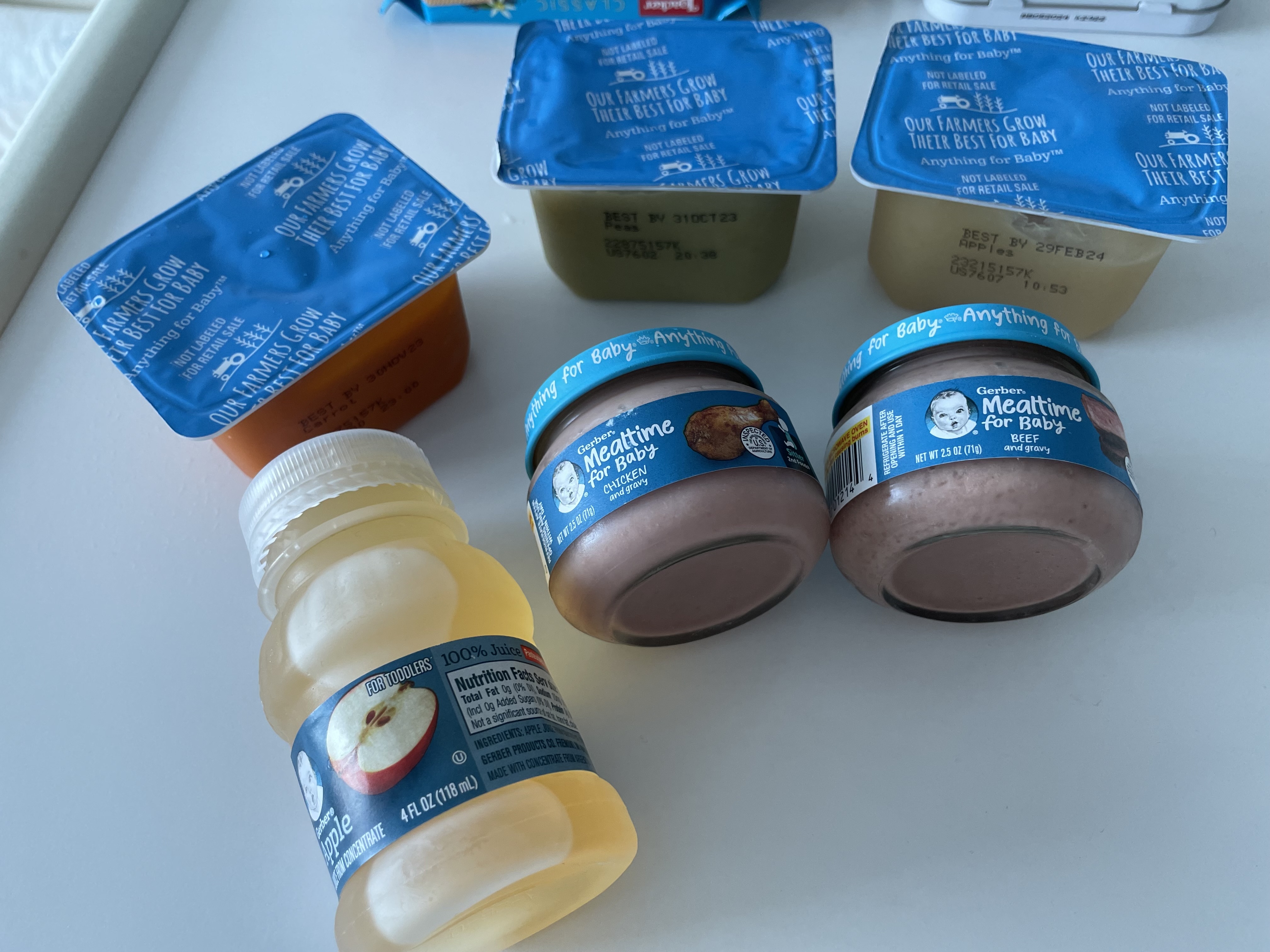 한국에 돌아오는 편 이유식 메인디쉬는 거버 (Gerber) 제품이었고 퓌레종류는 어디 건지 잘 모르겠다. 항공사에 납품하는 업체인 듯싶다. 이 역시 기내에서는 하나도 먹여보지 못하고 한국 와서 먹여보려 했으나 아기가 인상을 쓰고 고개를 돌리기에 전부 버렸던 것 같다. 아까운 이유식들..