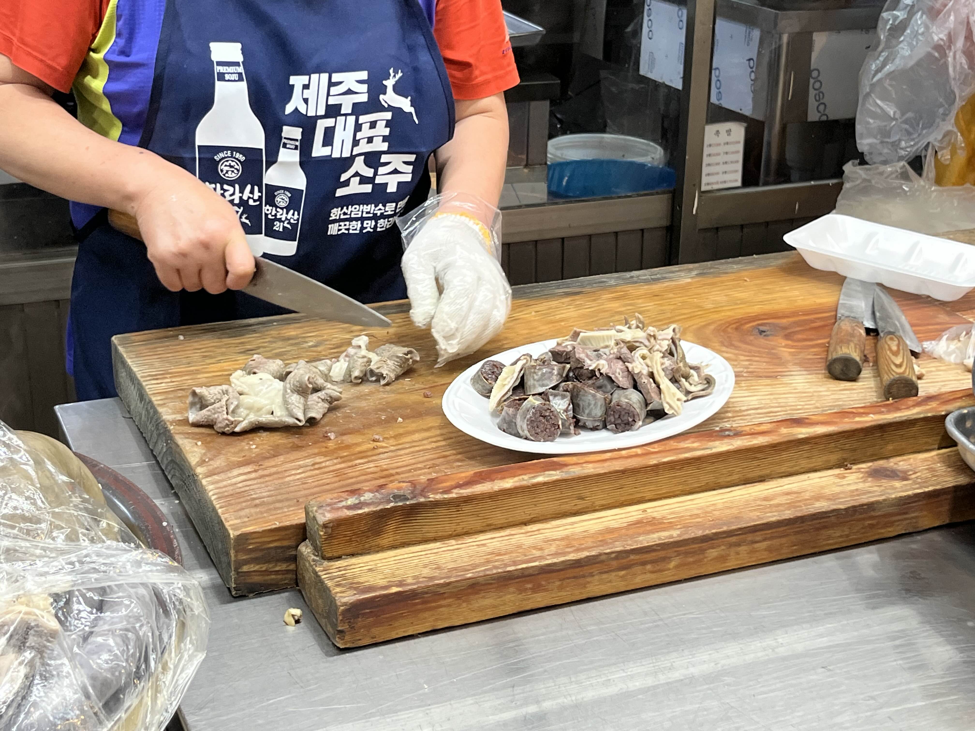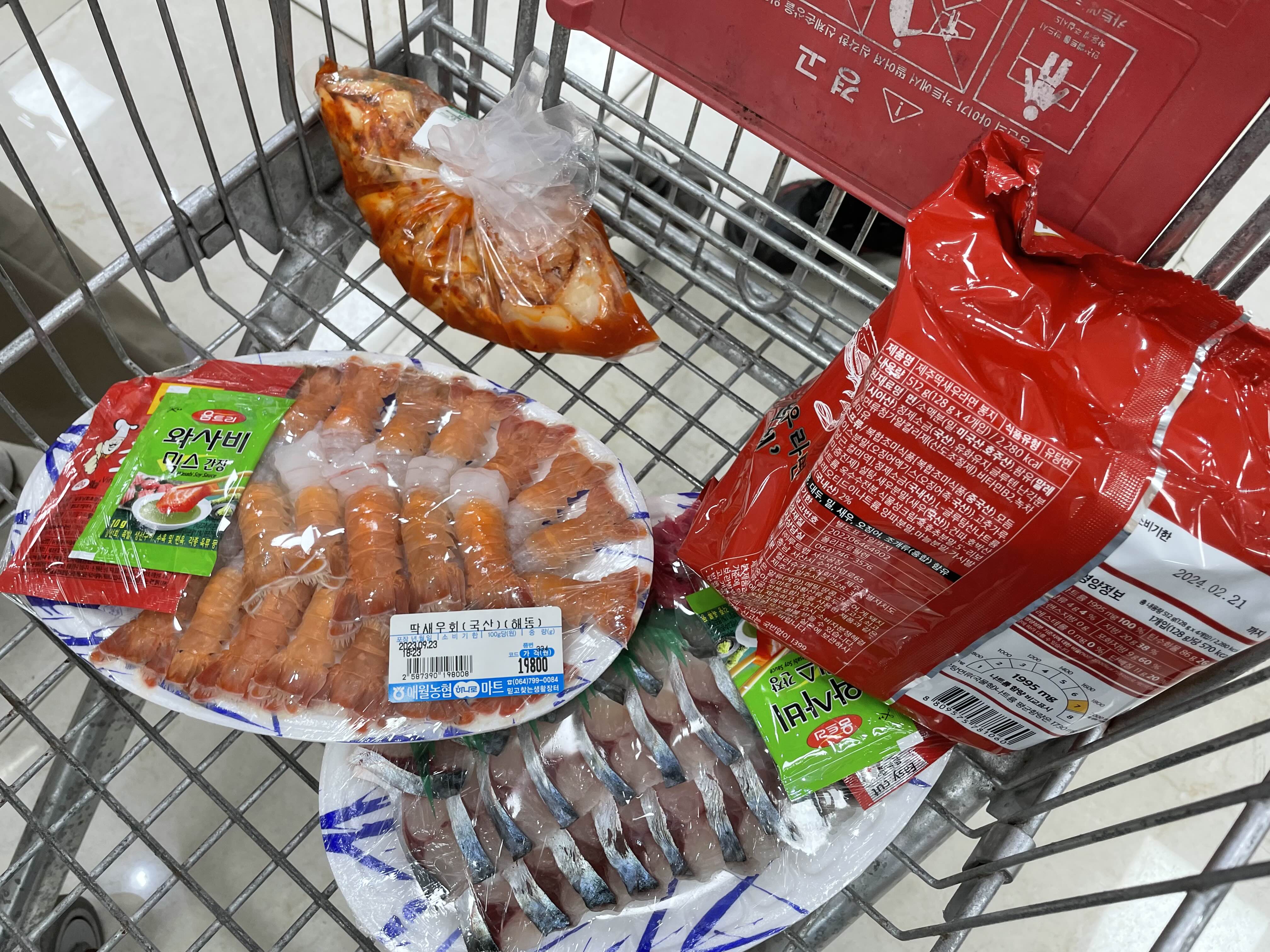 여행지에 오면 시장탐방이 쏠쏠한 재미가 있다. 그런데 우리가 갔던 한림재래시장은 매일 운영하지도 않고 시간이 6시가 다되어 가니 문도 거의 다 닫았다. 아쉬운 대로 순대와 귤을 한 봉지 사가지고 농협으로 향했다. 남편 지인 중에 제주도 사는 사람이 농협 회가 괜찮다고 해서 딱새우와 고등어회를 샀다.