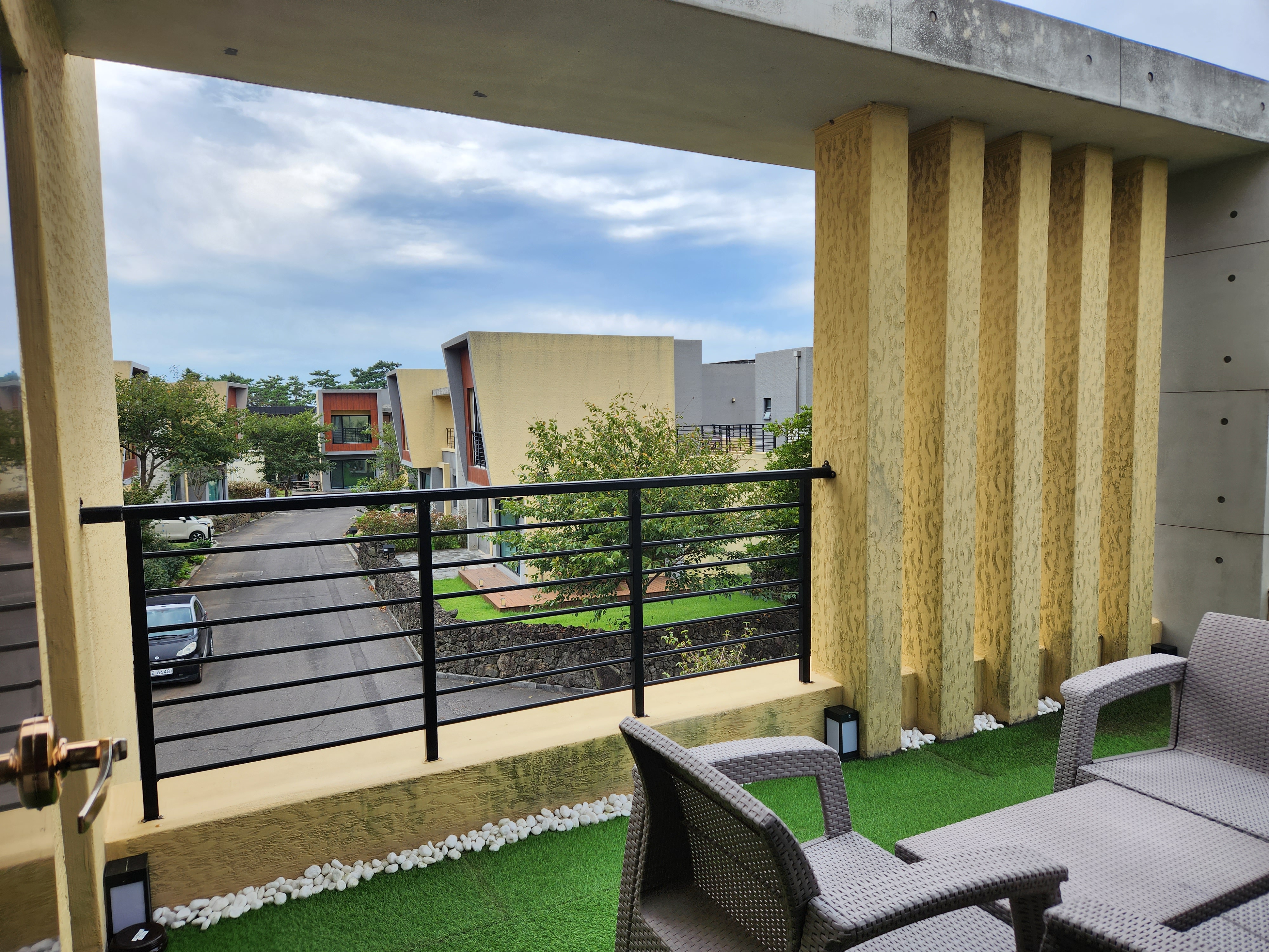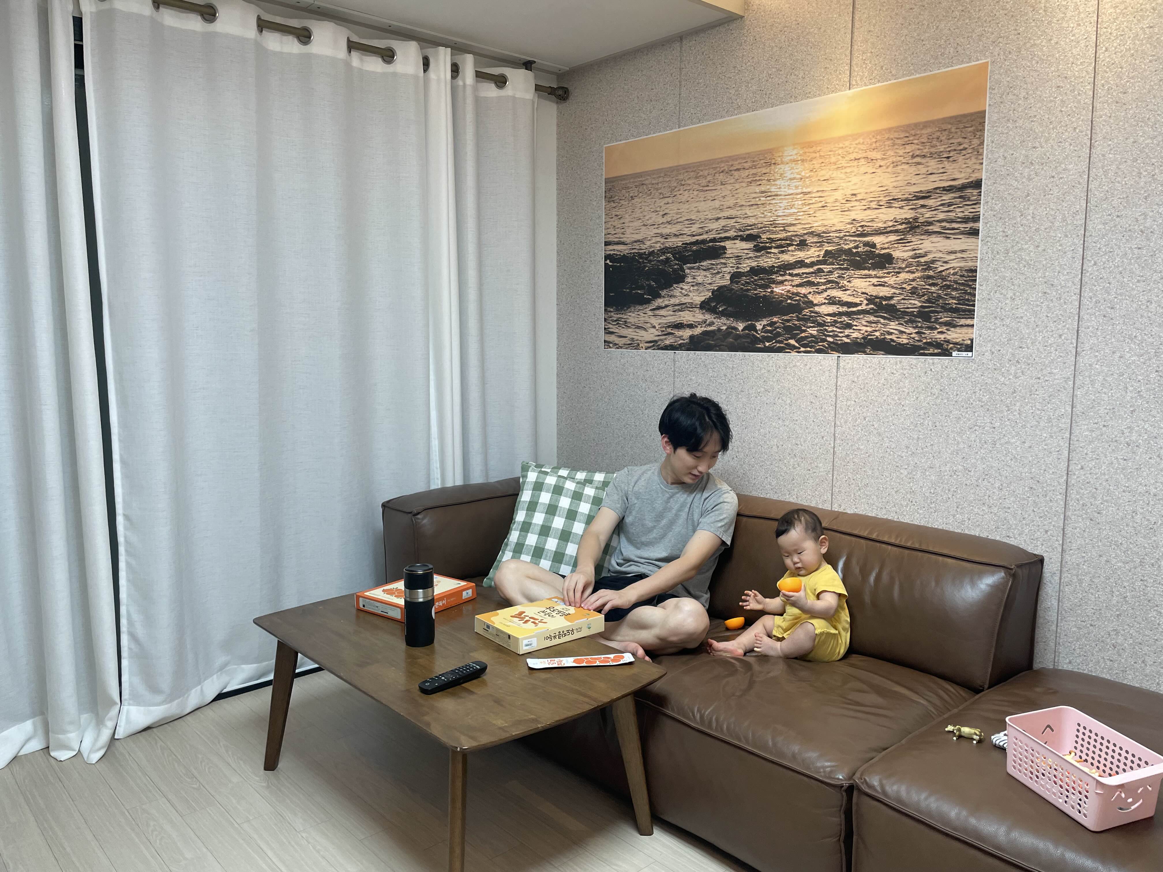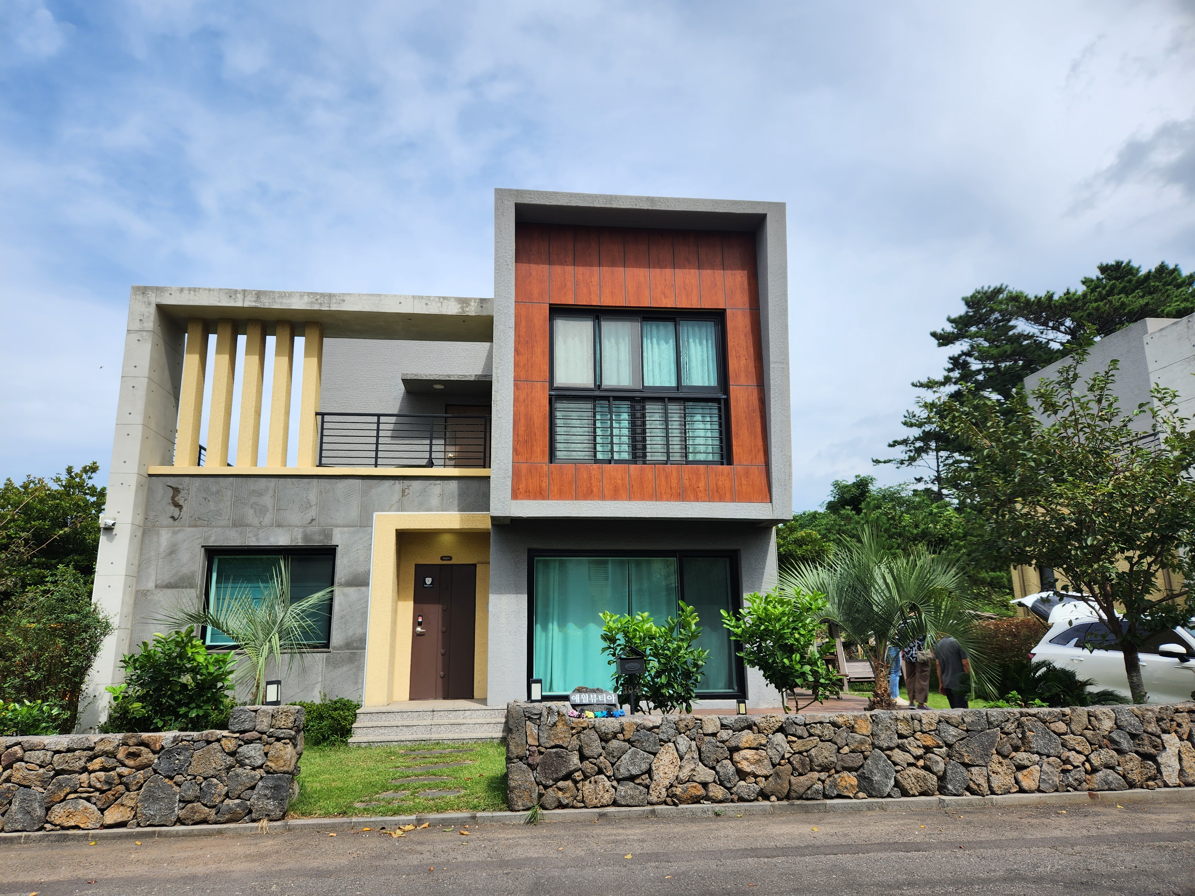 우리는 대 가족이다 보니 호텔은 지내기 어려울 것 같고 역시나 에어비앤비로 숙소를 찾았는데 깔끔하고 예뻤다. 새로 지은 지 얼마 안 된 것 같았고 관리가 잘 되어있었다. 집은 복층 구조로 되어있었다. 우리는 아기 짐이 많아서 1층 방으로 배정(?) 받았다. 2층은 테라스가 있는 공간이었는데 풍경이 멋있었다. 어머님은 숙소 소파에 앉으셔서 연신 제주도에 이런 집 하나 있었으면 좋겠다고 말씀하셨다.