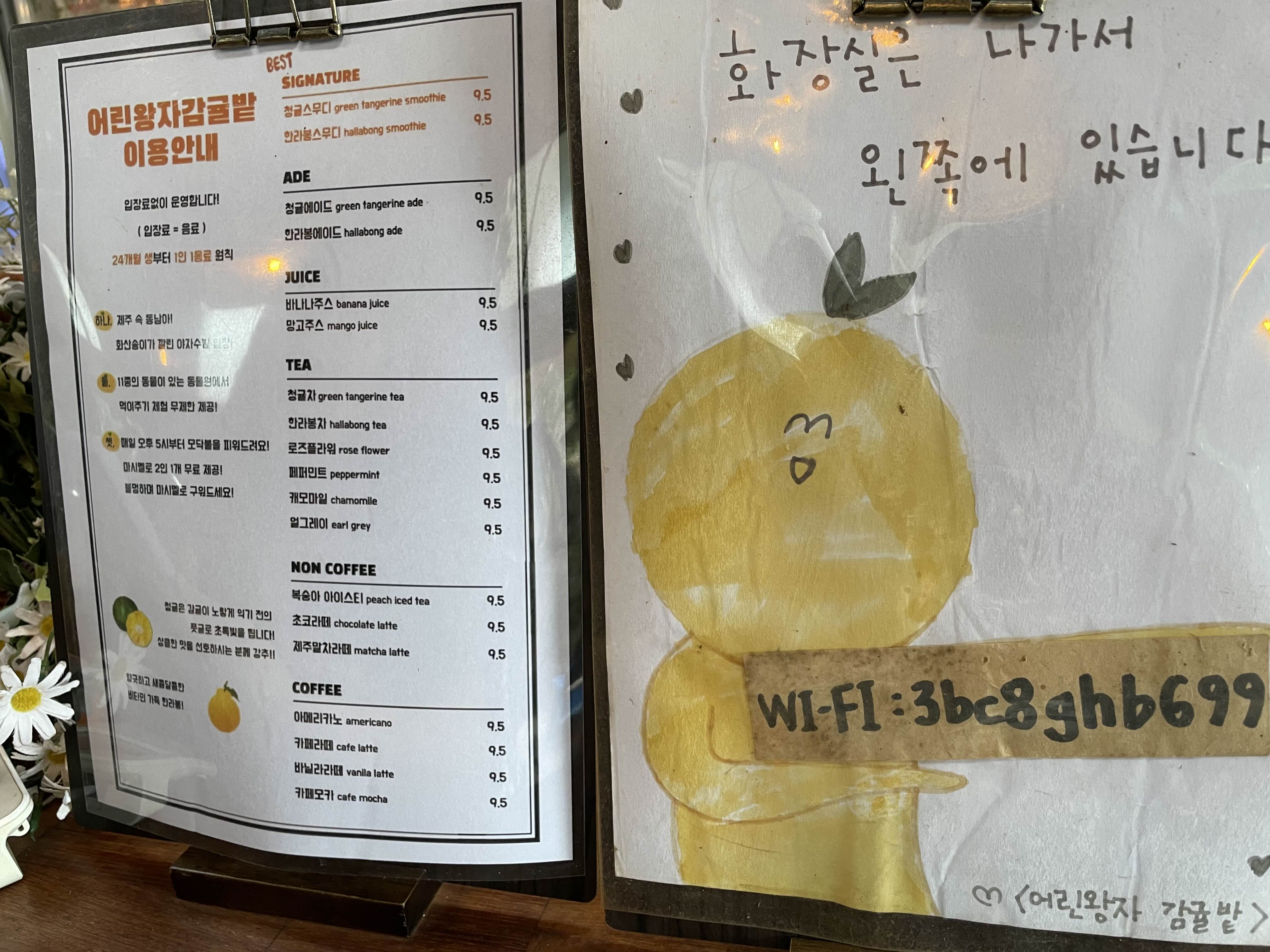 어린왕자감귤밭의 개인적 방문평은 음료 가격은 체험할 수 있는 공간이 있어서 그런지 음료가격 자체만 본다면 다소 가격이 있다. 그래서 체험을 안하는 사람들에게는 음료가격이 비쌀 수 있다. 그리고 날씨가 좋은 날 잘 맞춰가야 할 것 같고, 야외 공간은 관리가 조금 안 돼있었던 점이 아쉬웠다.
