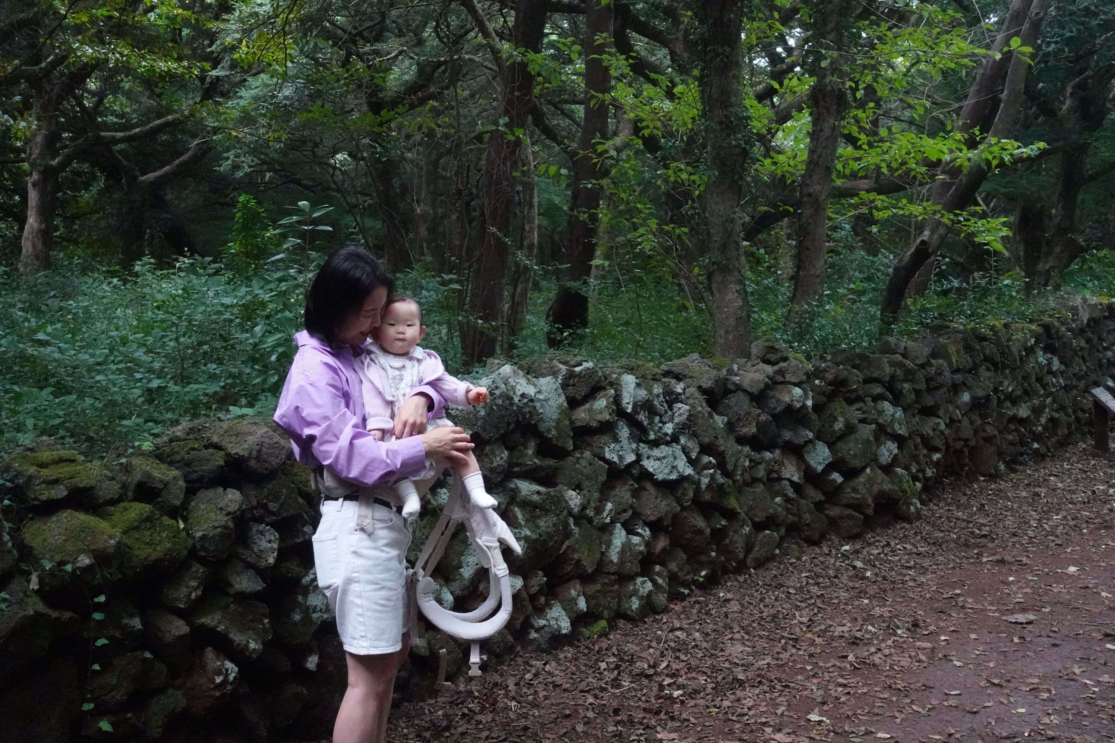 아기 유아차를 가지고 걷기 좋은 A코스를 따라가는데 유아차가 무용지물이었다. 왜인지 제주도에서 내내 아기가 나에게 찰싹 붙어있으려고 했다. 때문에 유아차는 그냥 짐일 뿐이었다. 그래서 아기띠를 메고 안고 걸었다. 아기와 함께 하다 보니 숲의 피톤치드를 온전히 느끼지는 못했다. 아기가 걷기는 걷지만 아주 잘 걷는 상태는 아닌지라 몇 걸음만 떼고 금방 안아달라고 하는 통에 거의 그냥 행군하듯이 아기를 매고 걸었다.