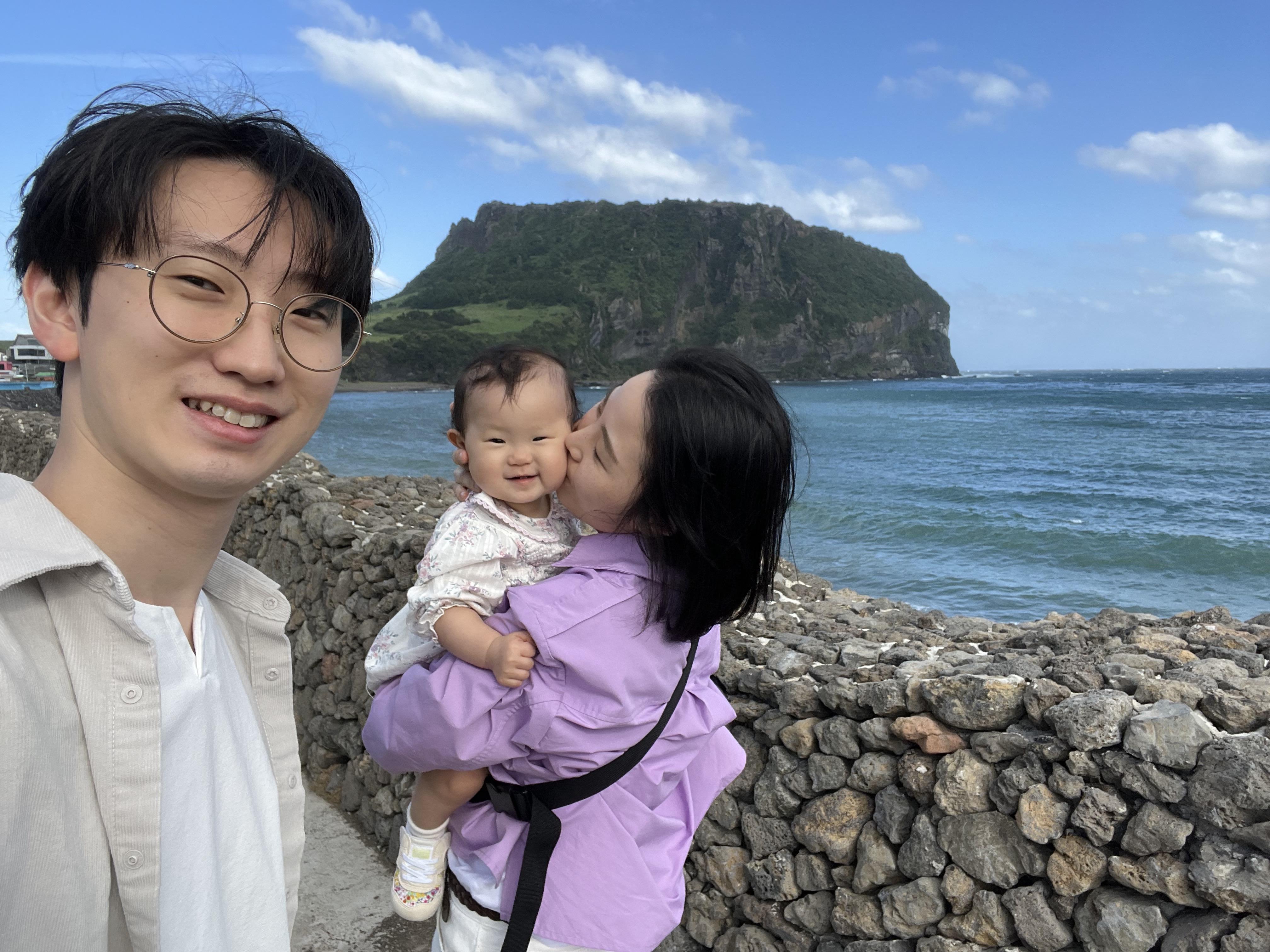프릳츠에서 차로 한 5-10분쯤 갔을까? 바로 성산일출봉에 도착했다. 무료 통로로 슬슬 올라갔는데 점점 바람이 심상치 않았다. 아무리 제주도라지만 아기라면 진짜 날아갈 수도 있을 정도의 바람이 불었다. 그래서 우리는 아기가 추우면 어쩌나 하고 걱정했는데 아주 신난 표정으로 꺅꺅대고 웃고 있었다. 그래서 우리는 잘 즐기고 있구나 하고 열심히 사진 찍고 놀았다.