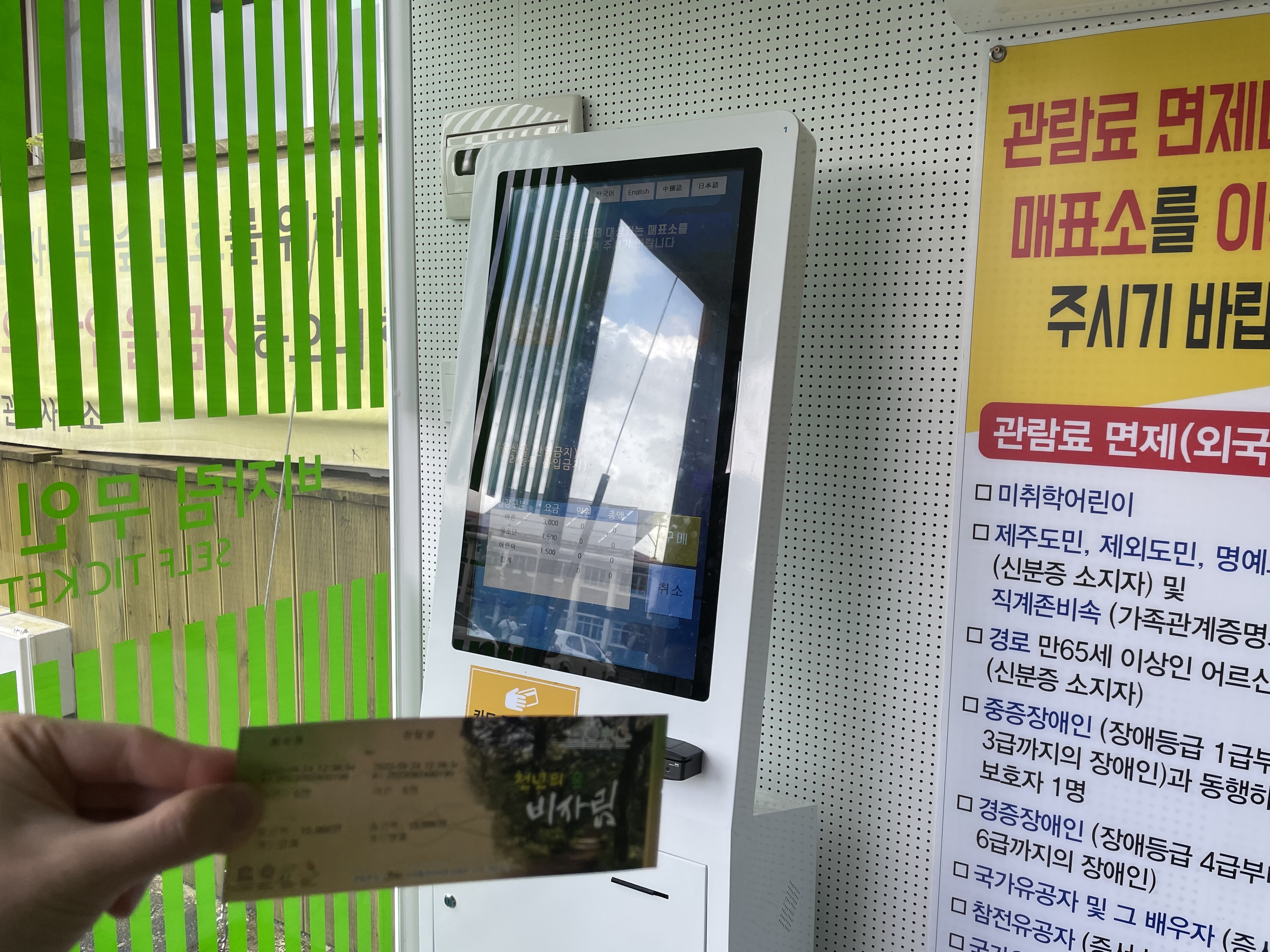 비자림은 유료 관광지로 티켓을 구매해야 하는데 관람료 면제대상자는 유인 매표소에서 티켓을 구매하도록 되어있었고, 그 외 일반인들은 모두 키오스크로 매표하고 있었다.