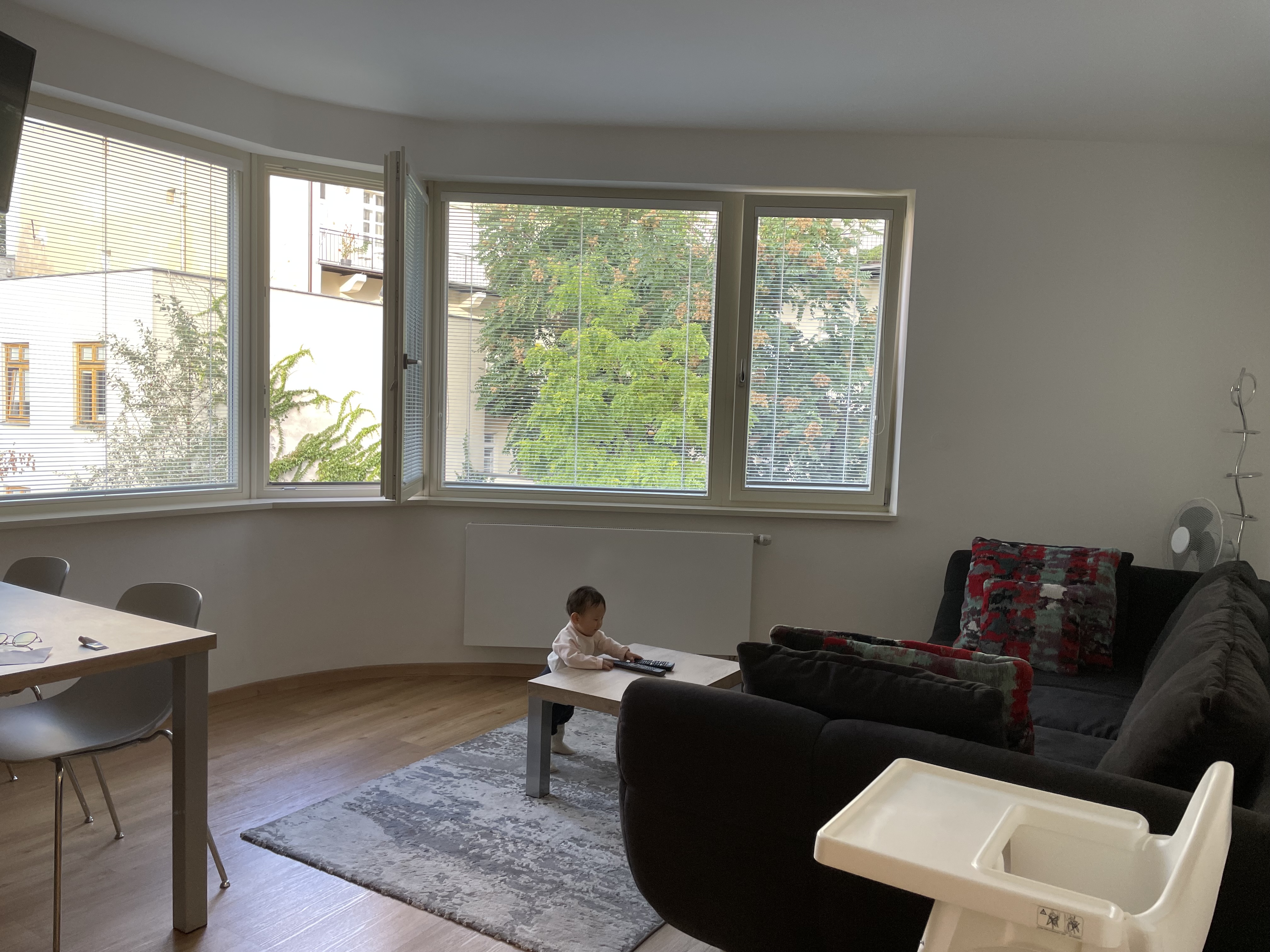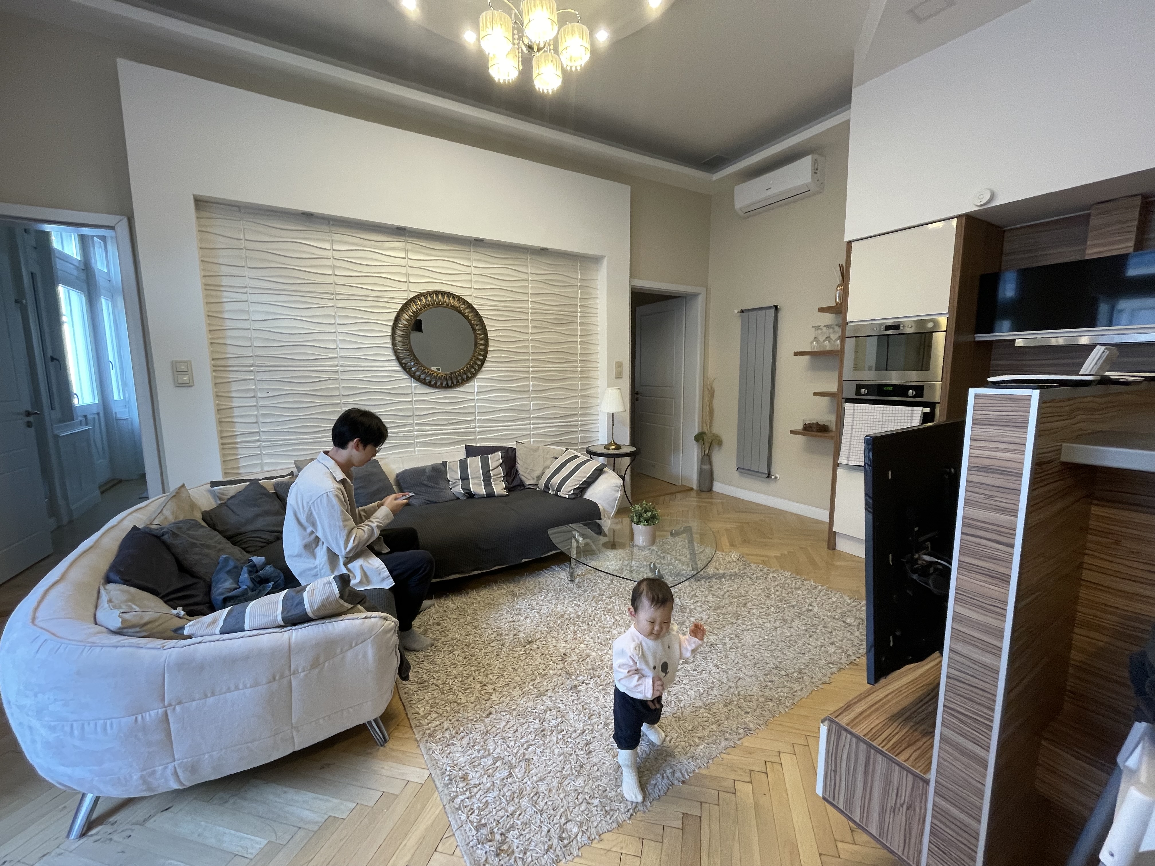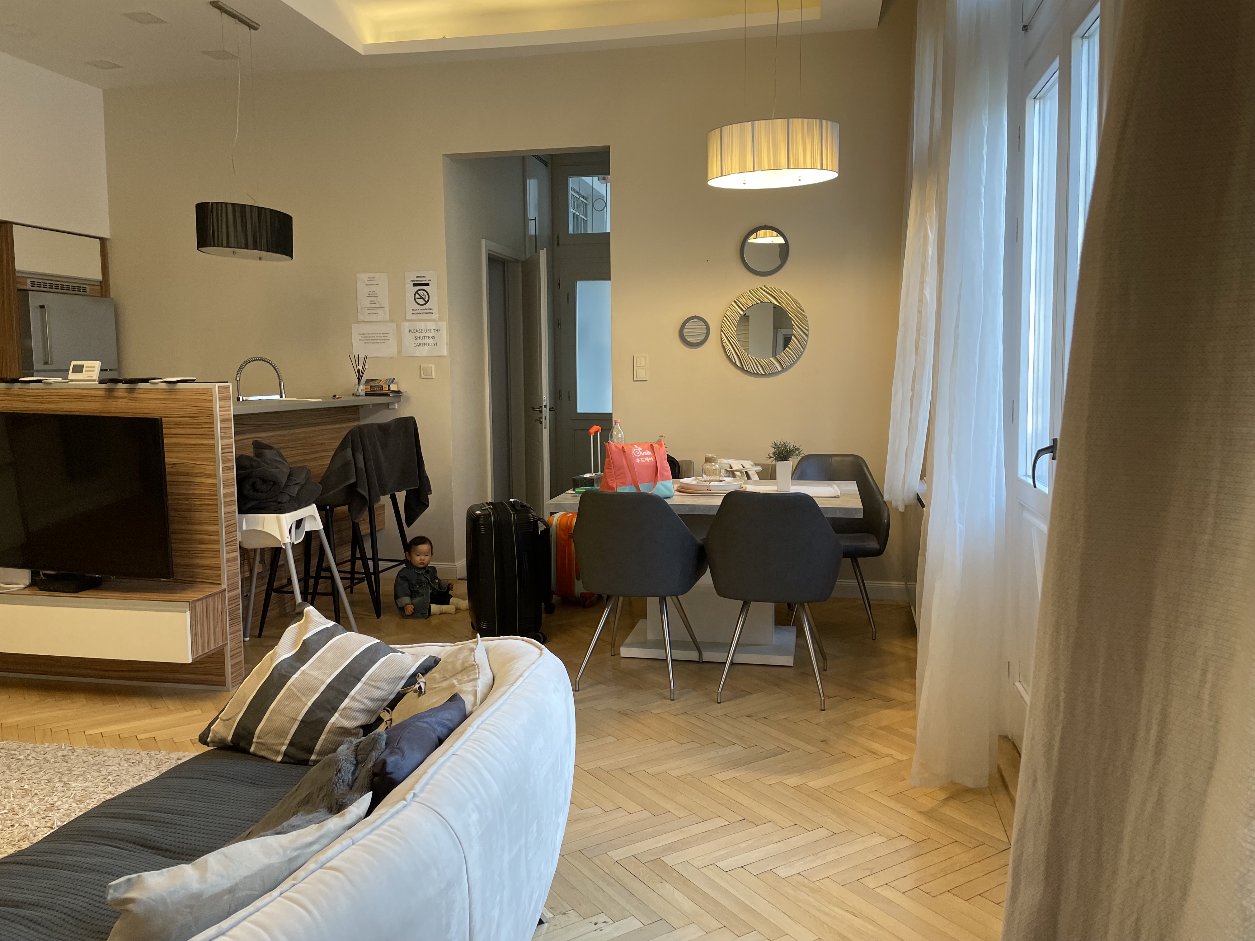 거실 공간도 넓었다. 아쉬웠던 건 소파와 러그가 너무 더러웠다는 점. 아무래도 신발을 신고 생활하는 문화다 보니 러그가 그렇게 깨끗하게 관리되지 않을 거라는 건 알지만 아기가 돌아다니는 시기라 러그를 만지려고 할 때가 많았다. 소파도 패브릭 소파라서 아무래도 더러운 게 눈에 보였지만 어쩔 수 없이 사용했다. 가능하면 아기의 맨몸에는 닿지 않도록 부단히 노력했다.