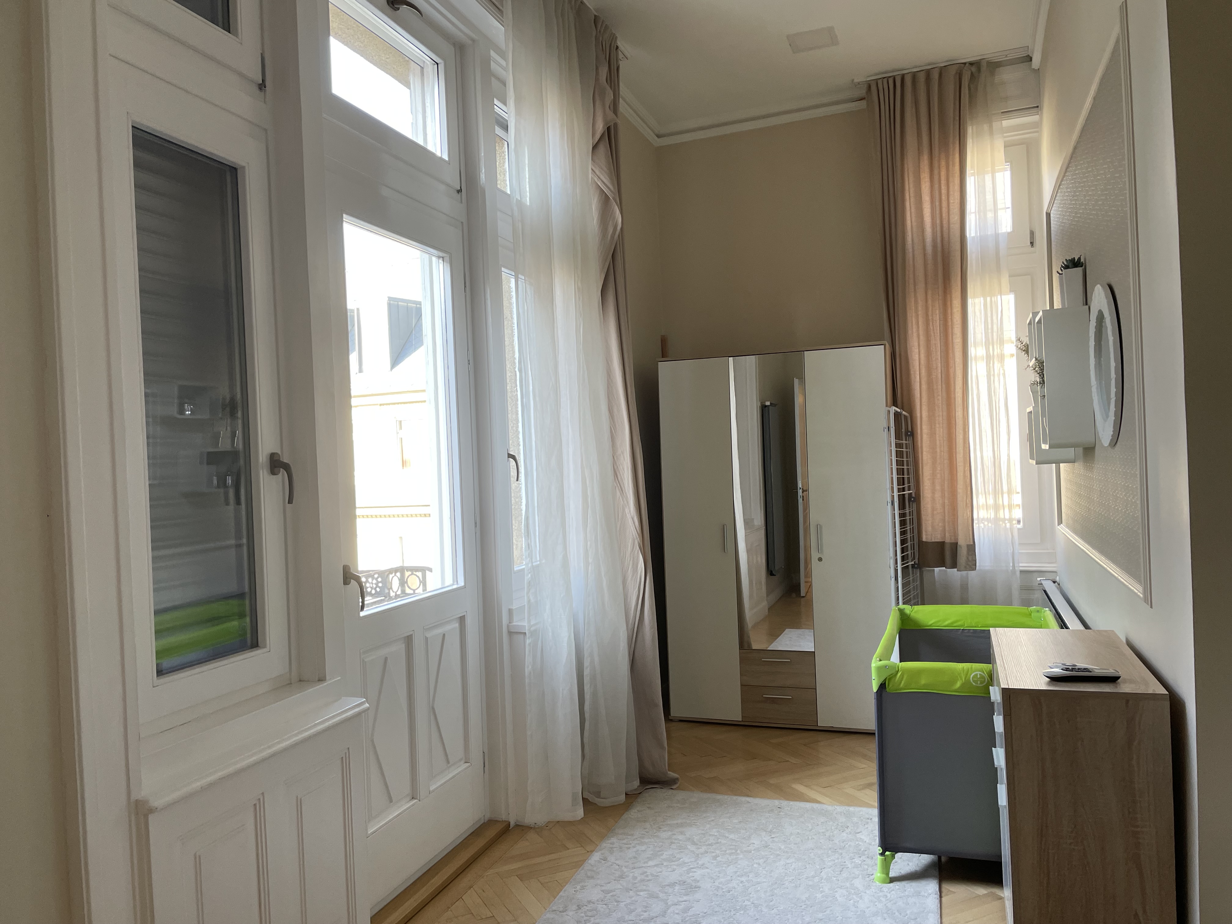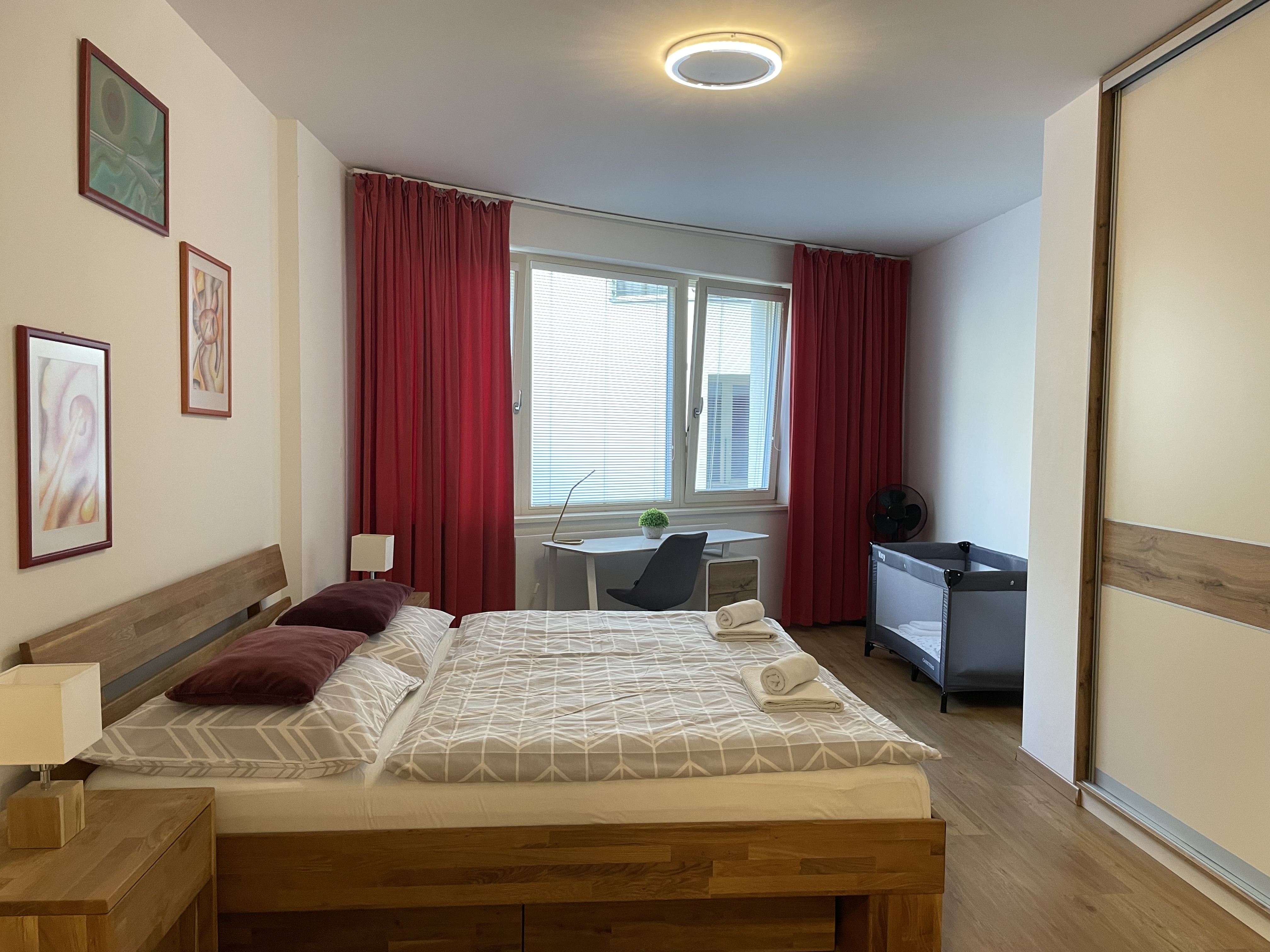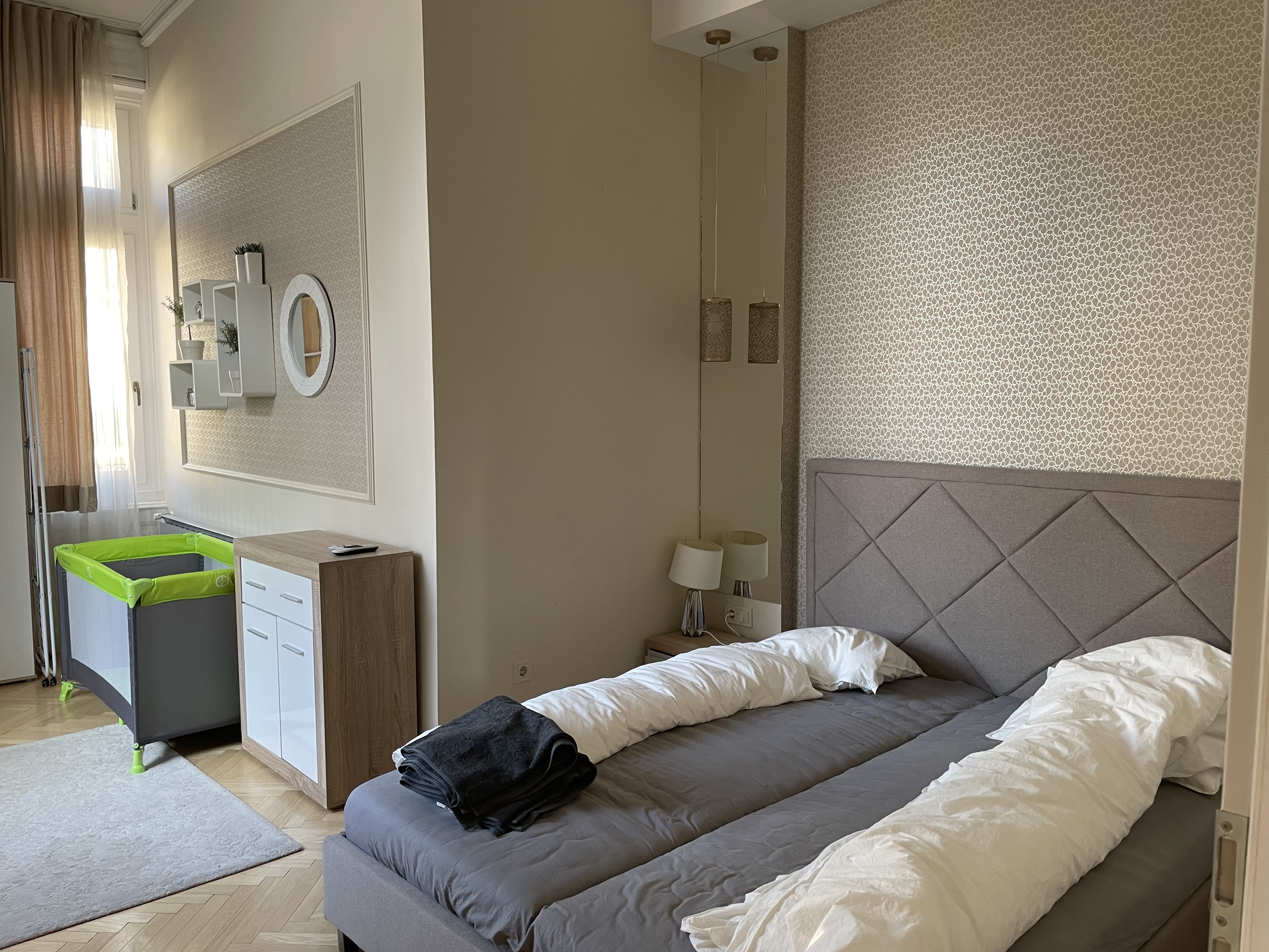 베드가 있는 침실은 하나였고 이곳은 침대가 부다페스트 숙소보다는 넓었다. 여기서도 아기침대를 요청하긴 했는데 역시 플레이야드가 아기침대라고 주었다. 그래도 여기선 아기 침구가 깨끗하게 제공이 되어서, 아기를 한번 눕혀보고 잘 만하면 재워볼까 했는데, 프라하로 넘어와서는 날씨가 급격히 추워져서 아기를 저상침대에 재우기에는 땅의 찬 기운이 너무 닿을 것만 같았다. 그래서 우리 부부 사이에서 재울 수밖에 없었다.