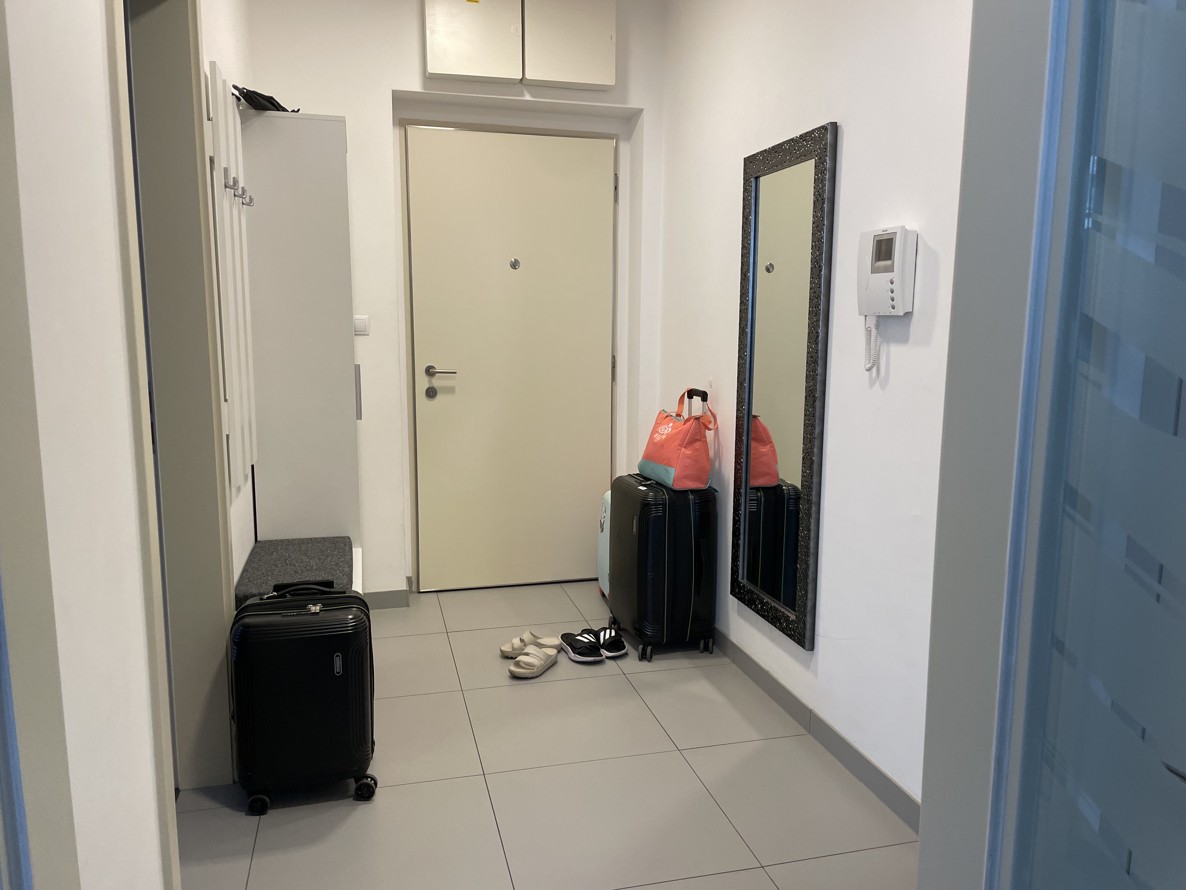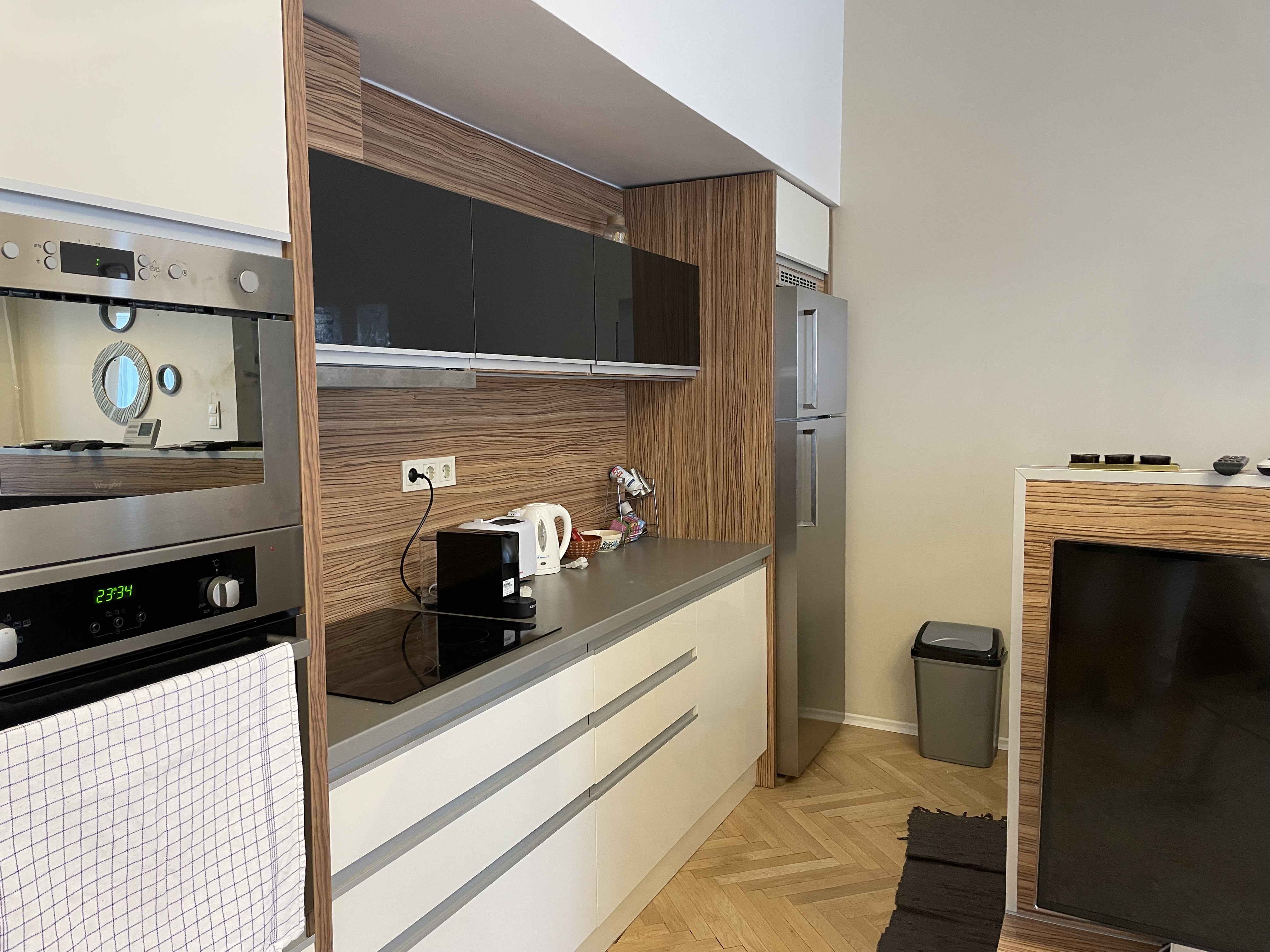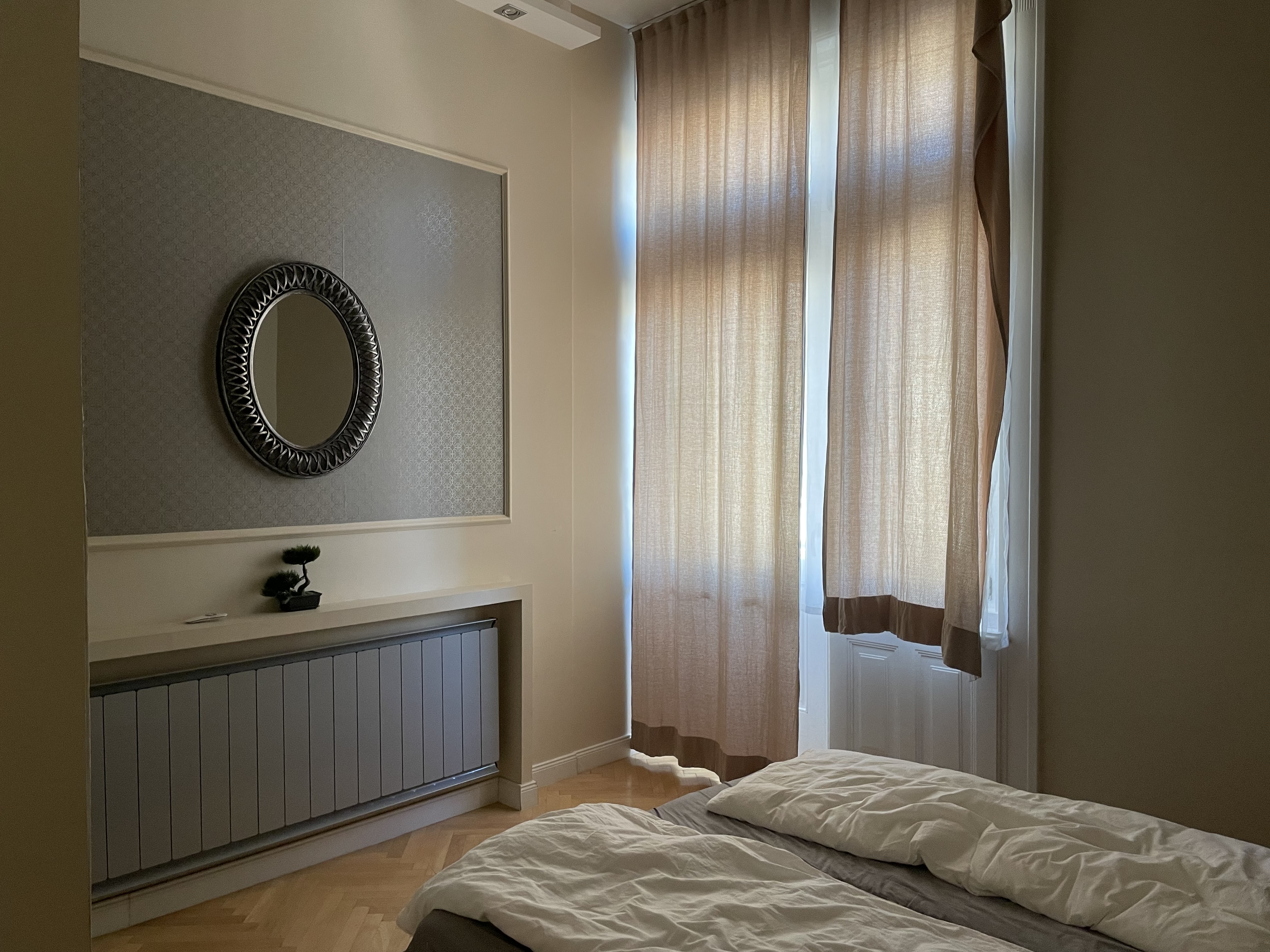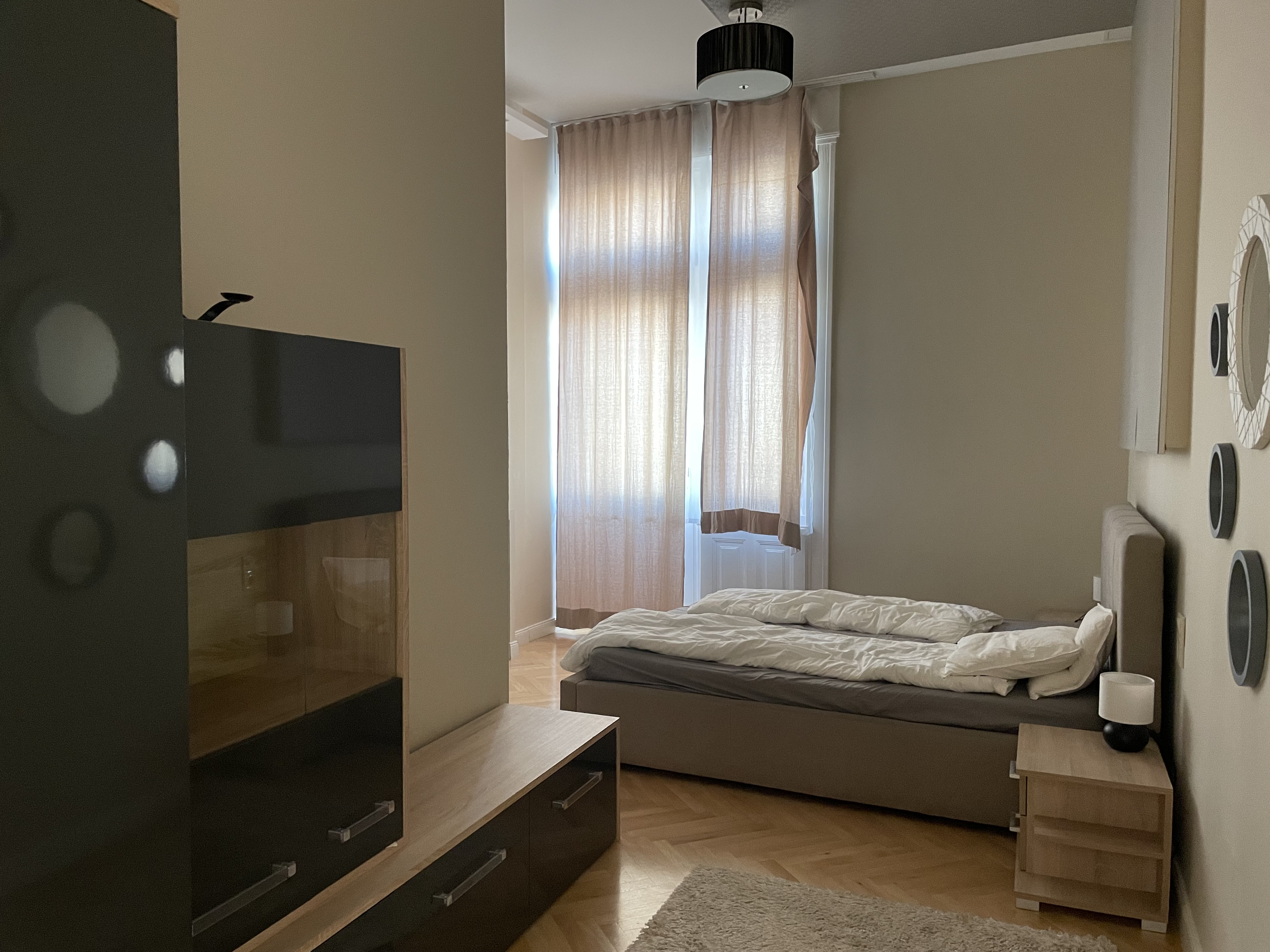 베드가 있는 침실은 하나였고 이곳은 침대가 부다페스트 숙소보다는 넓었다. 여기서도 아기침대를 요청하긴 했는데 역시 플레이야드가 아기침대라고 주었다. 그래도 여기선 아기 침구가 깨끗하게 제공이 되어서, 아기를 한번 눕혀보고 잘 만하면 재워볼까 했는데, 프라하로 넘어와서는 날씨가 급격히 추워져서 아기를 저상침대에 재우기에는 땅의 찬 기운이 너무 닿을 것만 같았다. 그래서 우리 부부 사이에서 재울 수밖에 없었다.
