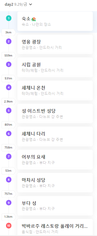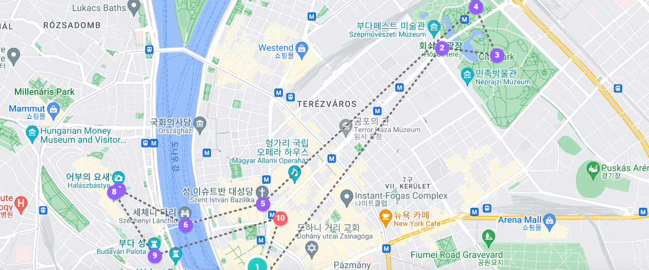 영웅광장 중앙 기념비 → 시민공원 내 바이더 후냐드성→안익태 흉상 / 세체니온천→밀레니엄 지하철 타고 시내로 이동→이슈트반 대성당→버스로 세체니 다리를 지나 부다지역으로 이동→어부의 요새→마차시 성당→부다 왕궁→국회의사당 조망