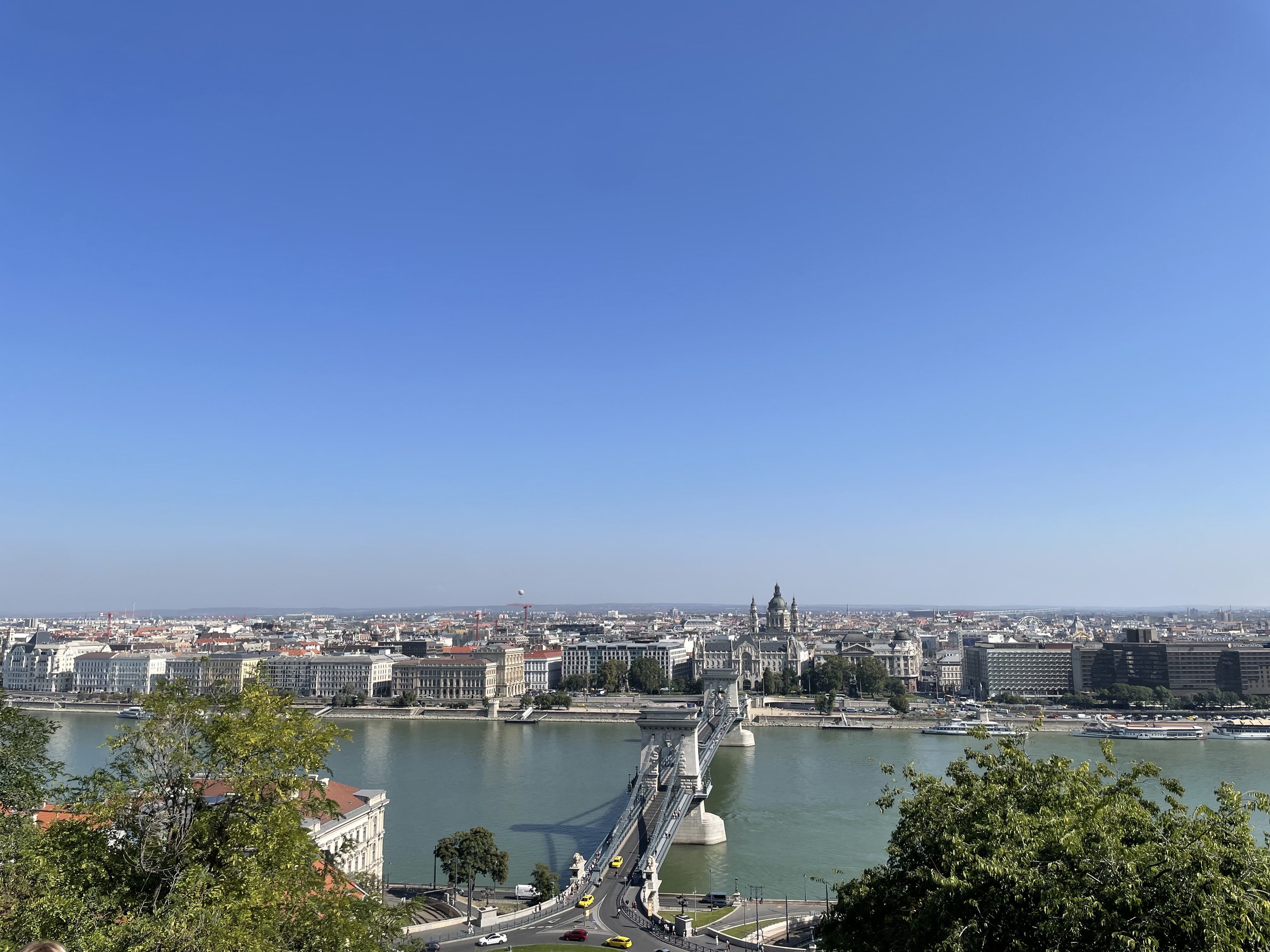 부다와 페스트 사이에 흐르는 도나우강을 연결하는 주요 세 다리인 에르제베트, 세체니, 머르기트 중에 가장 유명한 세체니 다리를 버스 타고 지나왔다. 이 세 다리 색은 헝가리의 국기색인 빨강-하양-초록을 상징하도록 구성되어있다고 한다.