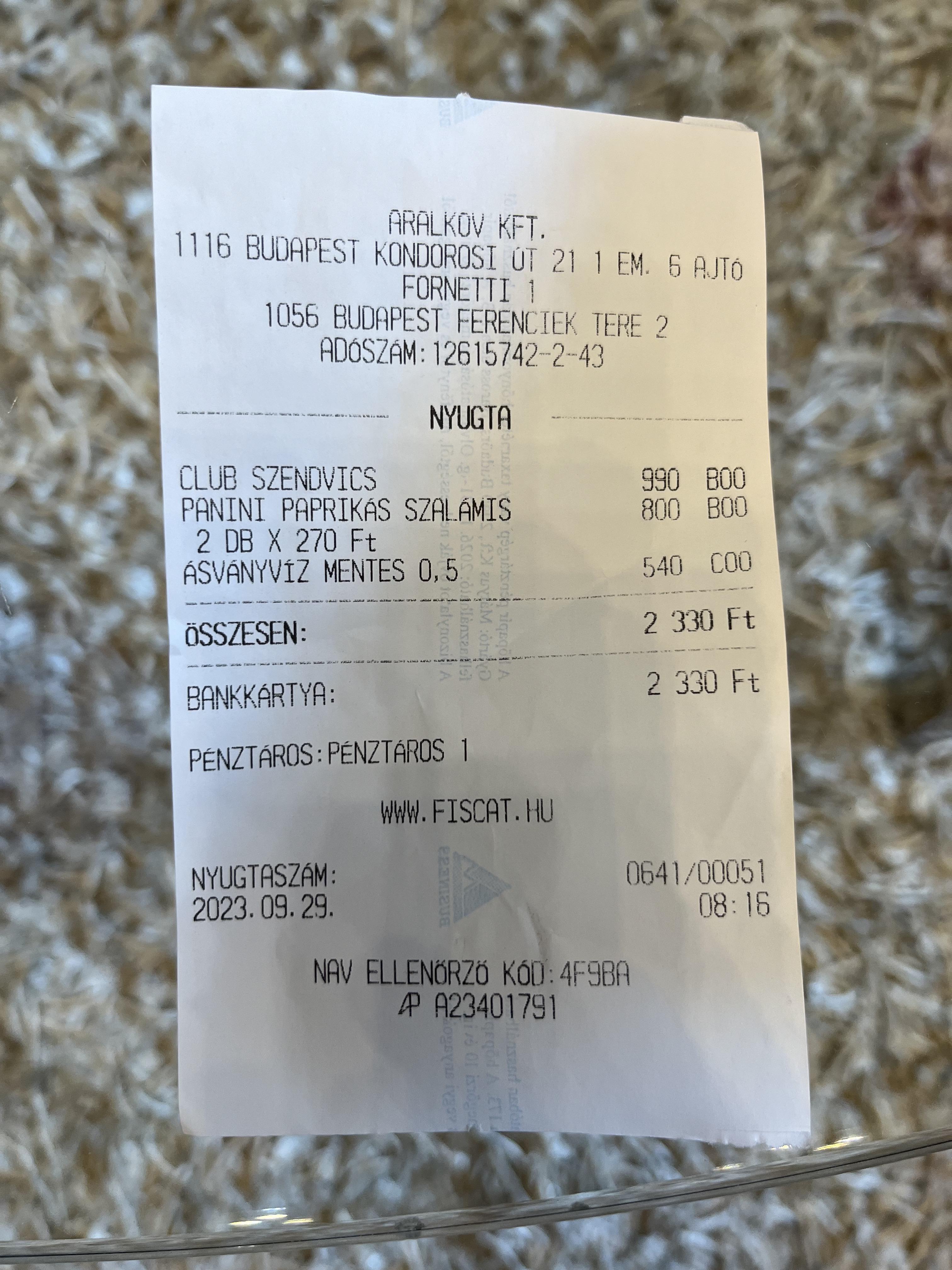 남편이 교통권을 사가지고 돌아오는 길에 열려있던 샌드위치 가게에서 물과 아침을 사 왔다. 부다페스트에서의 첫끼였는데 비주얼은 별로 기대가 안됐는데 생각보다 맛있어서 순식간에 흡입했다. 가격도 착했다. 클럽샌드위치가 990ft(한화 약 3,400원), 페퍼살라미파니니가 800ft( 한화 약 3,000원) 정도였다. 그 정도 가격에 이 정도 맛이라니 감탄을 금치 못했다. 작은 것에도 감동받는 것이 여행의 매력인 것 같다.