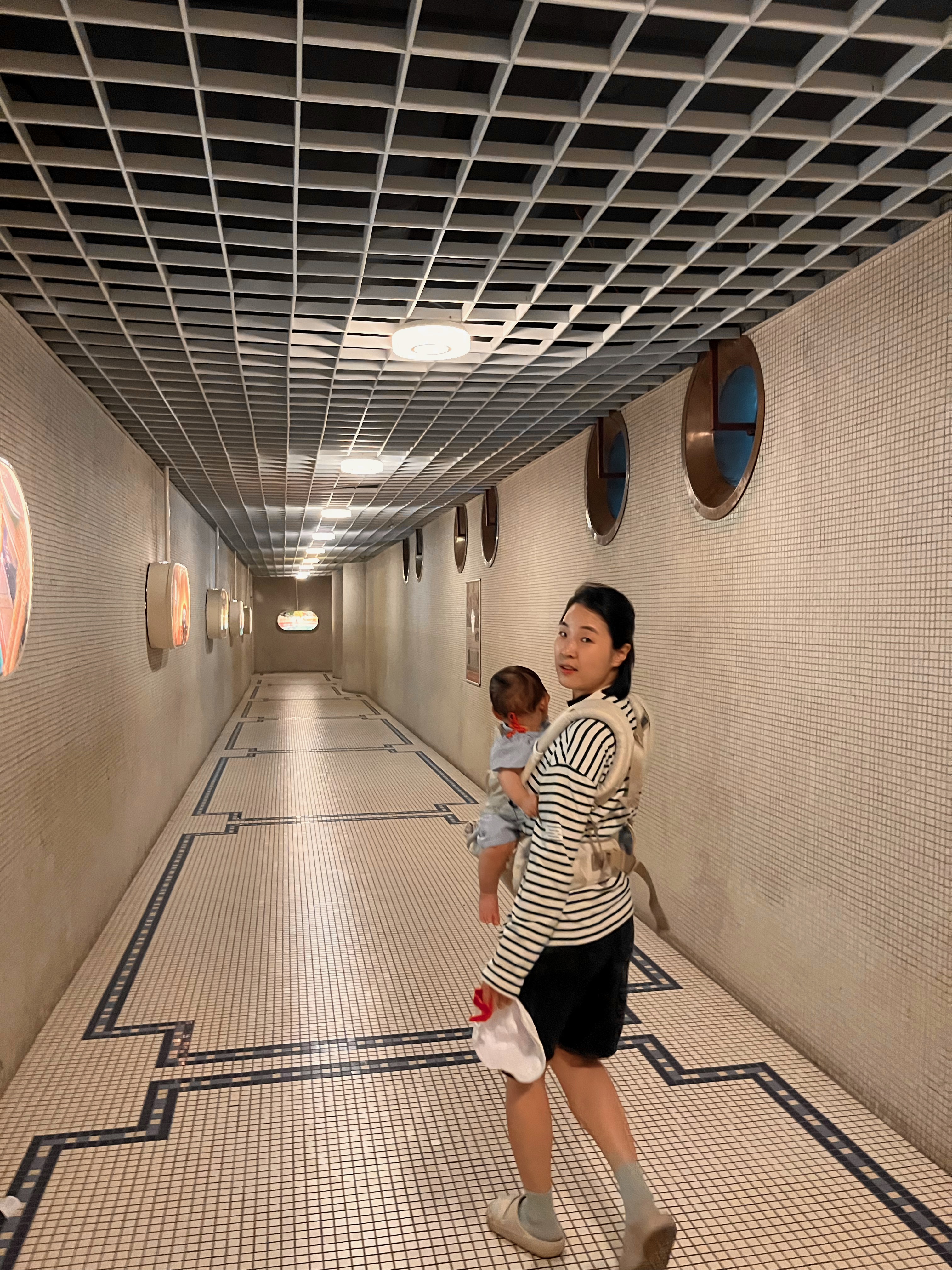 들어가자마자 보이는 탕에 번갈아가며 몸을 담그고 아기와는 겉에서 구경만 조금씩 하다가 아기 발 정도는 담가도 되겠다 싶어서 민폐지만 계단 한쪽 구석에 조심히 자리 잡고 놀았다. 다행히도 안에 계신 분들이 아기를 흐뭇하게 봐주시고 계셨다.