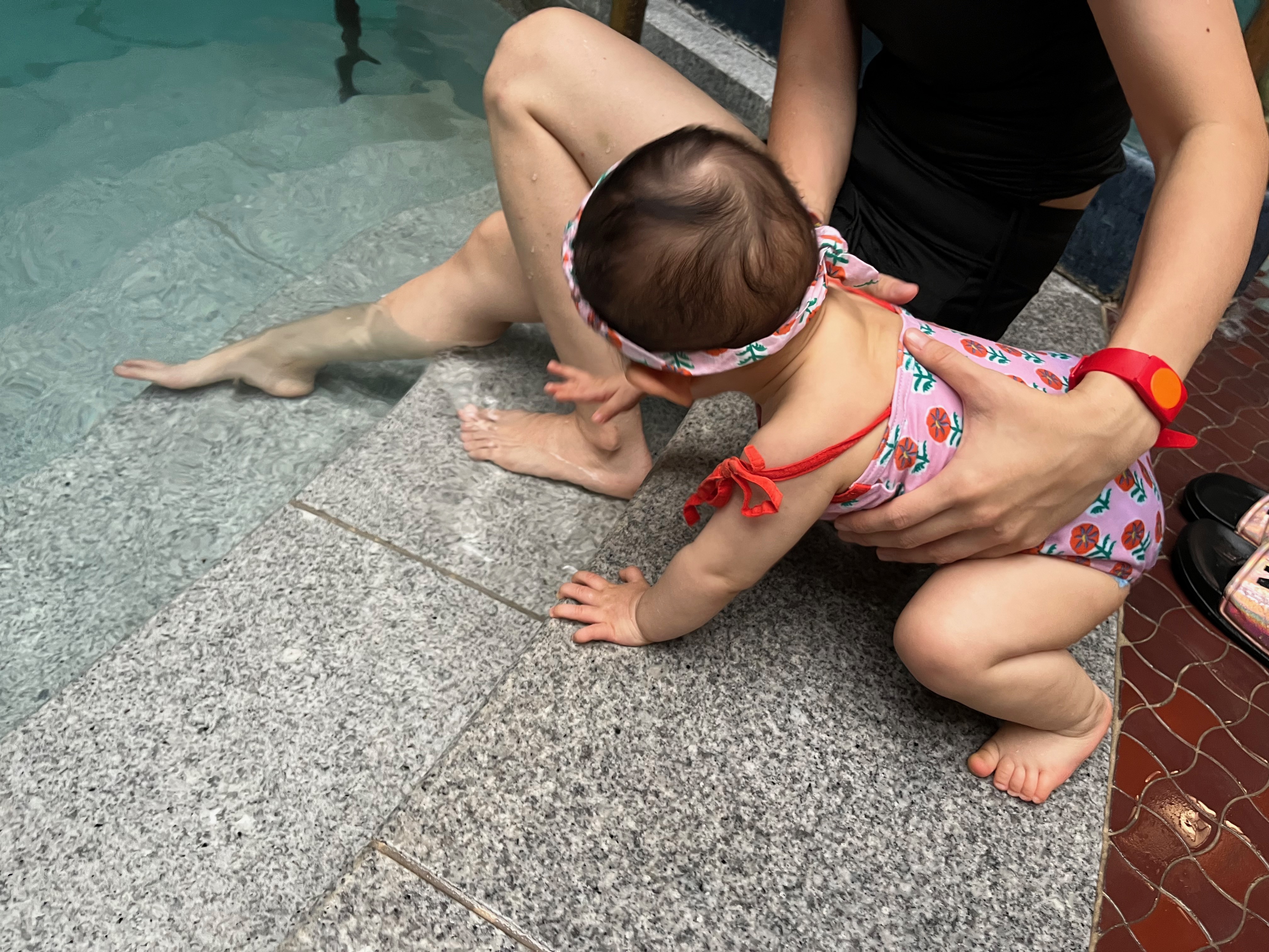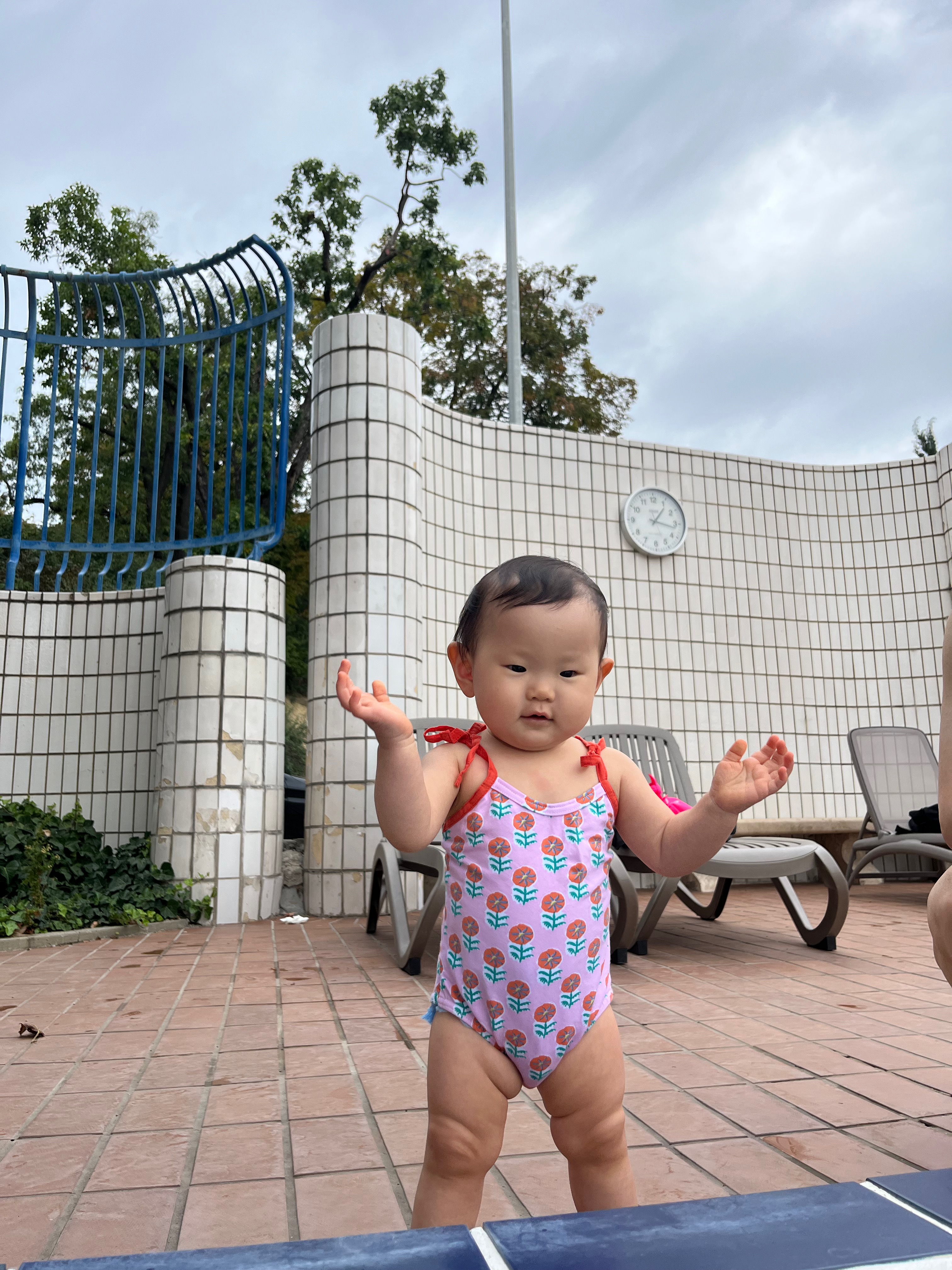 작은 수영장도 있었는데, 나는 수영모를 안 가져온 것을 후회했다. 그래도 친구가 선물해 준 너무도 깜찍한 아기 수영복을 이렇게 해외에서 개시할 수 있어서 다행이라 생각하며 아기와 사진 찍는데 만족해야 했다.