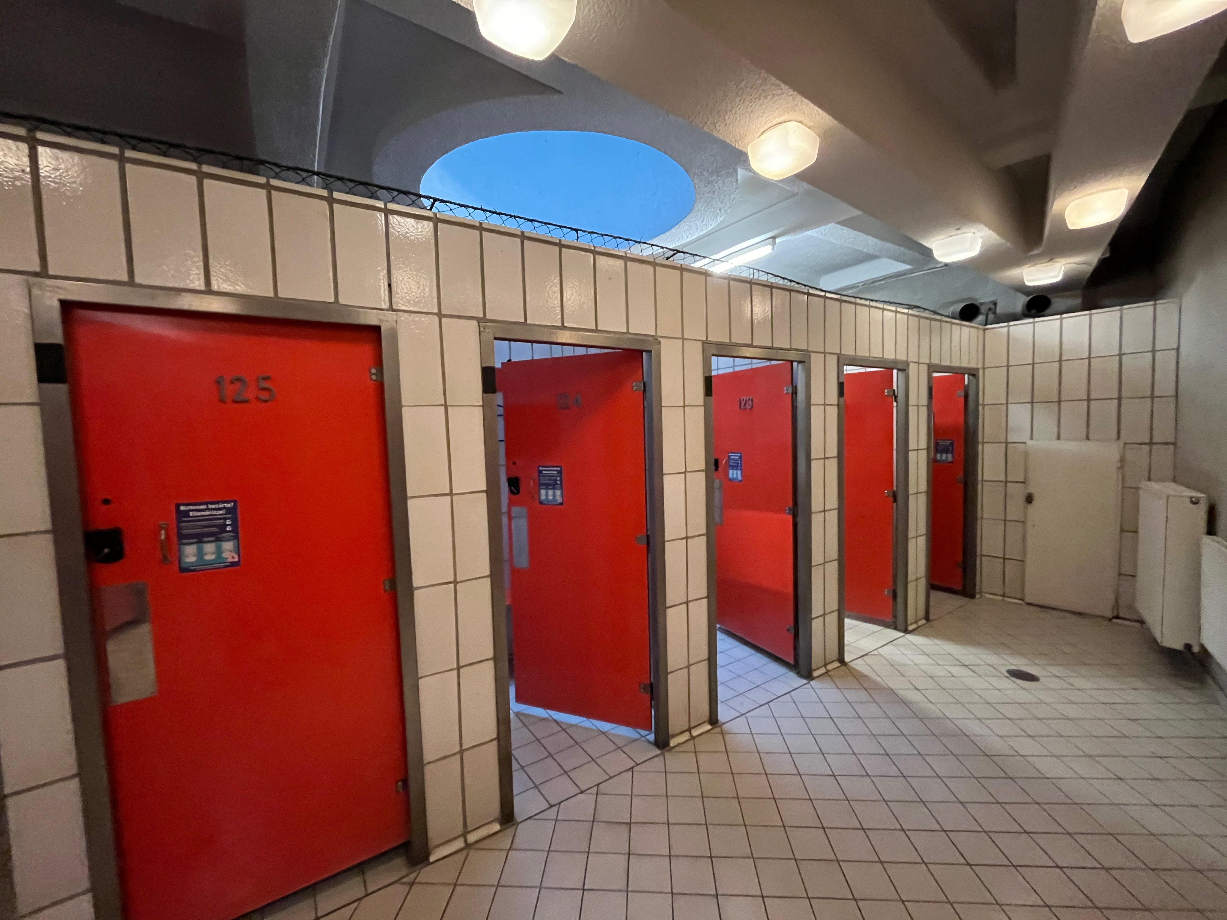우리는 아기와 함께니 프라이빗 라커룸을 해서 좀 더 편하게 이용하기로 했다. 생각보다 비용차이도 많이 안 났는데 그만큼 공간이 굉장히 좁고 내 느낌엔 마치 수용소 같았다. 공기 순환을 위해서인지 아래 구멍도 뚫려있는 간단한 라커룸이었다.
