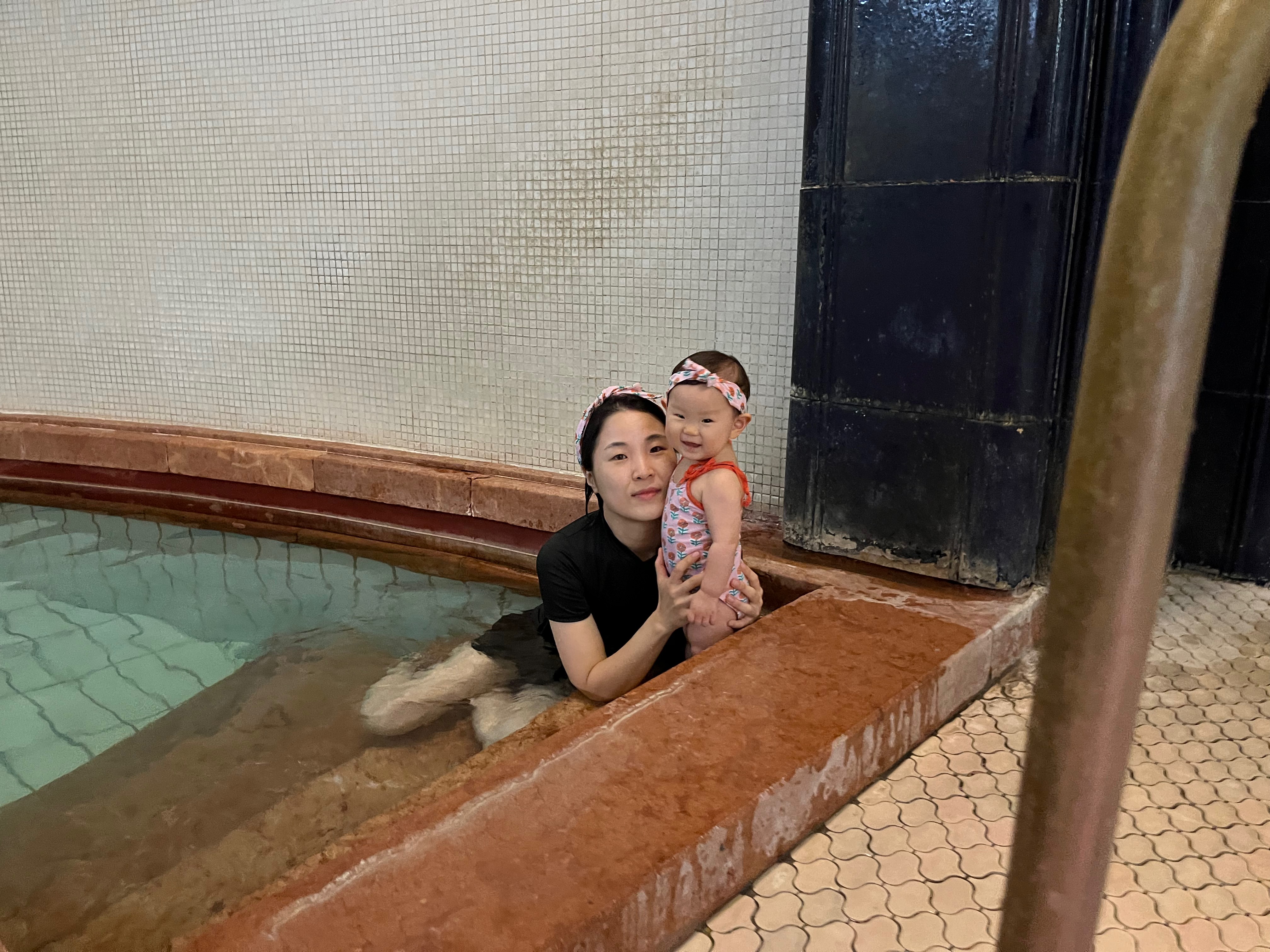 들어가자마자 보이는 탕에 번갈아가며 몸을 담그고 아기와는 겉에서 구경만 조금씩 하다가 아기 발 정도는 담가도 되겠다 싶어서 민폐지만 계단 한쪽 구석에 조심히 자리 잡고 놀았다. 다행히도 안에 계신 분들이 아기를 흐뭇하게 봐주시고 계셨다.