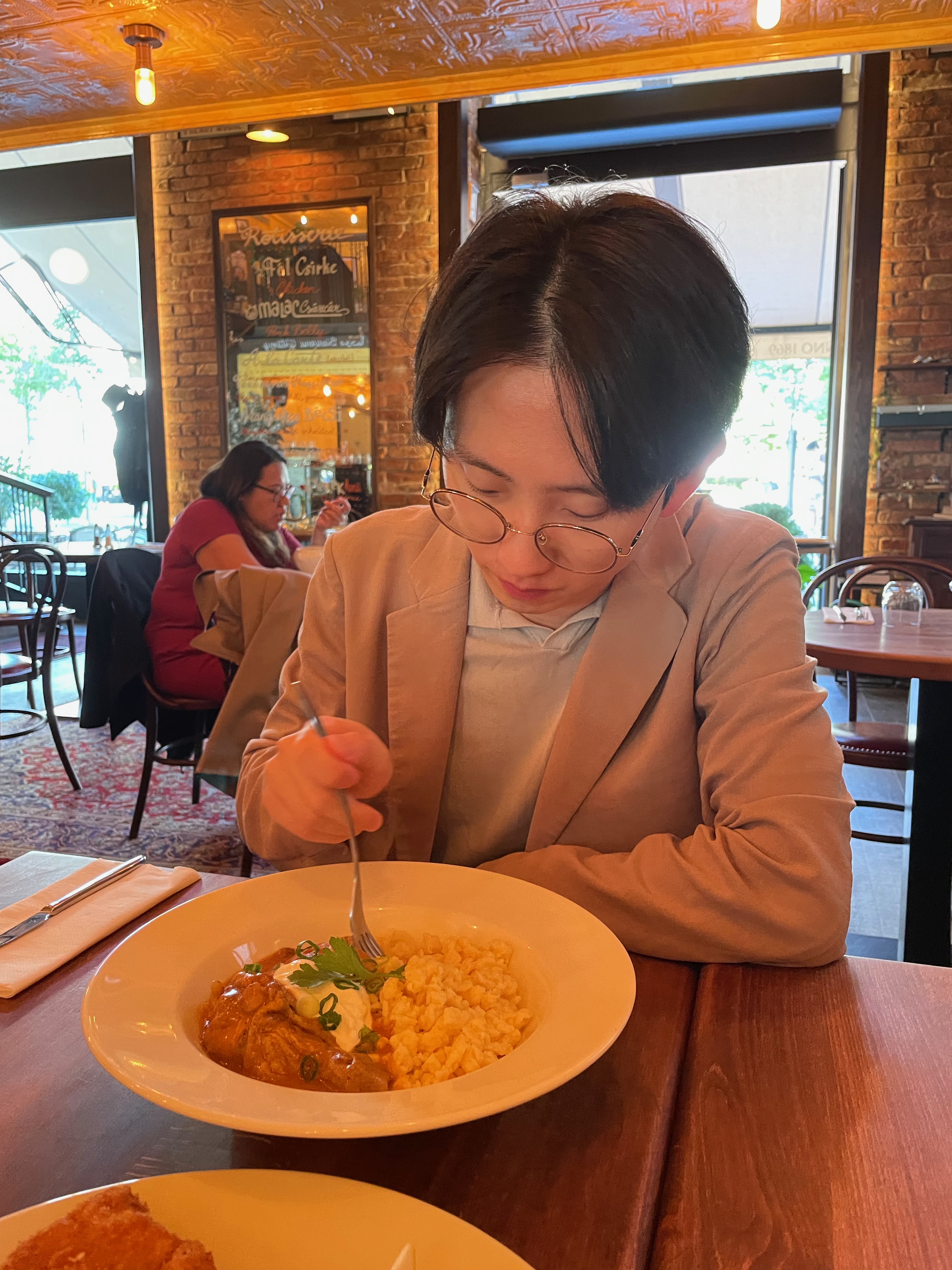 남편은 현지음식인 치킨뻐프리카를 시켜보았다. 그리고 꼭 한번 먹어봐야지 벼르고 있었던 토카이 와인! 현지 자국에서만 주로 생산하고 소비하는 편이라 외국에서 구매하려면 꽤나 비싸고 구하기 힘들다고 한다. 점심이니 가볍게 1 Glass 만 부탁합니다. 와인은 달달하니 식후에 먹기 괜찮았다. 남편의 치킨 뻐프리카는 뭐랄까 카레 부은 치킨 맛... 곁들여진 건 뇨끼 같은 식감과 맛. 딱히 맛있다고 느껴지진 않았다. 덜 익은 수제비 같다고 생각했던 것 같다.