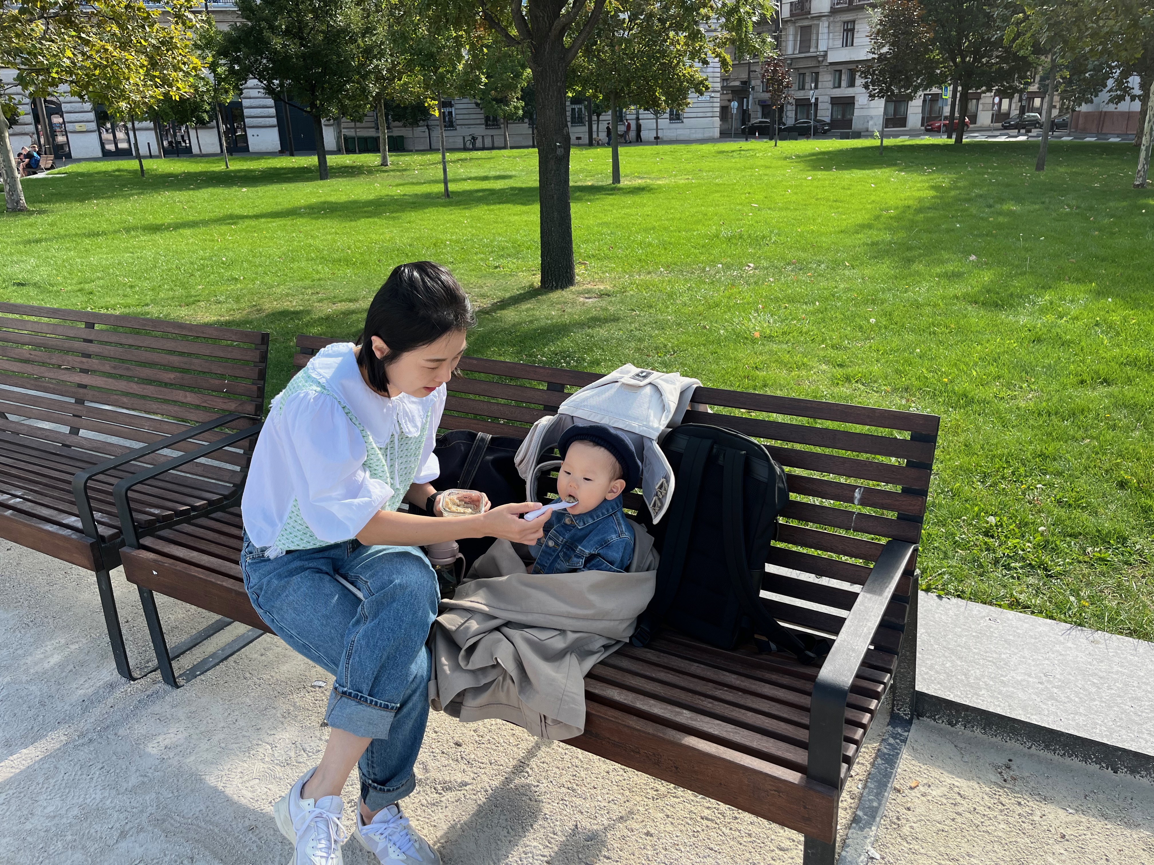 밖에서 아기 먹일걸 생각해서 이유식을 좀 뜨겁게 데워 나왔는데 여전히 따뜻하다. 아니 오히려 뜨거웠다. 열심히 식혀가며 먹이는데 햇빛은 따뜻하지만 바람이 꽤 서늘해서 가만히 앉아있자니 좀 추운 듯했다.