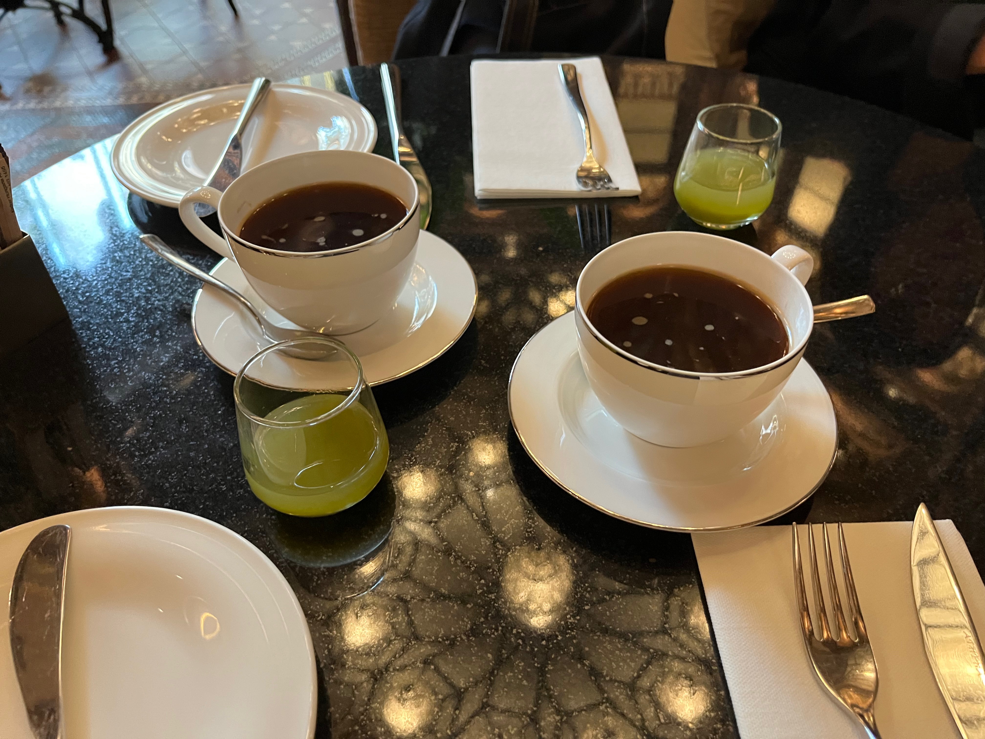 아침을 일찍 시작하니, 아무래도 배가 빠르게 고파진다. 그래서 나는 주변에 아침식사 되는 곳을 빠르게 검색해서 남편이 출근하기 전에 먹고 가도록 했다. 오늘 내가 찾은 곳은 숙소에서 도보 5분 거리의 호텔 내 식당. 간단하면서도 깔끔한 느낌의 아침식사와 커피를 원해서 선택하게 되었다. 구글링 했을 때 이곳이 19세기에 지어진 부다페스트 내 가장 아름다운 식당으로 뽑혔다고 한다.