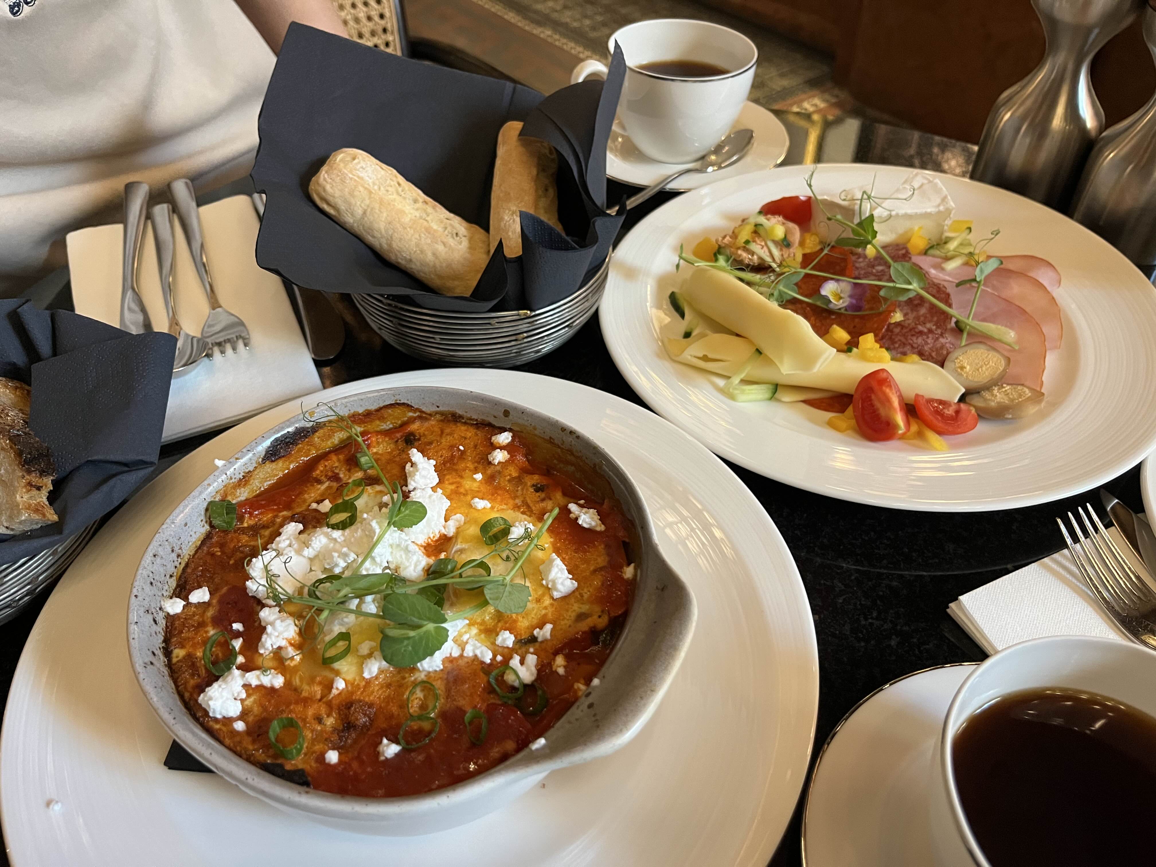 이곳에서는 뷔페식도 있었고 그냥 자리에 앉아서 주문하는 형식으로도 아침식사가 진행되고 있었는데 우리는 간단하게 먹을 생각으로 자리에서 주문하기로 했다. 남편은 샥슈카(에그인헬)를 주문했고, 나는 각족 치즈와 야채, 베이컨이 있는 플레이트를 시켜보았다. 내가 시킨 음식은 그냥 애피타이저처럼 요기만 할 수 있는 정도의 음식들이었고, 남편의 샥슈카는 맛이 꽤 괜찮았다. 추운 아침 따뜻하게 속을 채울 만했다.