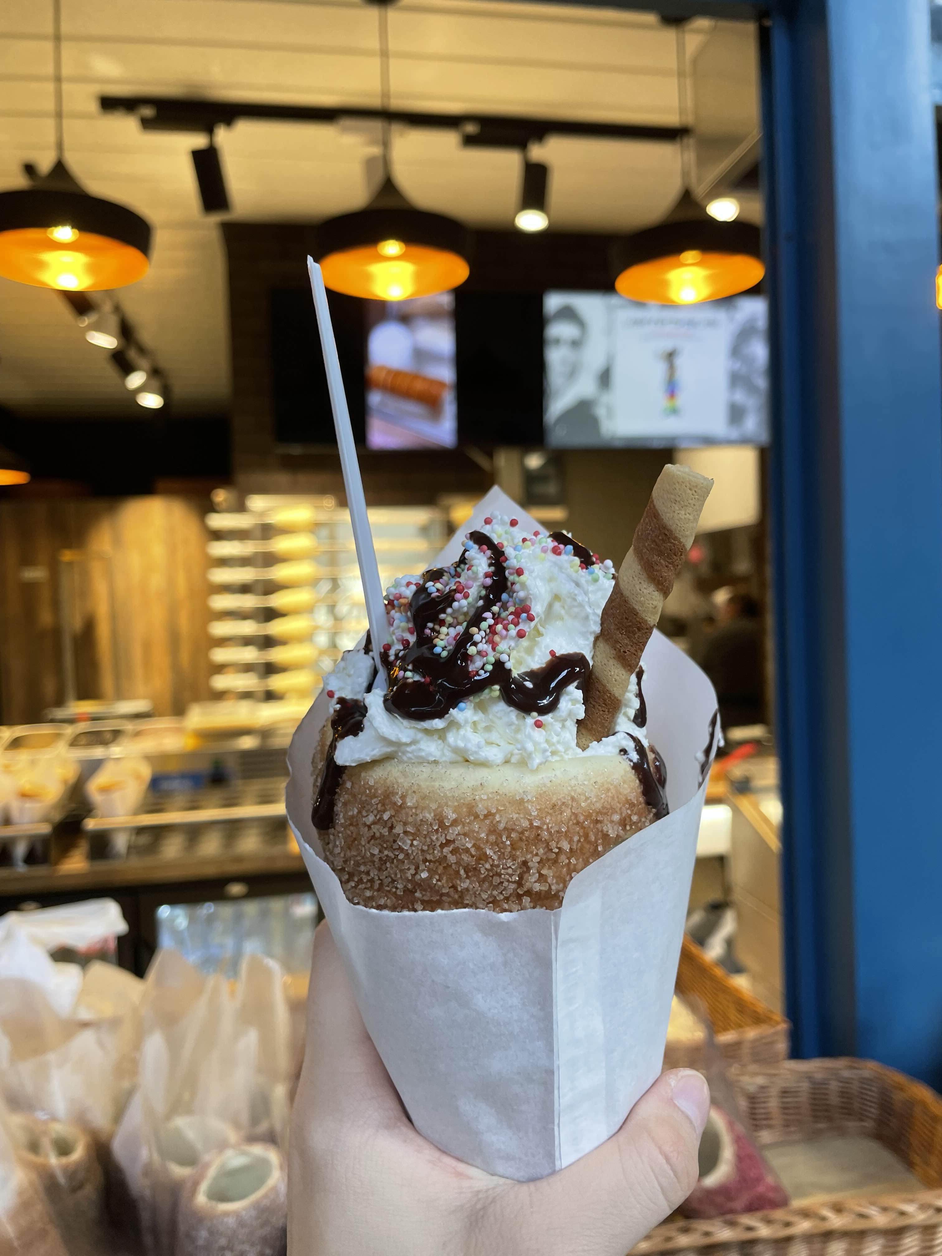 총 3000ft (한화 약 11,600원) 정도 된다. 간식치고는 가격대가 생각한 것보단 비쌌지만 우리나라 도넛츠나 조각케이크 정도라고 생각했다. 받아 본 굴뚝빵은 생각보다 사이즈가 꽤 커서 두 개 시켰으면 먹다 버렸을 것 같았다. 휘핑크림과 초콜릿 시럽이 꽤나 느끼했기 때문이다.