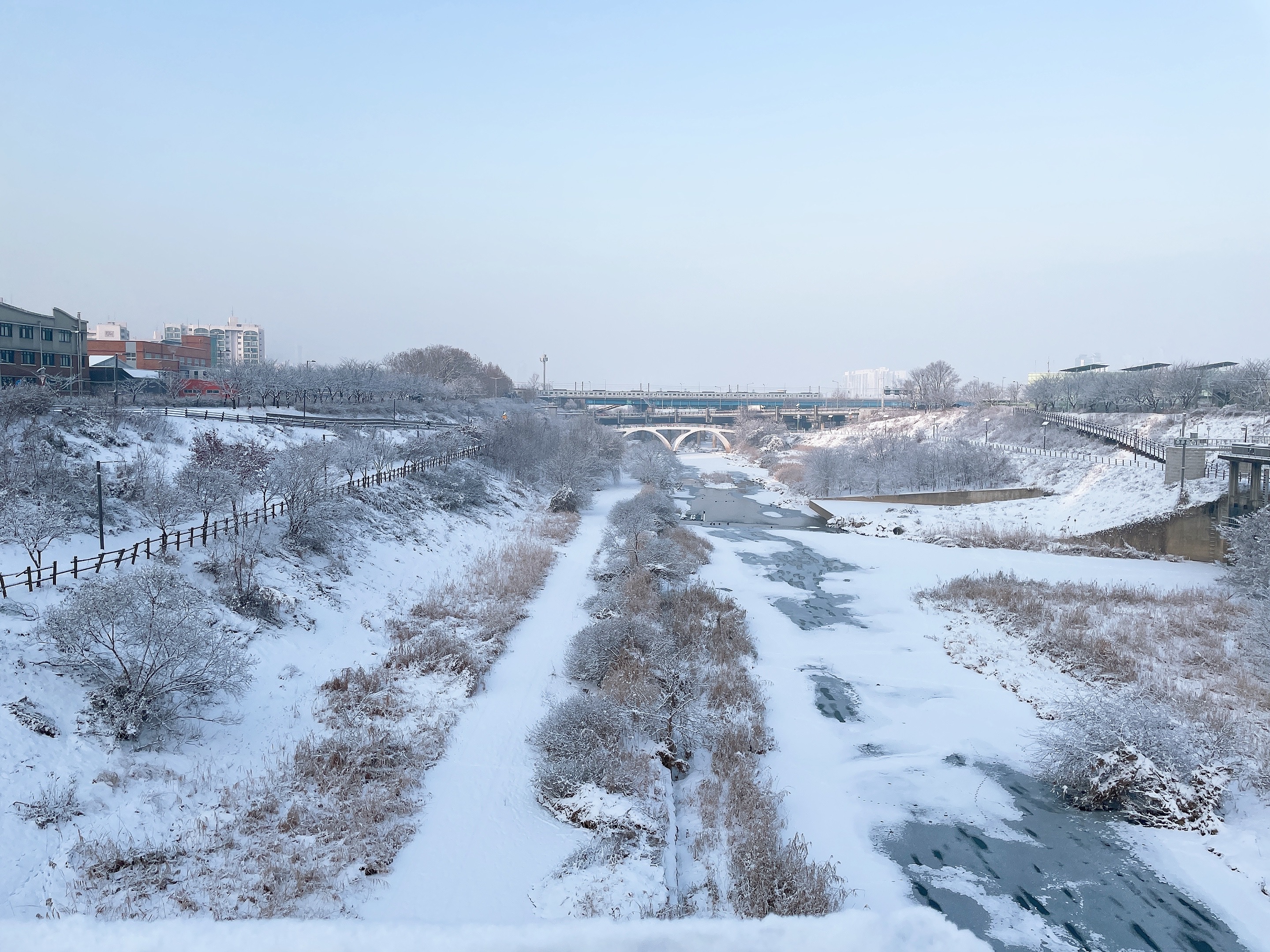 하지만 초록만 예쁜 건 또 아니다. 한 겨울에도 나름의 풍경이 있다. 한 겨울 눈이 왔을 땐 주변이 온통 하얀색이었다. 게다가 아침 일찍 9시쯤 가다보니, 아직 사람들의 발길이 닿지 않아 새 눈이 온전하게 남아있었다. 그 눈을 밞으며 뽀드득 소리를 들으면, 자연스레 힐링이 되는 기분이다. 어릴 적 아파트 마당에 함박눈이 오면 동생이랑 나가서 눈사람 만들고, 눈 싸움하는 그런 느낌이 든다. 나이 삼십 먹고 눈 오면 그런 생각한다는 것에 누구는 아직도 애 같다는 소릴 할 수도 있다. 군대 갔다 온 사람은 눈보고 하늘에서 쓰레기가 내린다고 한다고 하니까 말이다. 하지만, 난 현역으로 가지 않아서인지 아직 눈에 대한 이상이 조금은 남아있는 것 같다.
