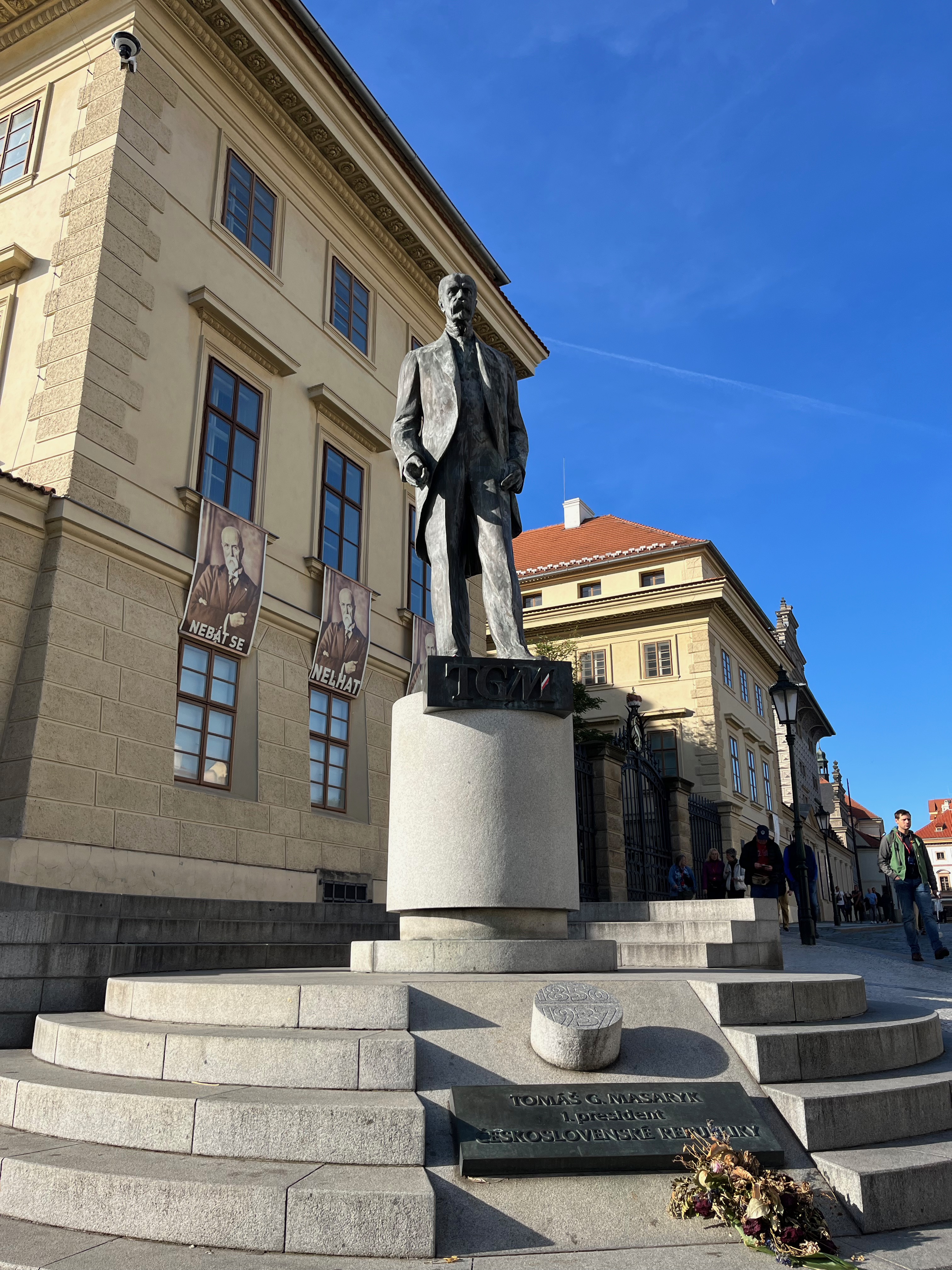 기억이 가물가물하지만 이전 대통령 중에 가장 자애로운 대통령이었는데 이 분이 죽을 때 동상하나를 세우기로 했는데 눈동자는 만들지 말아 달라고 했단다. 그 이유는 눈동자가 어느 한쪽만을 응시하고 있지 않고 체코 전 지역을 두루두루 보겠다는 의미라고 한다. 죽을 때까지 체코사랑 나라사랑.
