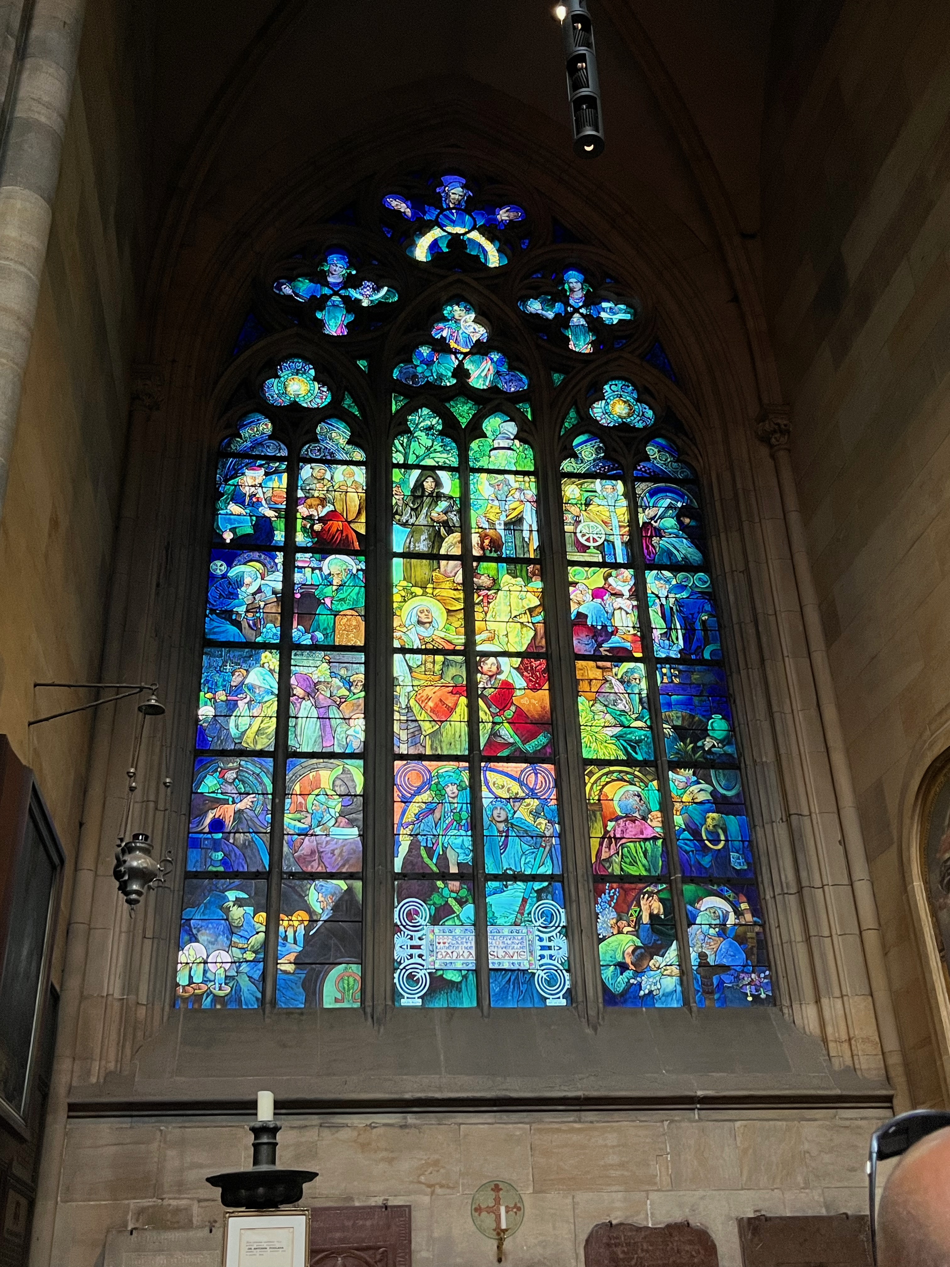 이 안에서 봤던 것 중 제일 인상 깊었던 건 바로 이 그림. 알폰소 무하의 작품이었다. 보자마자 색감이 예뻐서 한참 봤는데 이 그림 안에 숨겨진 이야기를 들으니까 더 재미있었다. 뭔가 성당내부에 뚜렷한 종교적 목적으로 만들어진 그림이 아니라 그저 상업적 광고를 목적으로 그려진 그림이라고 했다. 그래서 자세히 보면 아래쪽에 bank 어쩌고.. 이렇게 쓰여있다고 한다.