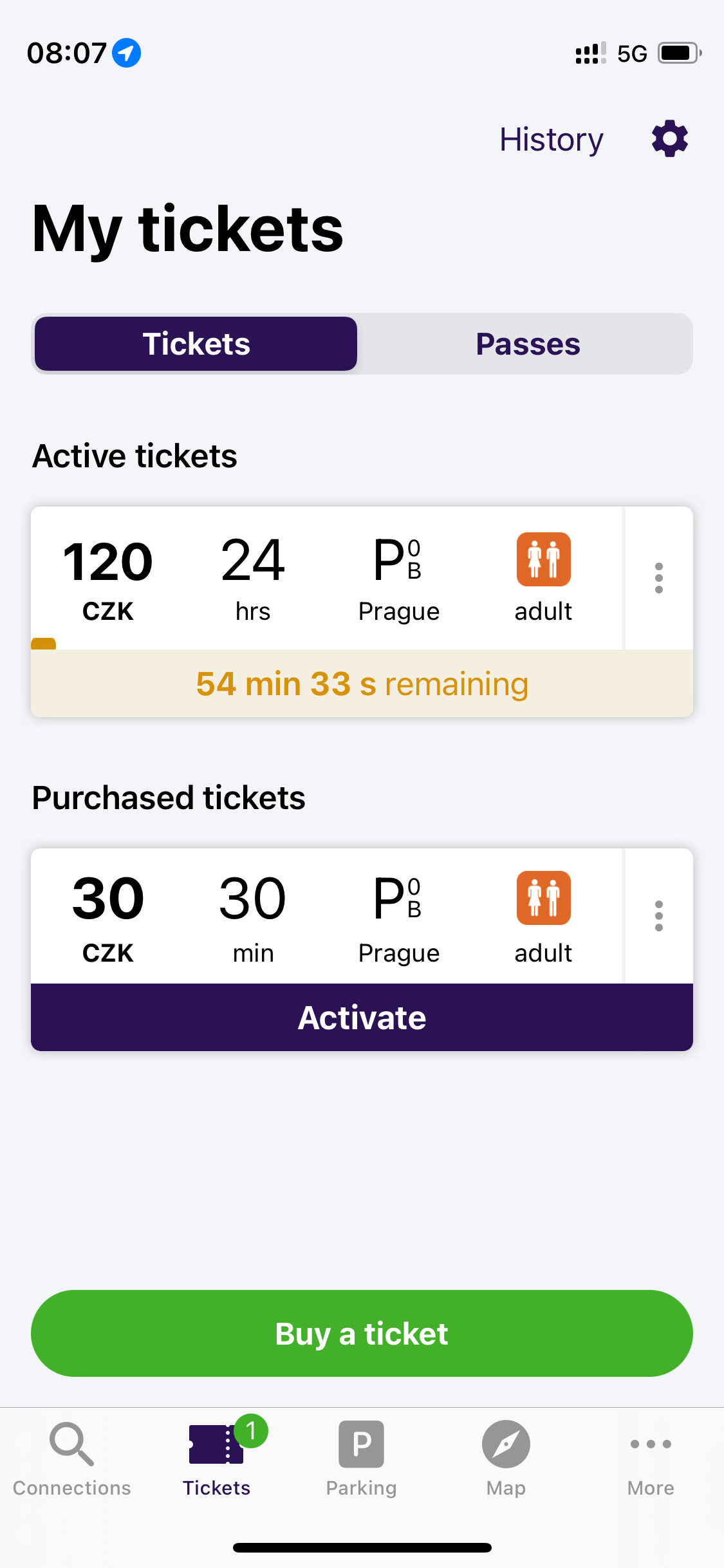 투어 내용 중에 대중교통을 이용하는 코스가 있었기 때문에 교통권이 필요했고 우리는 남편이 미리 찾아본 프라하 교통권 어플을 다운로드하여 준비해 두었다. 어플은 남편과 나 각각 다운받아 교통권 구매 후 사용했다.