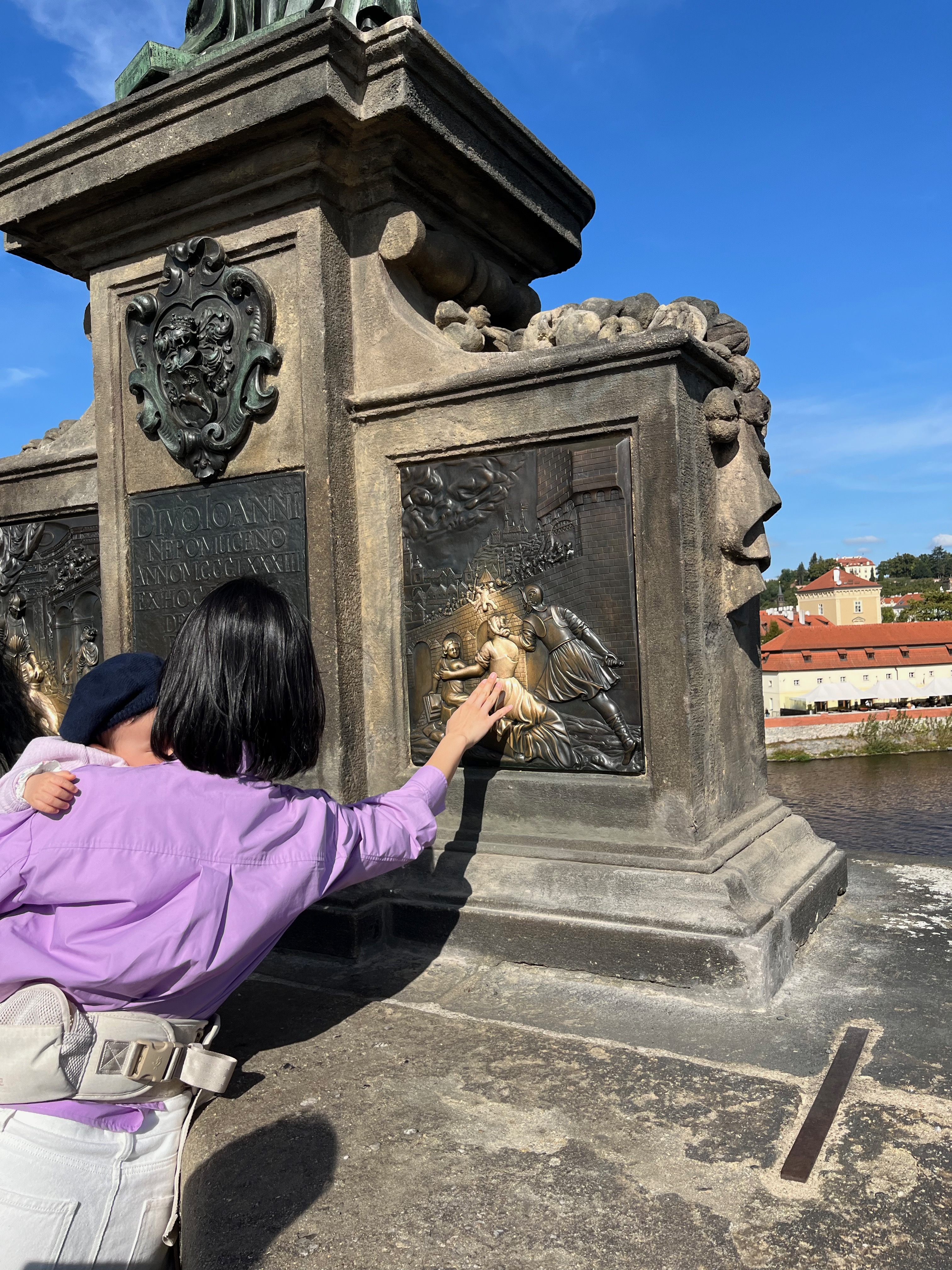 트램을 타고 다시 시내로 내려와 가장 관광객이 많은 거리인 까를교에서 마지막 투어를 진행했다. 이 다리의 중앙에 있는 얀 신부, 아까 혀가 잘리고 사지가 토막 나 강에 던져진 그의 동상 앞에는 각 나라의 가이드들과 관광객들로 줄지어 있었다. 가이드님의 설명으로는 이 동상의 한 군데만 마치 조명을 쏜 듯한 황금빛이 나는 곳이 있는데 저 인물이 바로 소피아라고 한다. 저 소피아를 만지면 다음에 또 프라하에 온다고 하여서 사람들이 하도 만지다 보니 저렇게 색이 바랬다고 한다. 우리 개인이 그냥 한번 살짝 만졌을 뿐인 건데, 그 작은 사람들의 손길이 쌓이고 쌓여 색이 변하게 되기까지는 얼마나 많은 사람들이 스쳐간 걸까? 우리나라 돌하르방 코 같은 느낌이겠지만 새삼 신기하다. 저걸 만질 때, 아기는 잠이 들었고 줄이 너무 길어서 남편은 차마 비집고 들어오지 못해서 나만 만졌다. 나만 다시 올 수 있는 거야??!!